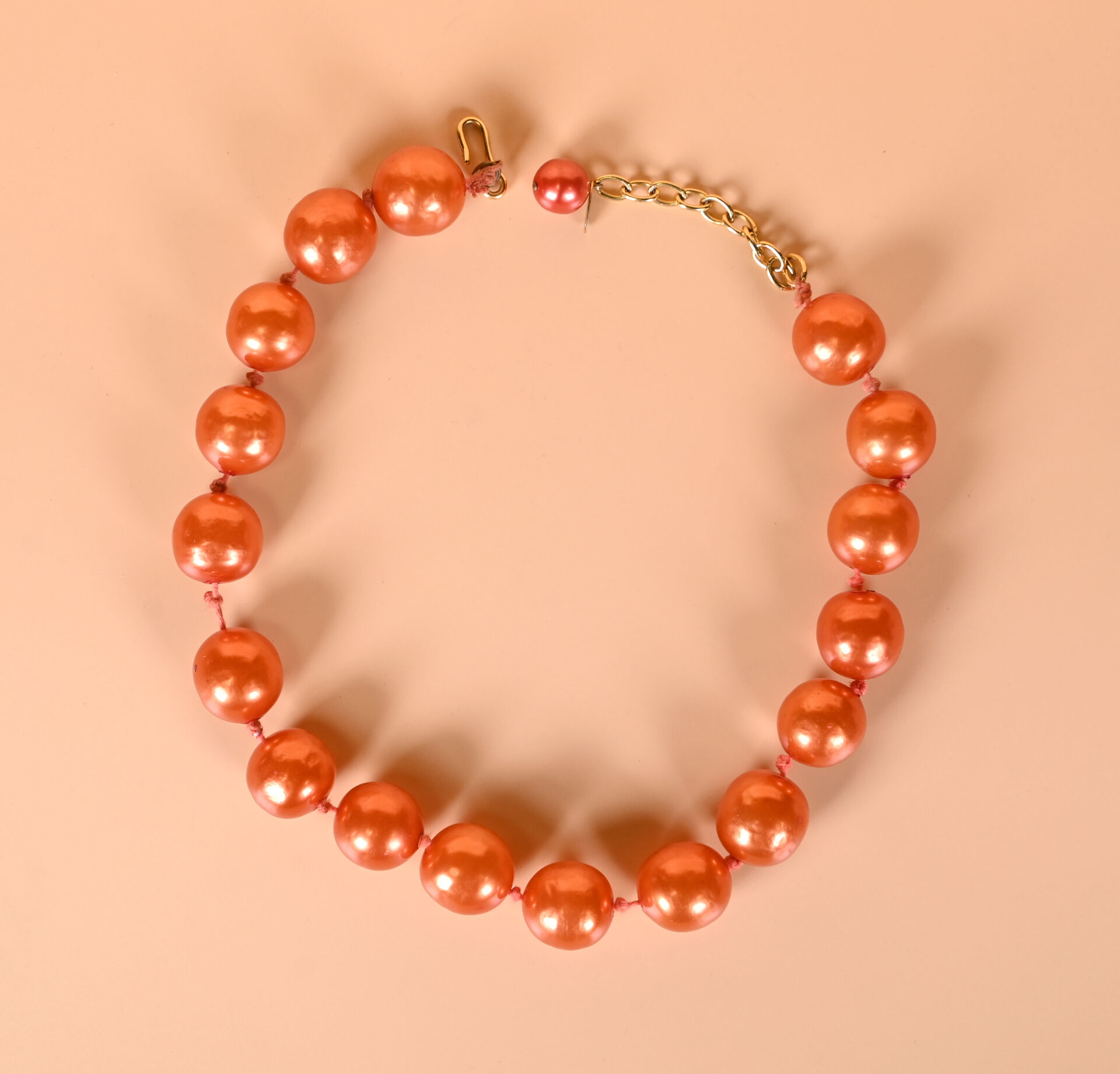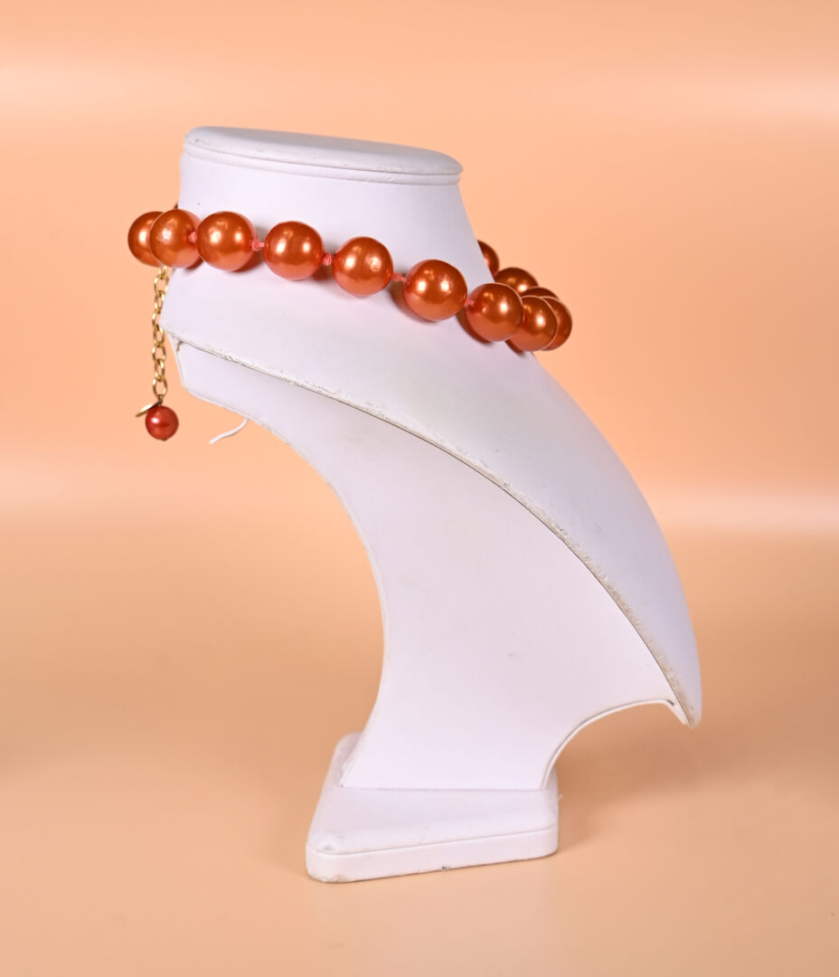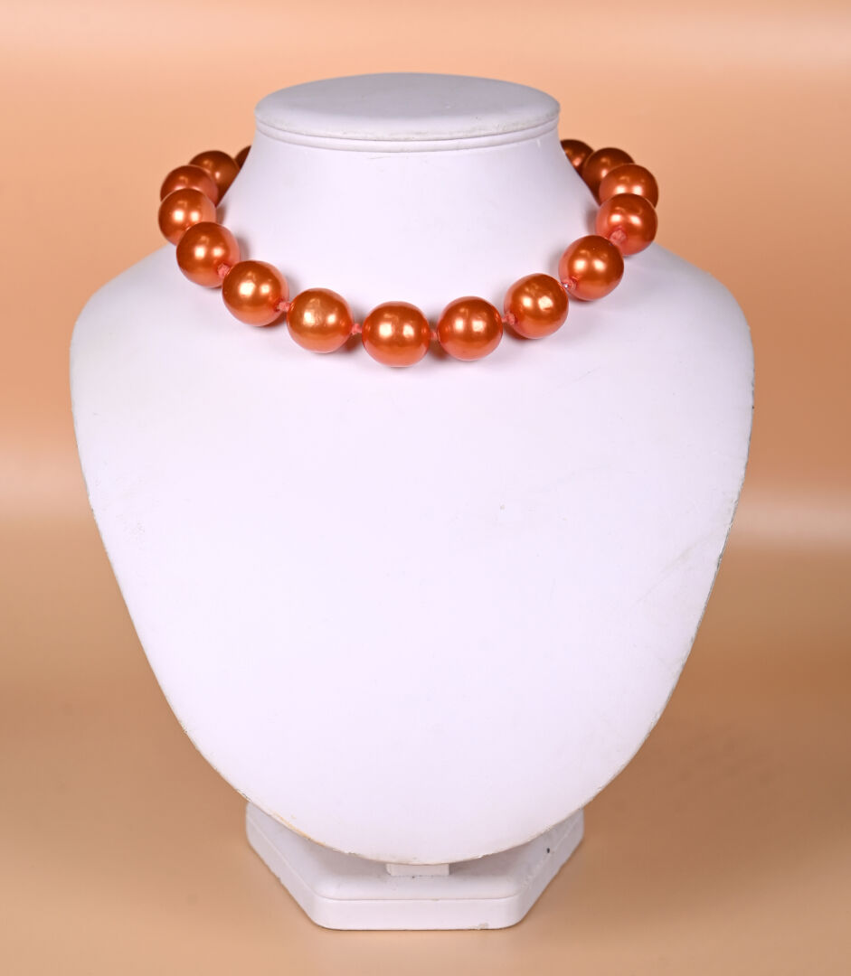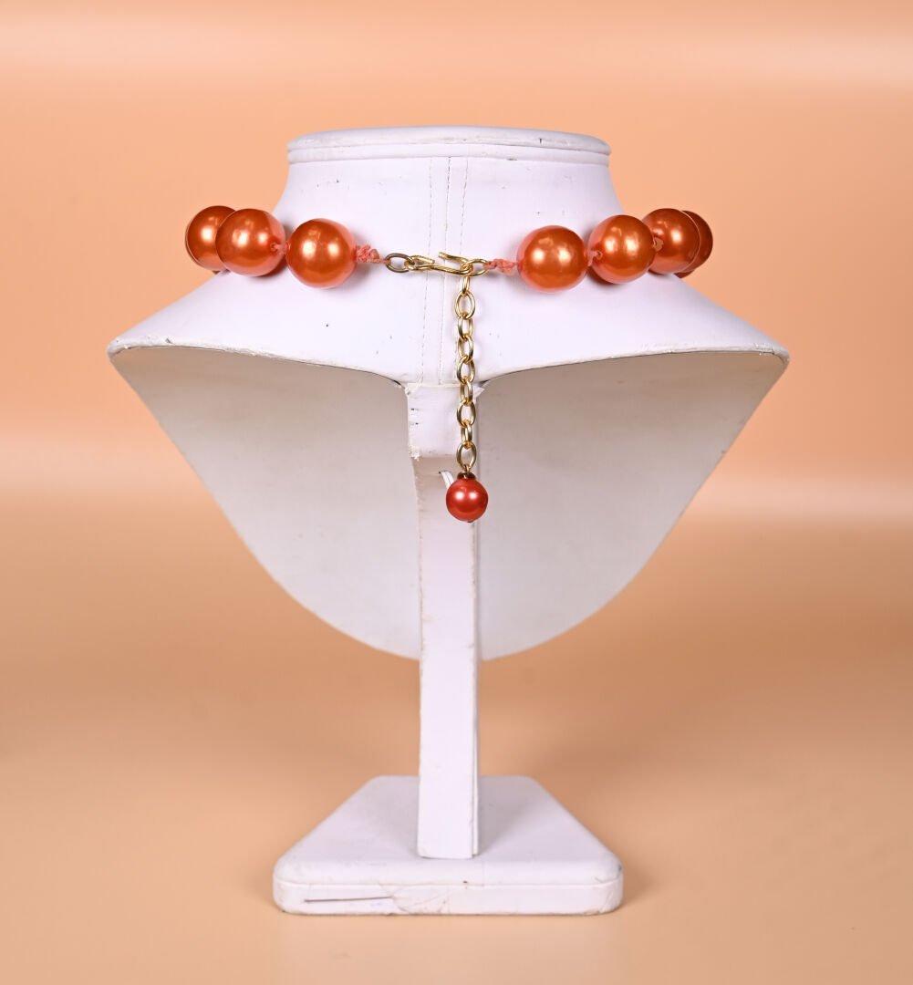 CHANEL et GRIPOIX ? Collier de perles de verre laquées cuivré. Marqué. 2CC5. Long. : 53 cm avec fermoir.