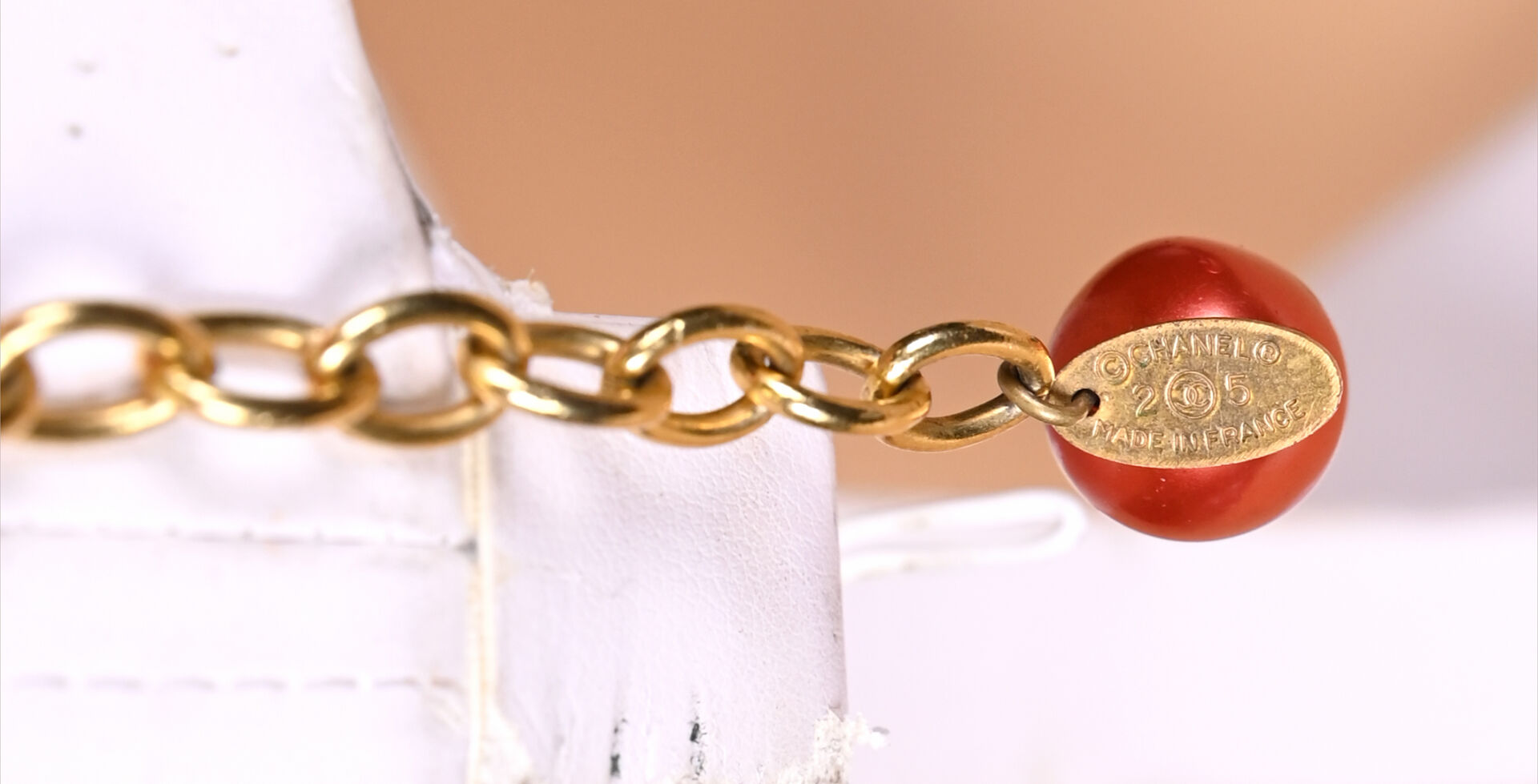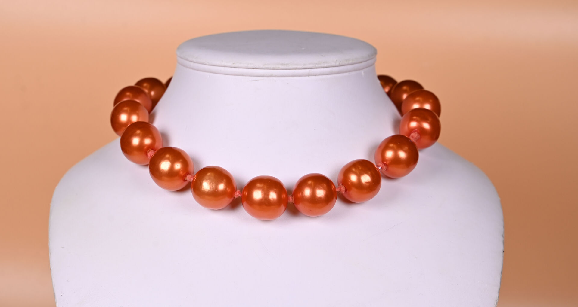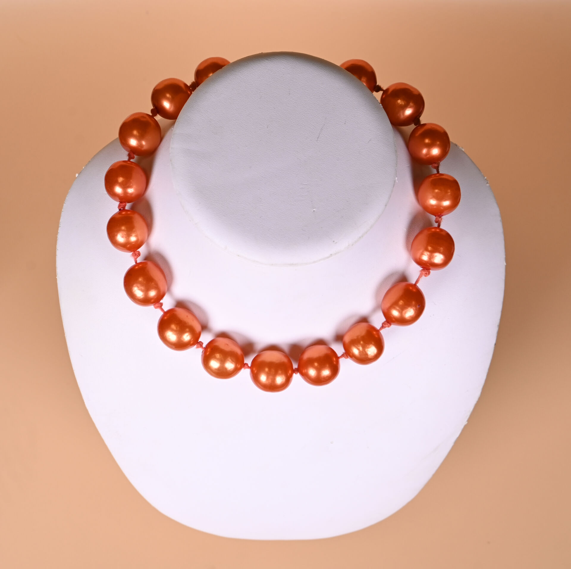 CHANEL et GRIPOIX ? Collier de perles de verre laquées cuivré. Marqué. 2CC5. Long. : 53 cm avec fermoir.