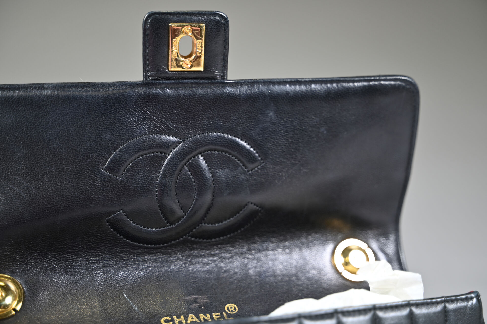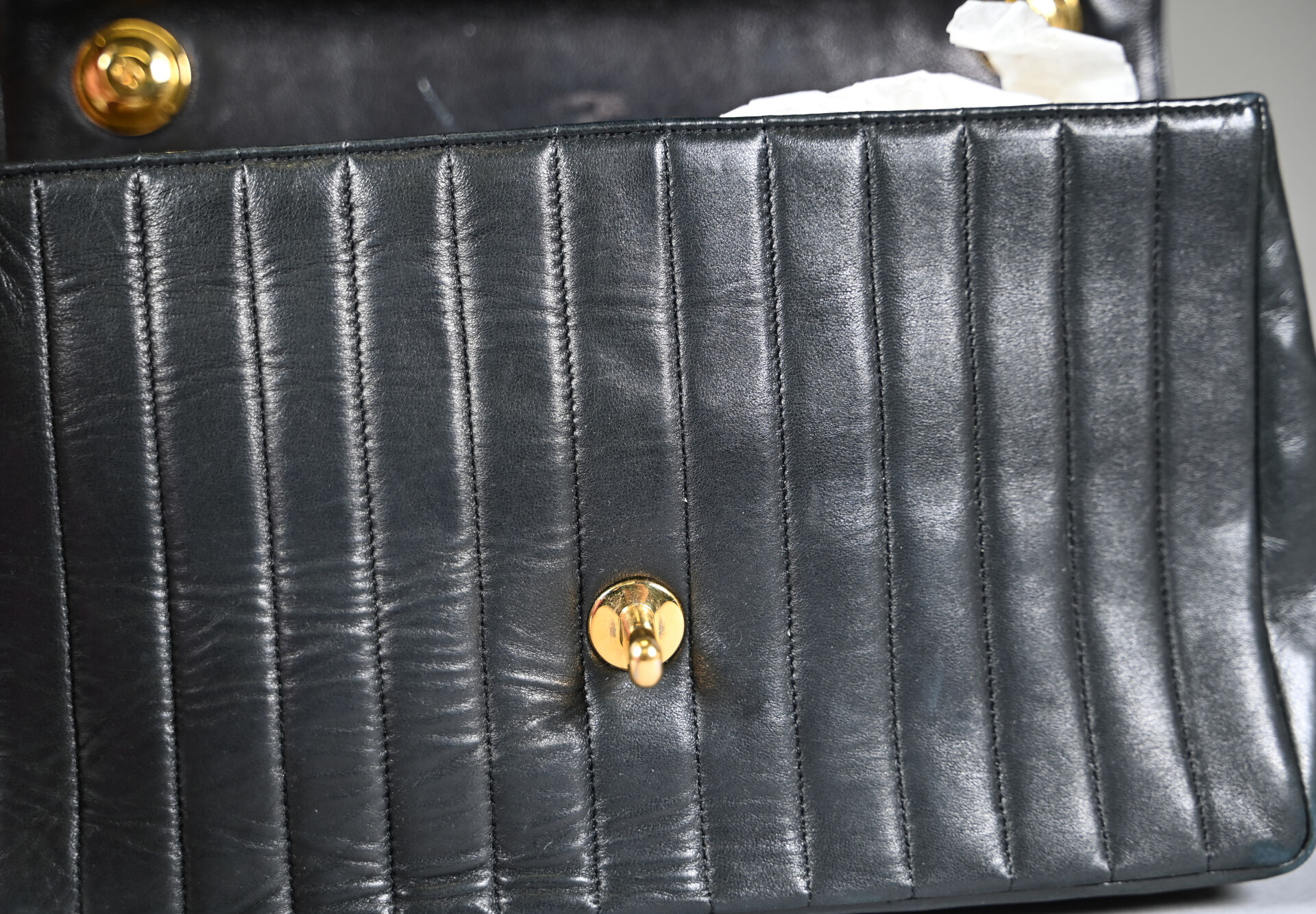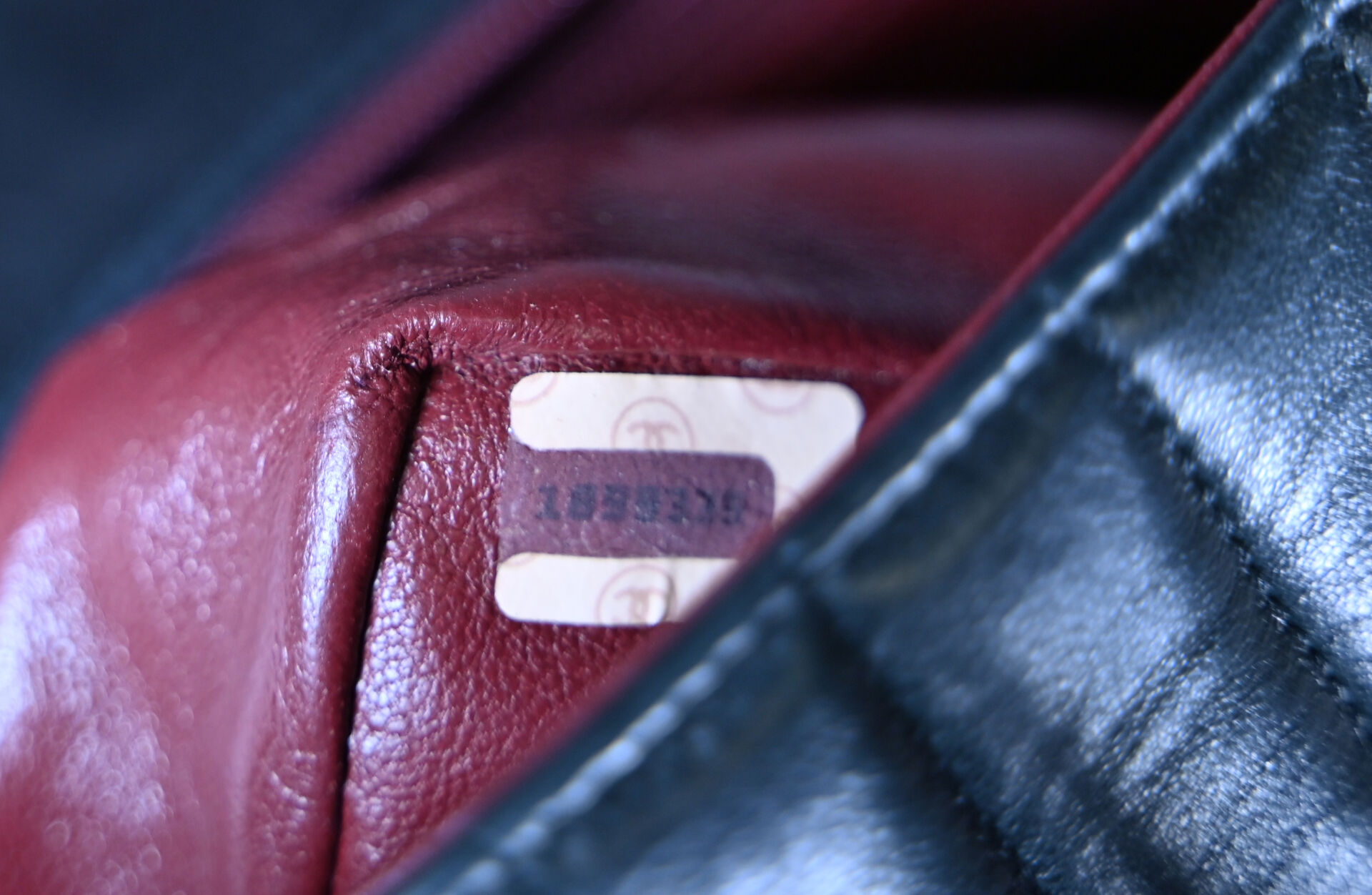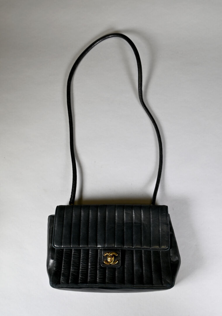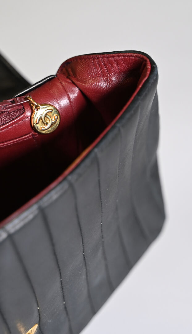 CHANEL Sac classique à rabat en agneau matelassé vertical noir Bijouterie en métal doré, doublure en agneau bordeaux, bandoulière en agneau noir. Bon état, quelques traces sur cuir, frottements aux angles. Circa 1990, dust bag, présence de l’étiquette d’authenticité. Dimensions 25x16x7 cm environ.