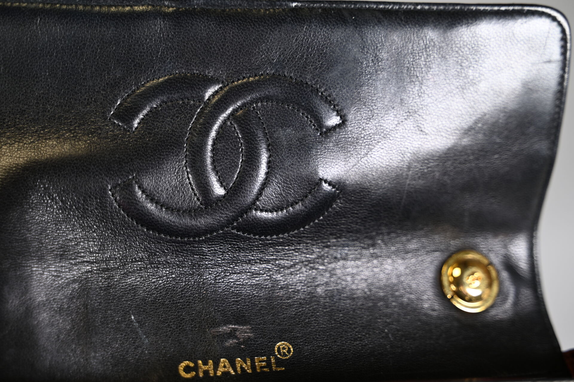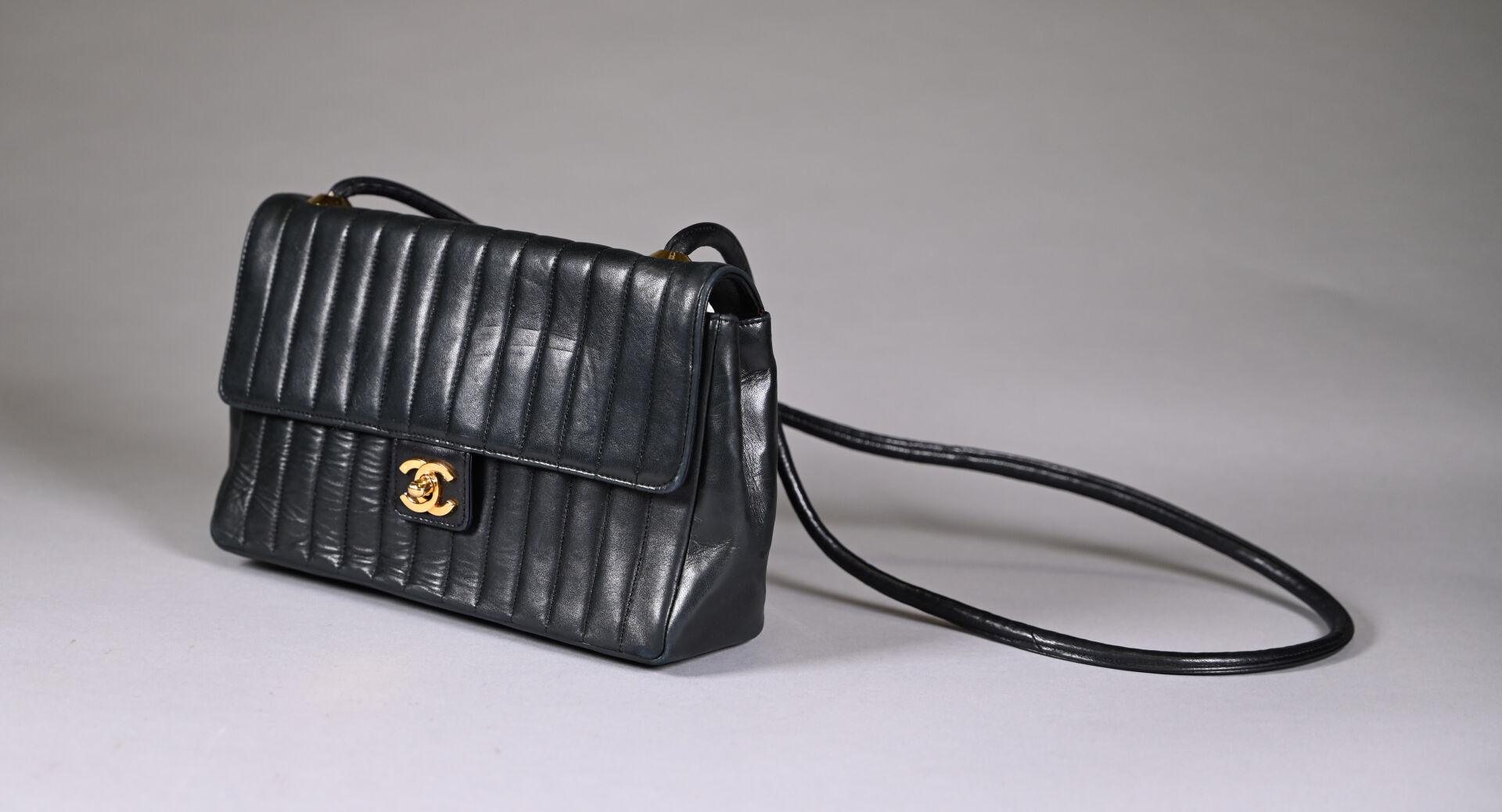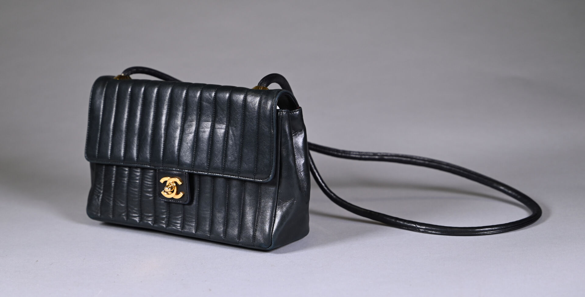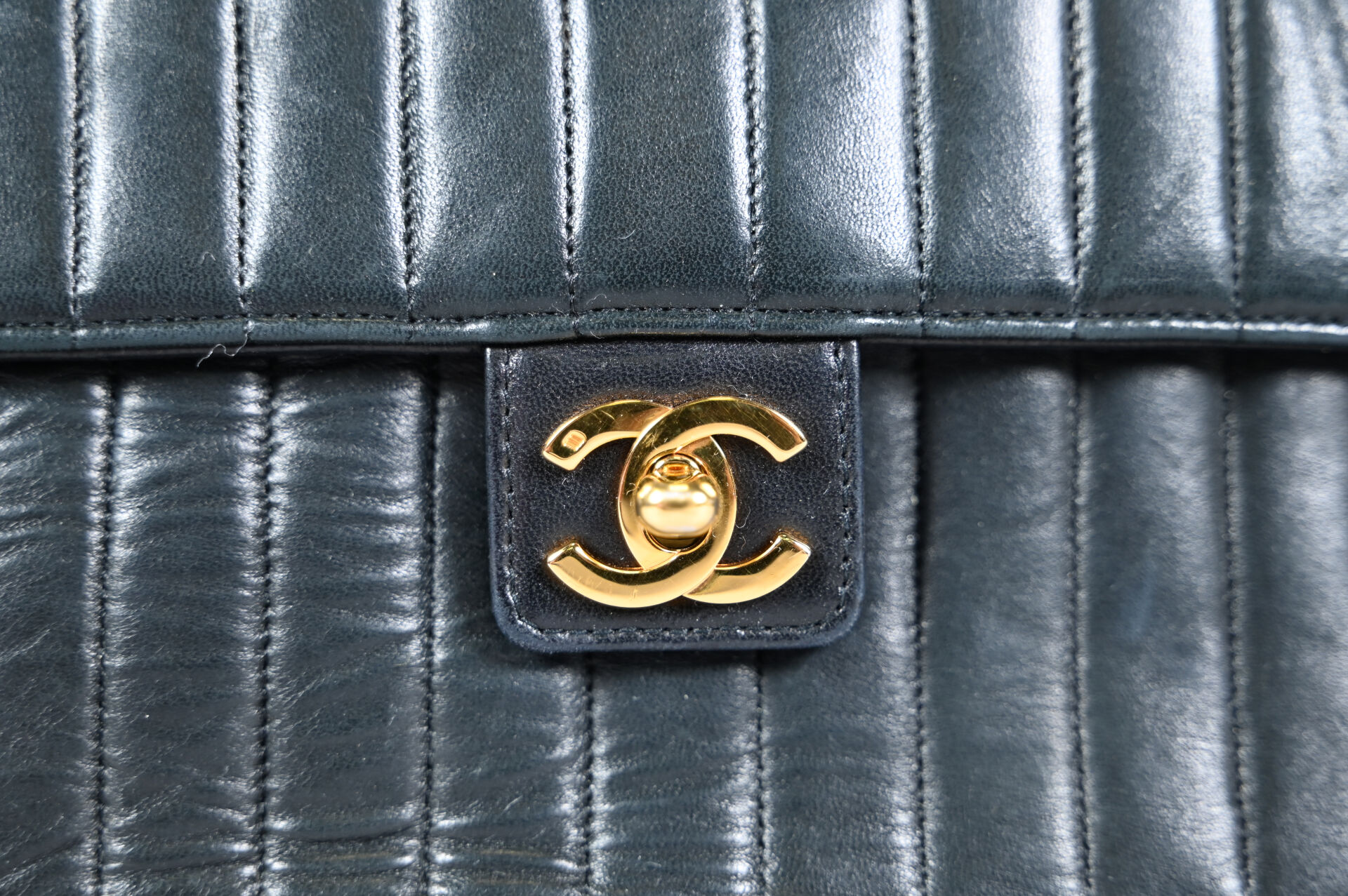 CHANEL Sac classique à rabat en agneau matelassé vertical noir Bijouterie en métal doré, doublure en agneau bordeaux, bandoulière en agneau noir. Bon état, quelques traces sur cuir, frottements aux angles. Circa 1990, dust bag, présence de l’étiquette d’authenticité. Dimensions 25x16x7 cm environ.