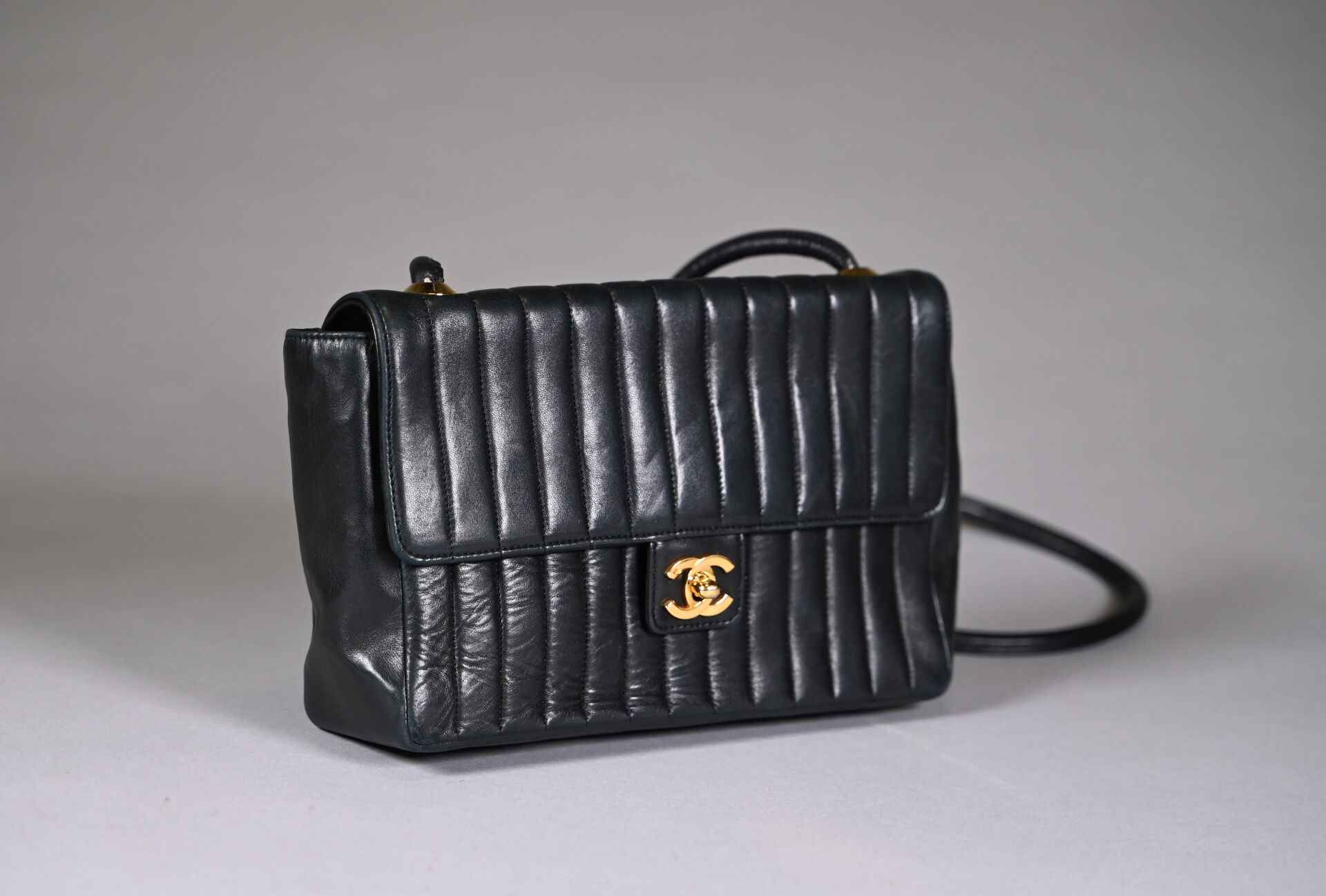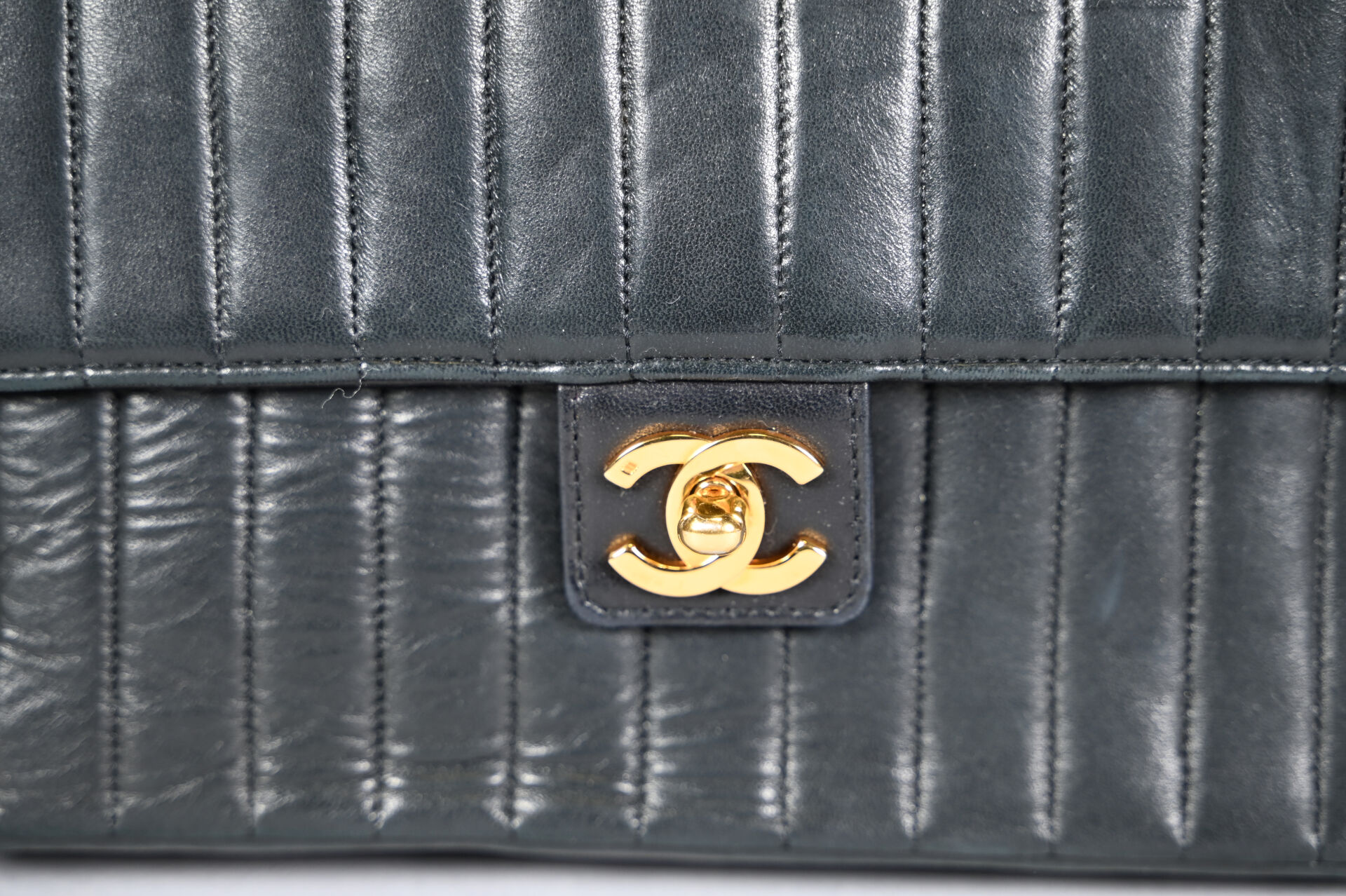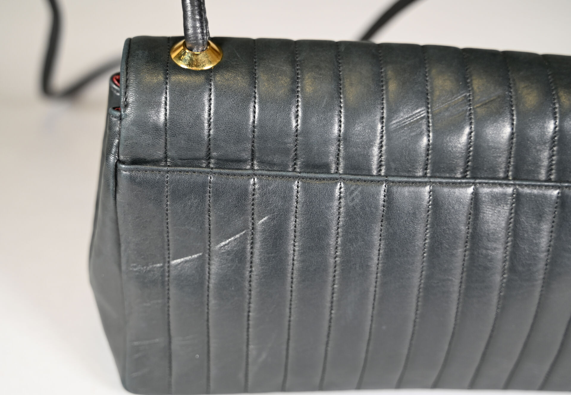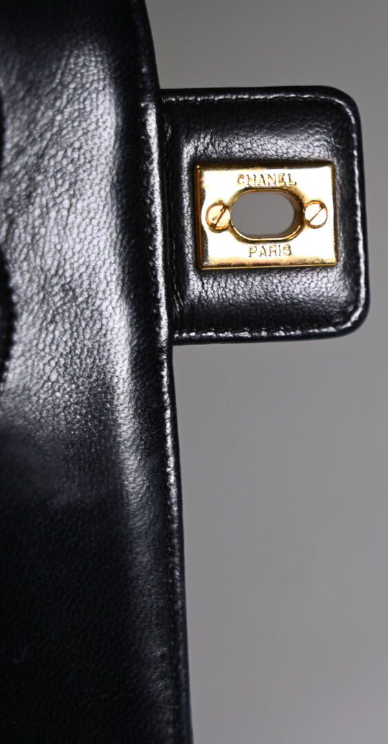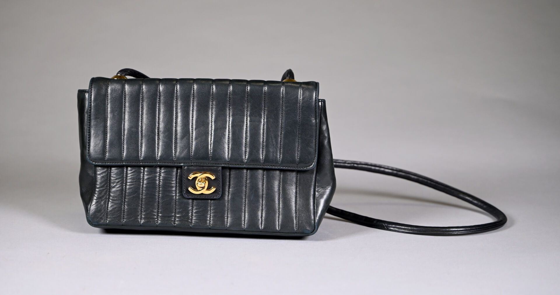 CHANEL Sac classique à rabat en agneau matelassé vertical noir Bijouterie en métal doré, doublure en agneau bordeaux, bandoulière en agneau noir. Bon état, quelques traces sur cuir, frottements aux angles. Circa 1990, dust bag, présence de l’étiquette d’authenticité. Dimensions 25x16x7 cm environ.