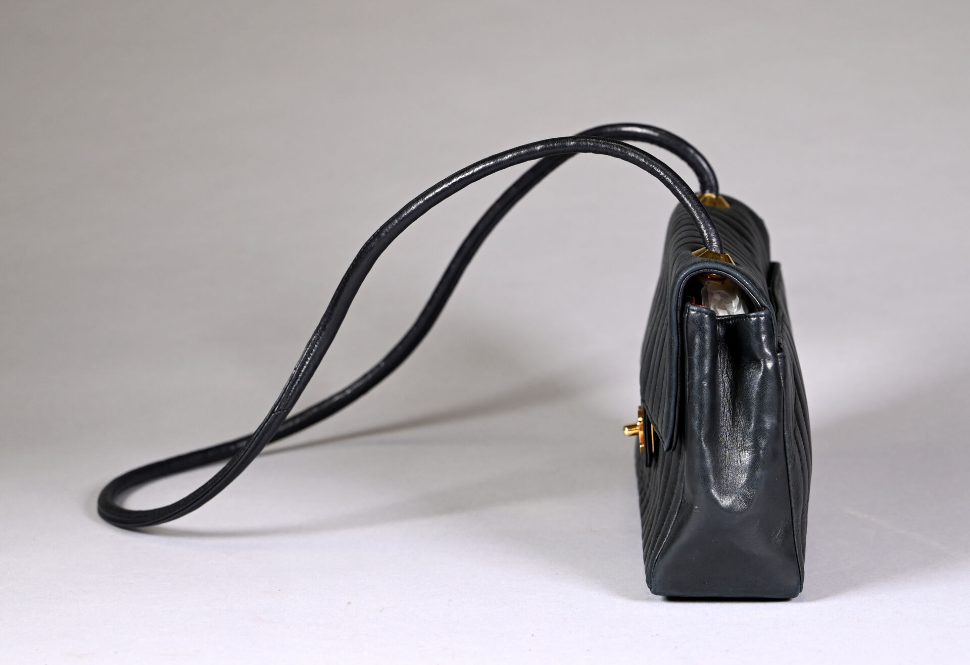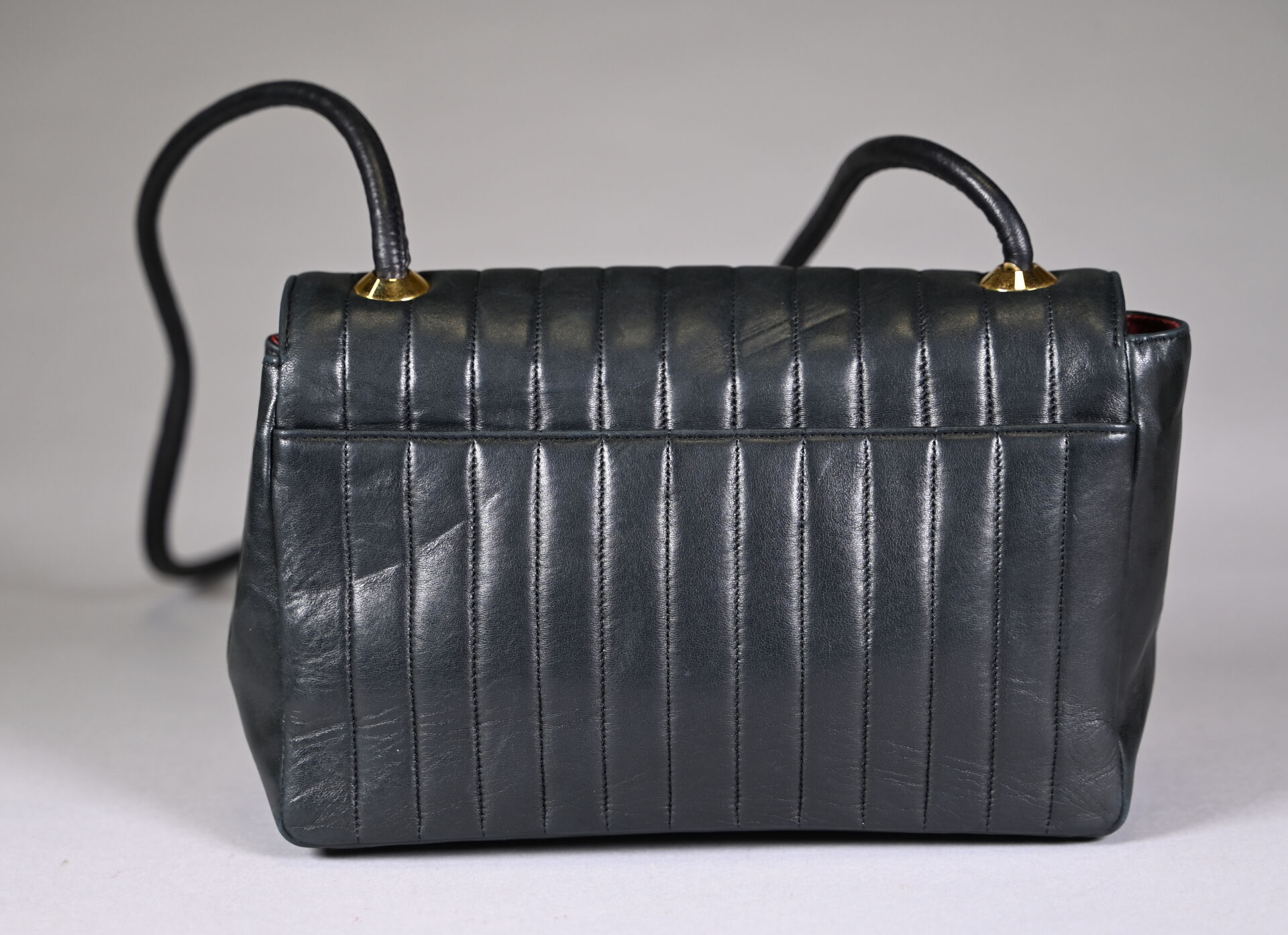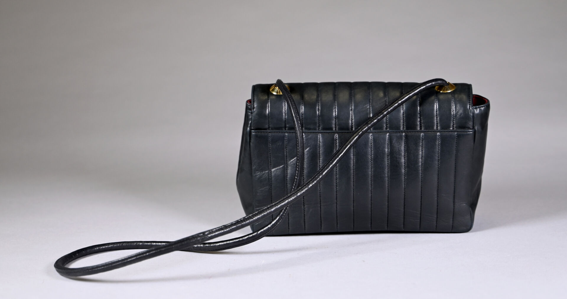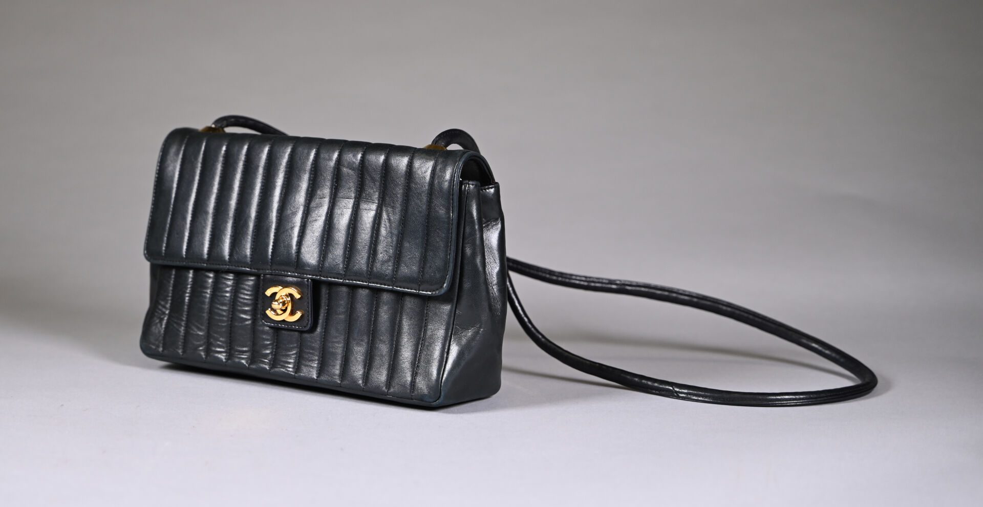 CHANEL Sac classique à rabat en agneau matelassé vertical noir Bijouterie en métal doré, doublure en agneau bordeaux, bandoulière en agneau noir. Bon état, quelques traces sur cuir, frottements aux angles. Circa 1990, dust bag, présence de l’étiquette d’authenticité. Dimensions 25x16x7 cm environ.