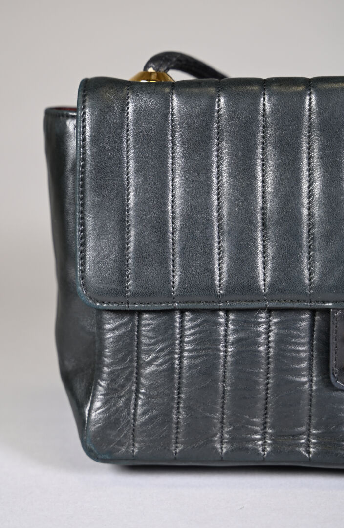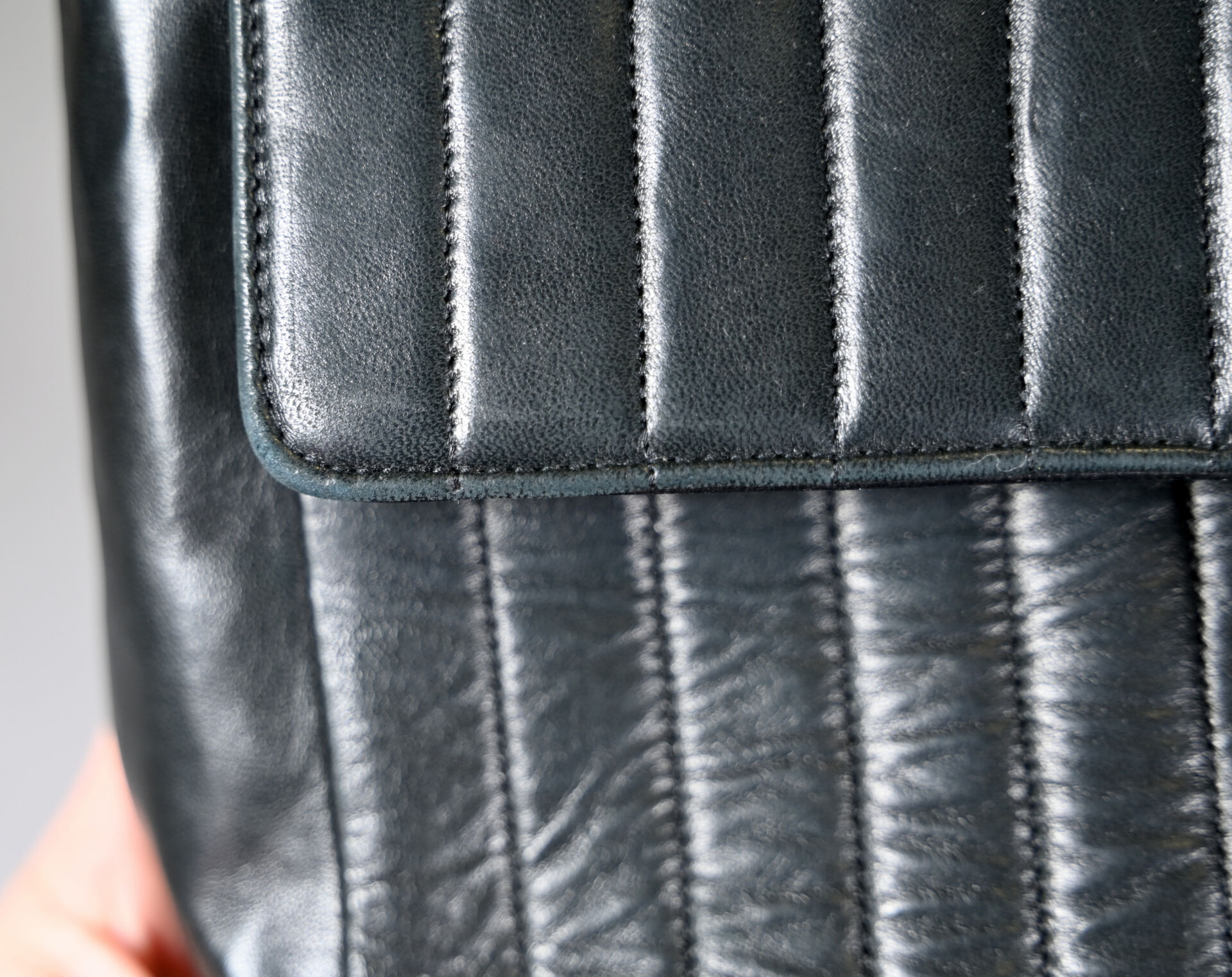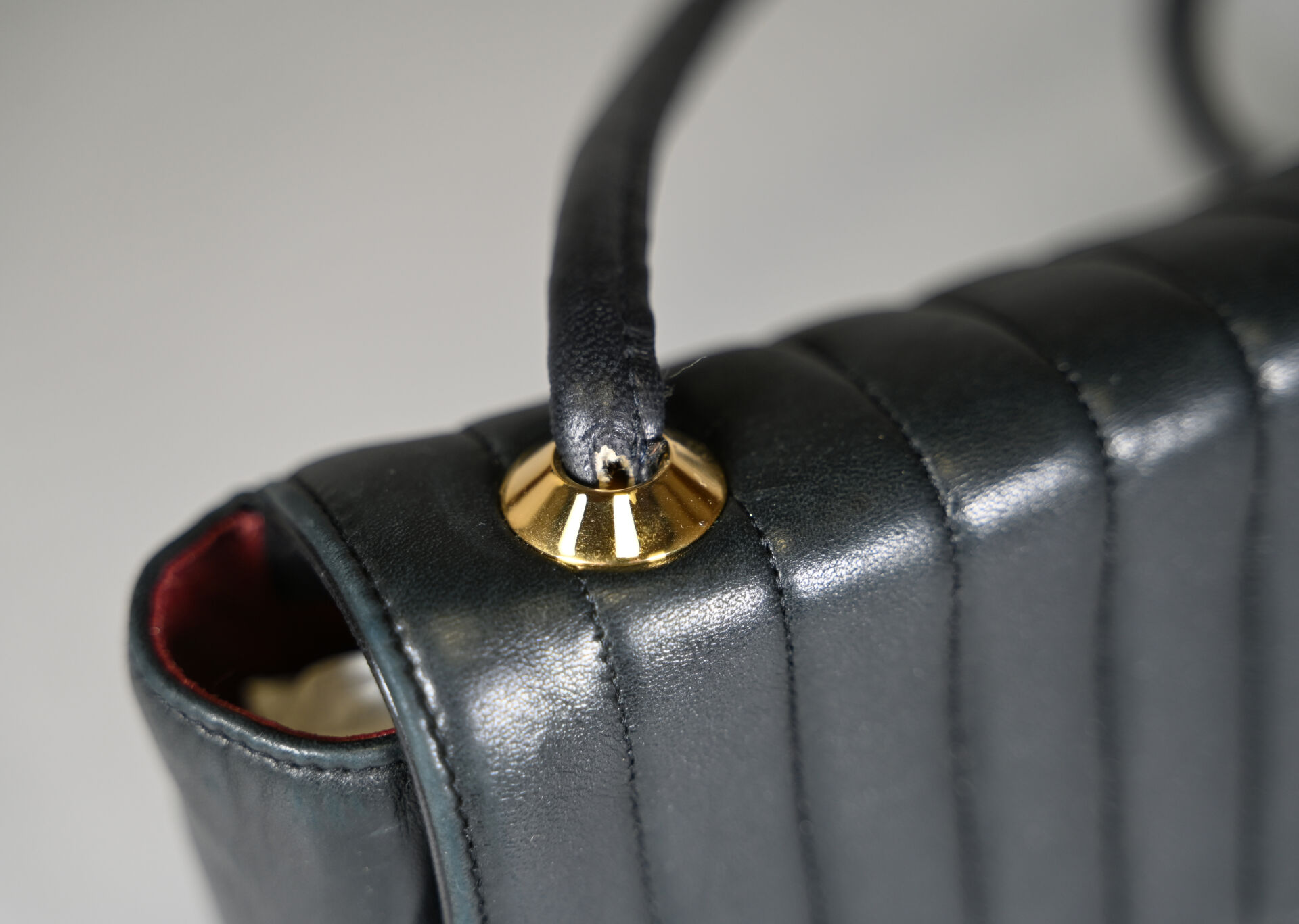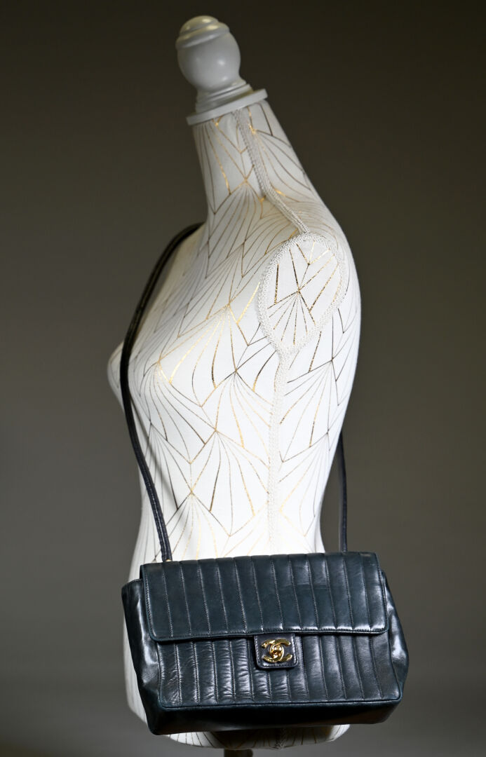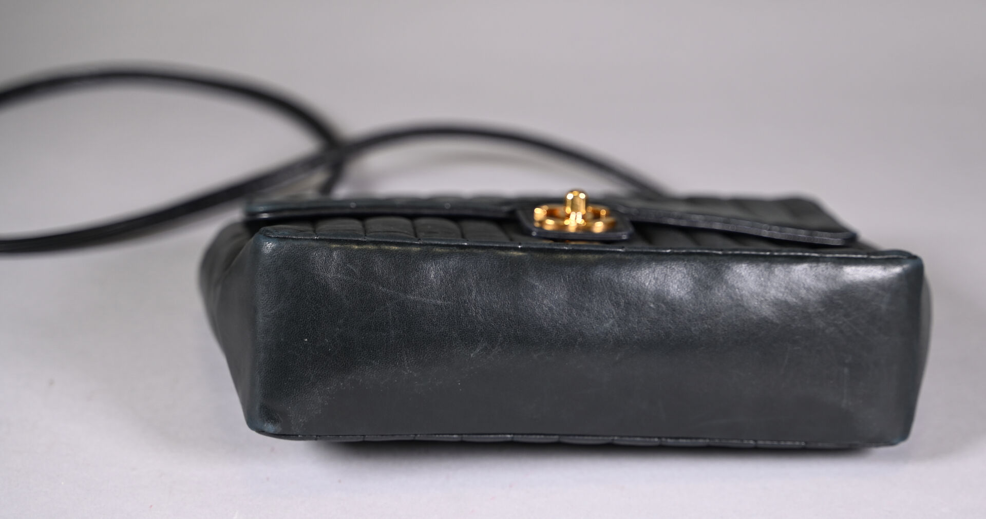 CHANEL Sac classique à rabat en agneau matelassé vertical noir Bijouterie en métal doré, doublure en agneau bordeaux, bandoulière en agneau noir. Bon état, quelques traces sur cuir, frottements aux angles. Circa 1990, dust bag, présence de l’étiquette d’authenticité. Dimensions 25x16x7 cm environ.