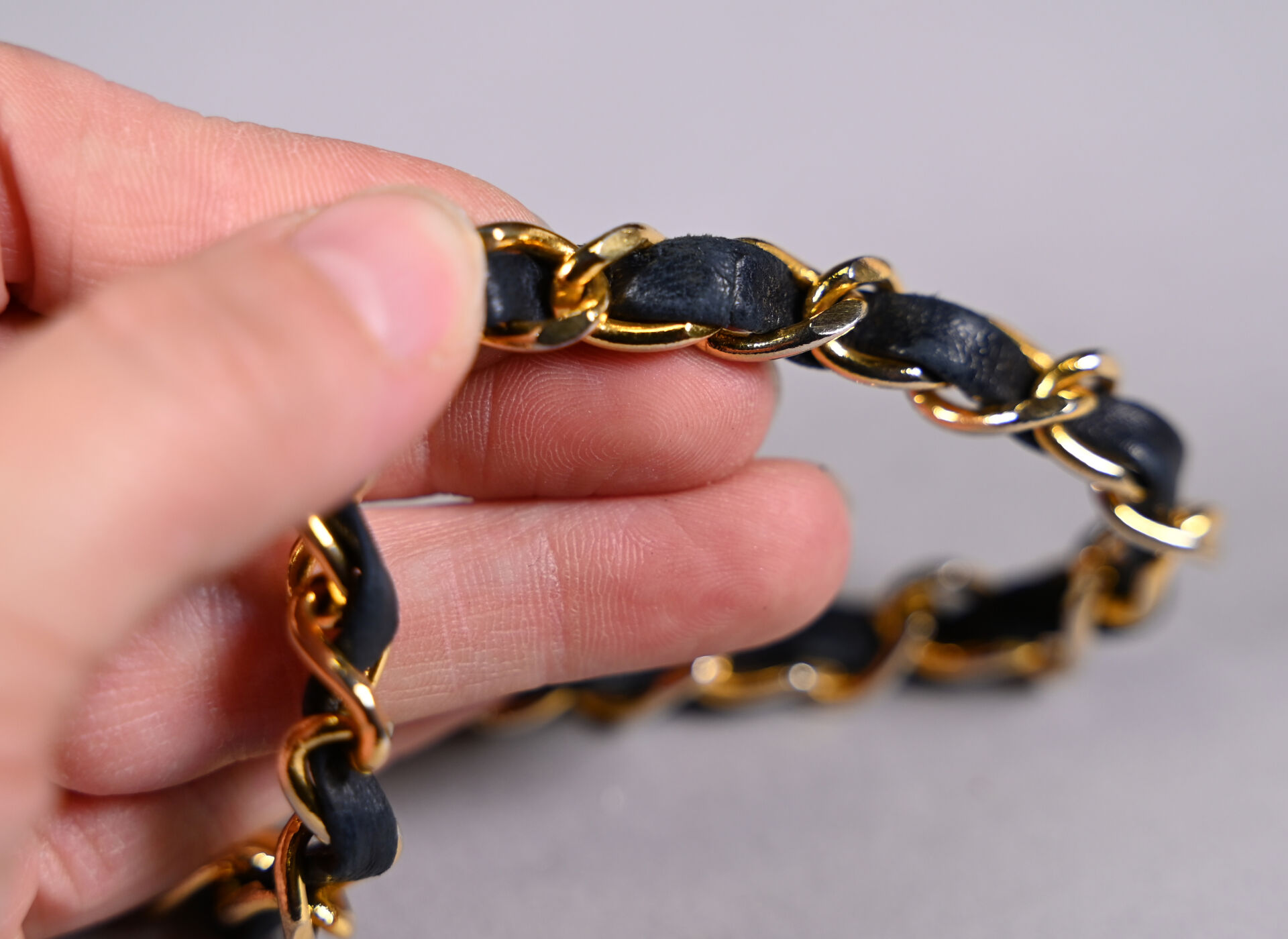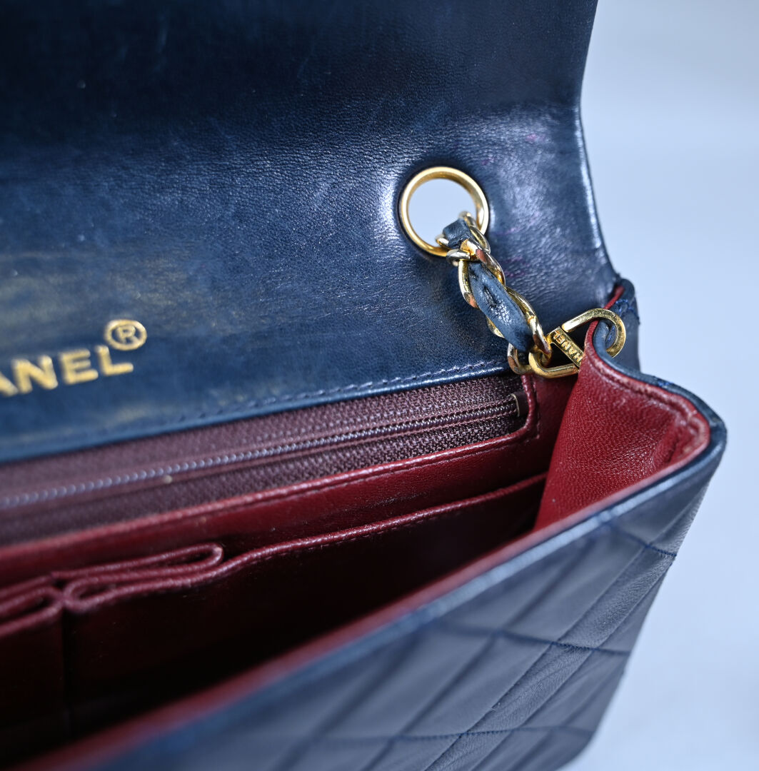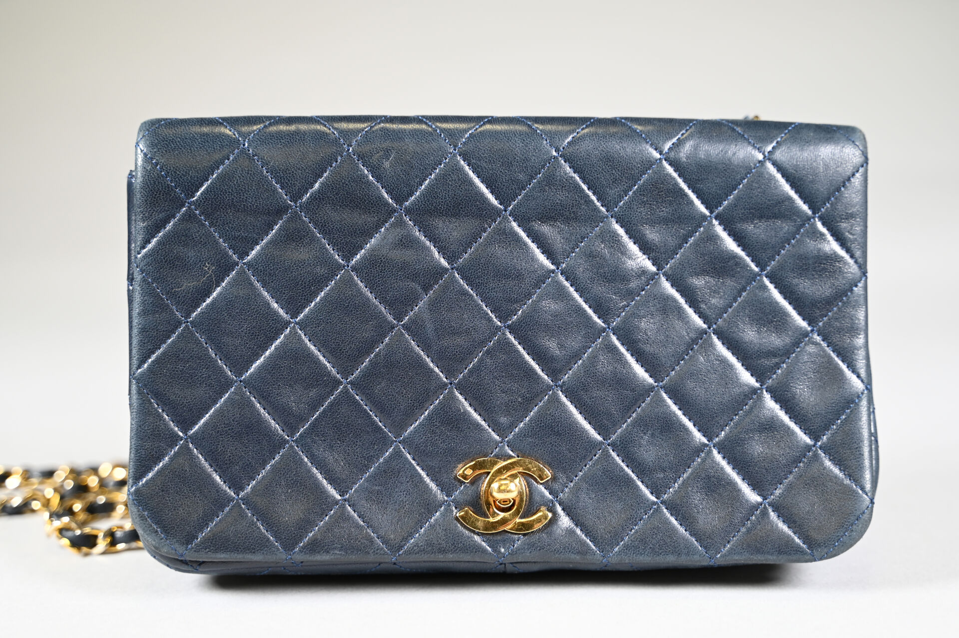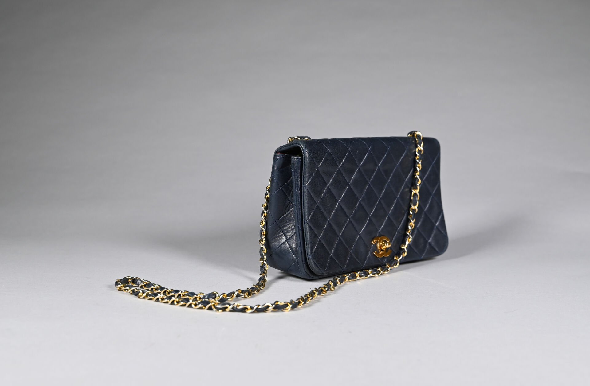 CHANEL Sac à rabat en agneau matelassé bleu nuit. Bijouterie en métal doré, doublure en agneau bordeaux, bandoulière chaine entrelacé d’agneau. Bon état, quelques traces sur cuir, bijouterie légèrement dédoré. Circa 1990, dust bag, présence de l’étiquette d’authenticité. Dimensions 23x13x7 cm environ
