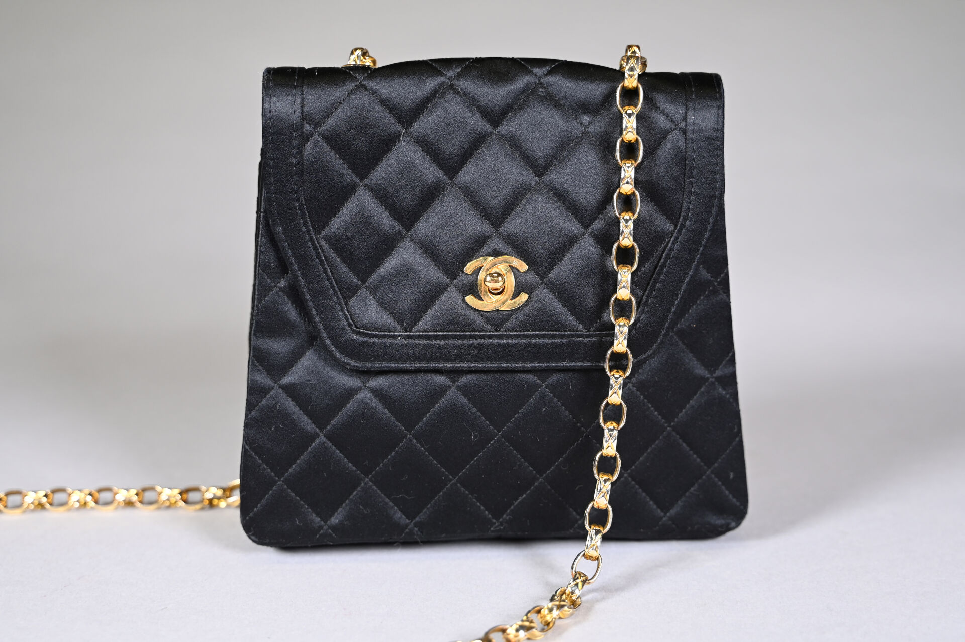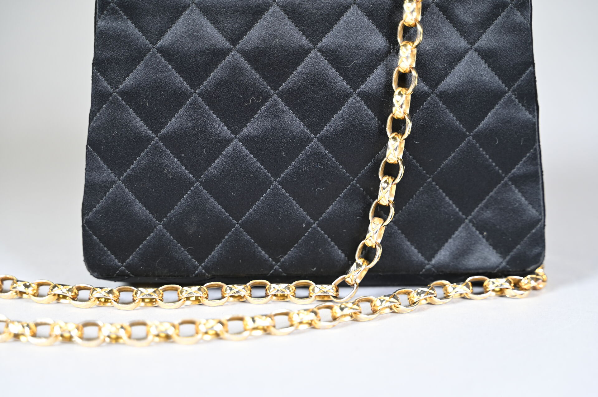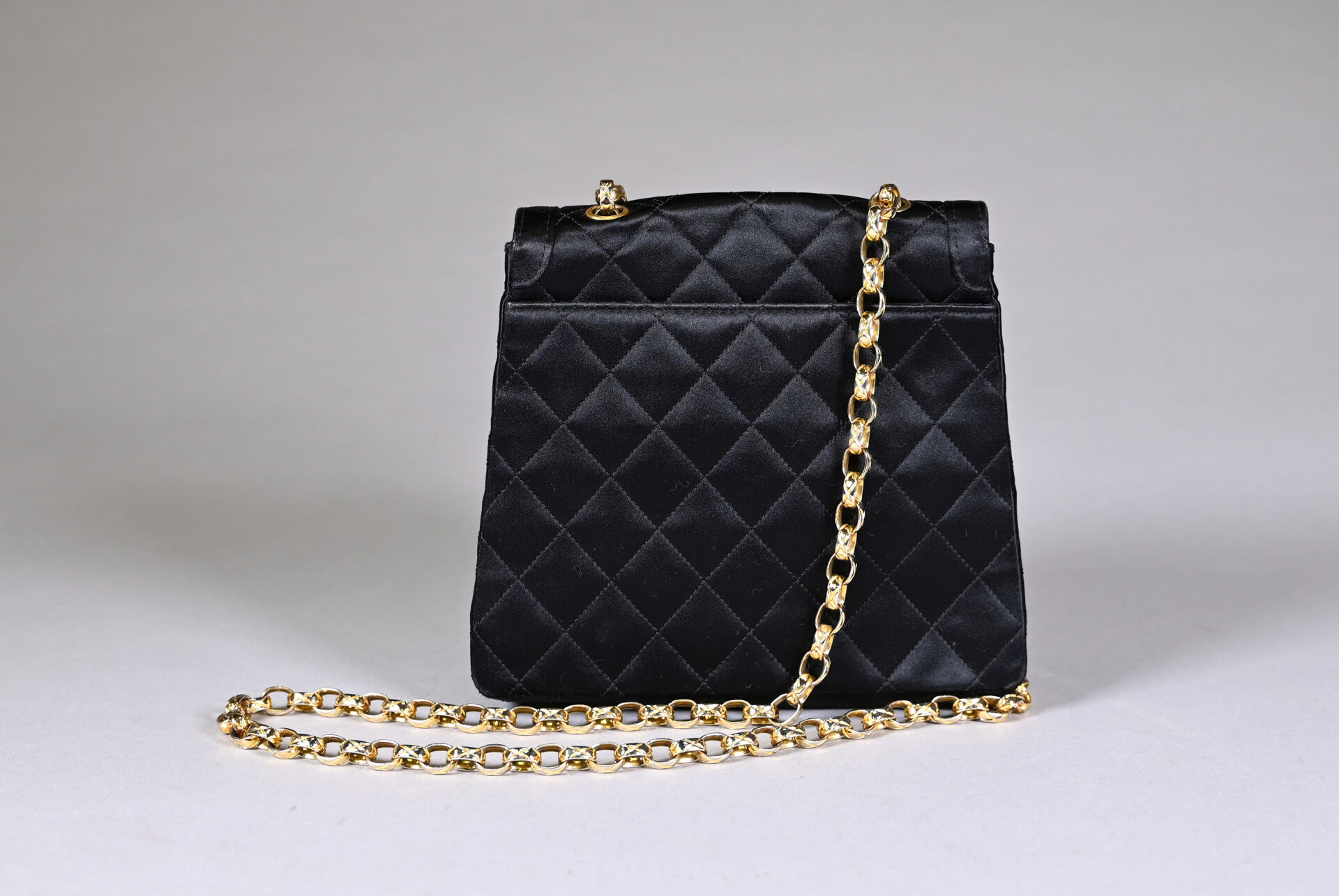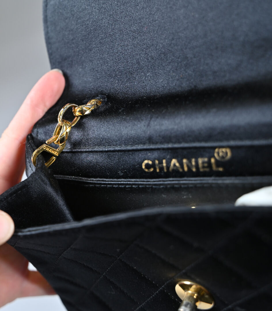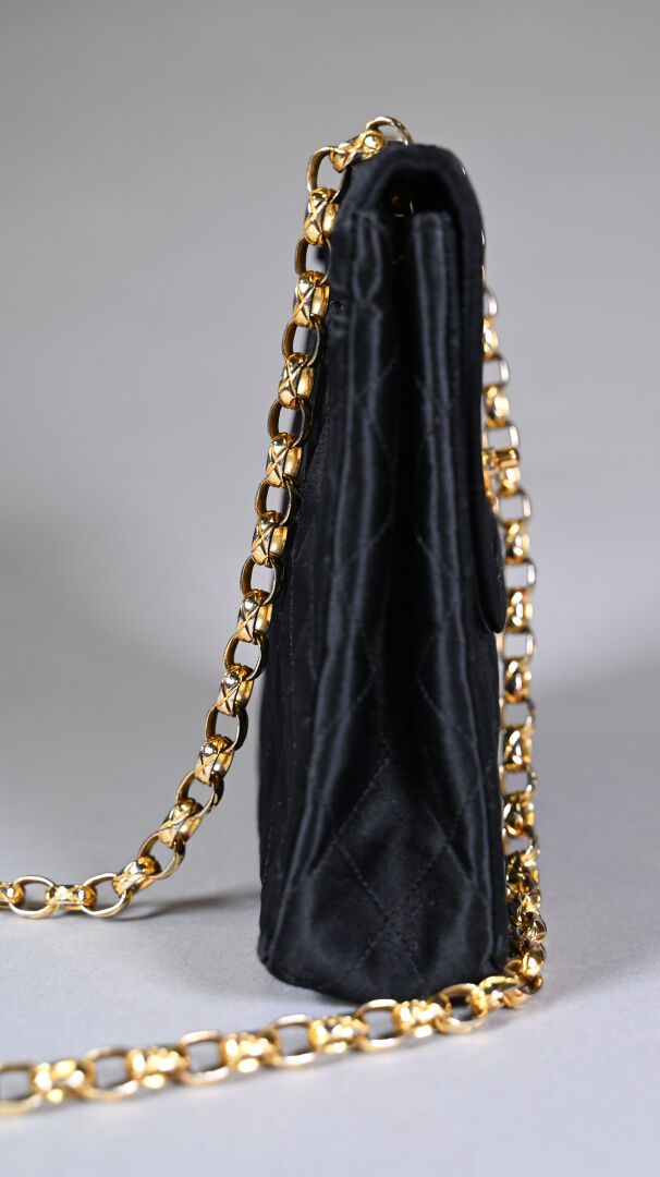 CHANEL Sac de soirée en satin de soie noir matelassé. Bijouterie en métal doré, doublure en satin de soie noir. Bon état, quelques traces sur les angles, bijouterie légèrement dédoré. Circa 1990, présence de l’étiquette d’authenticité. Dimensions 20x17x5 cm environ