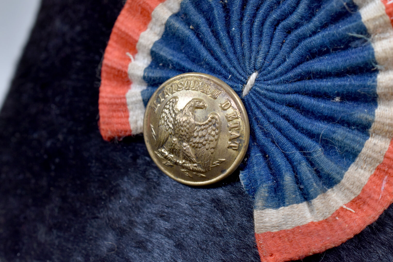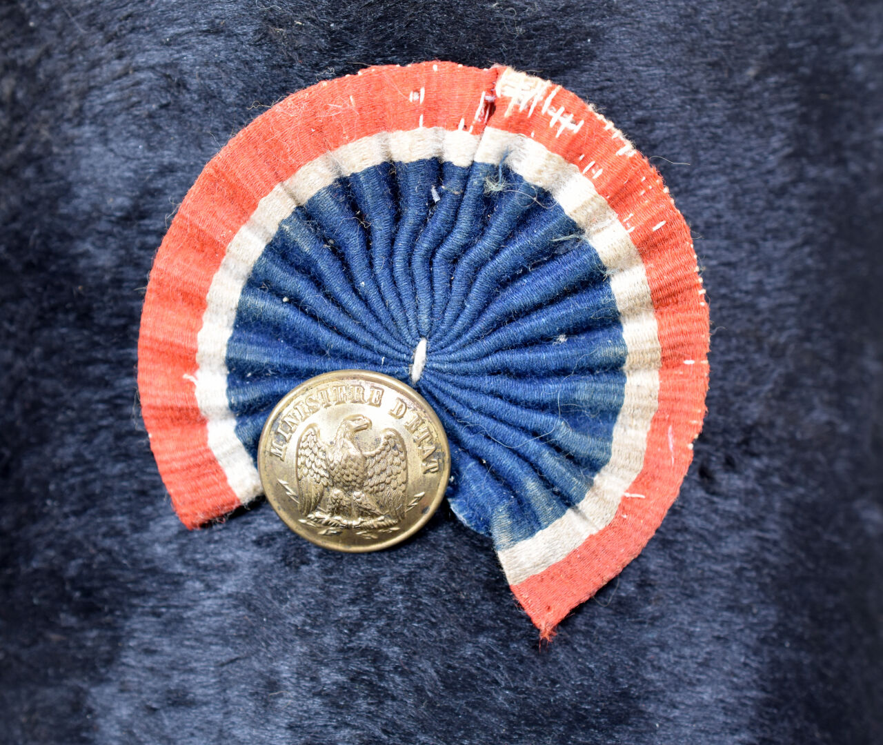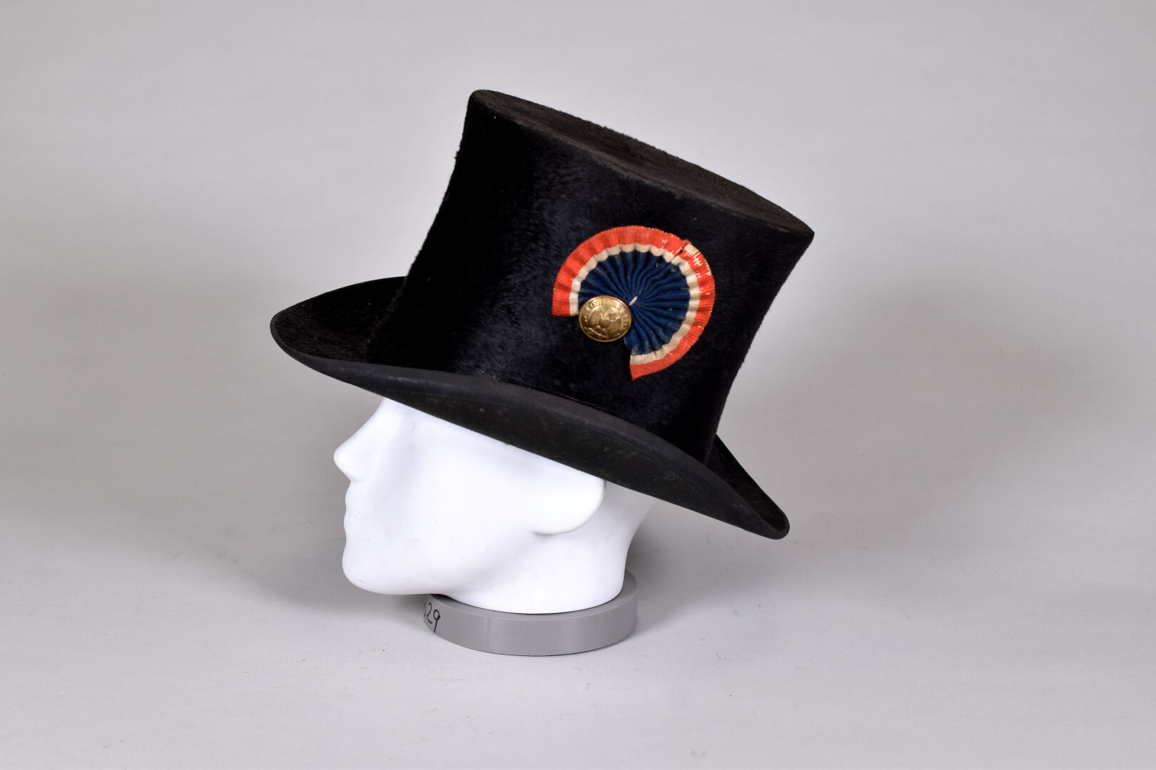 Chapeau haut-de-forme en taupé noir. Côté gauche portant une cocarde tricolore en tissu gaufré, retenue par un bouton en laiton avec une aigle non-couronnée sénestrogyre sur foudres, et texte « Ministère d’Etat ». État 2.