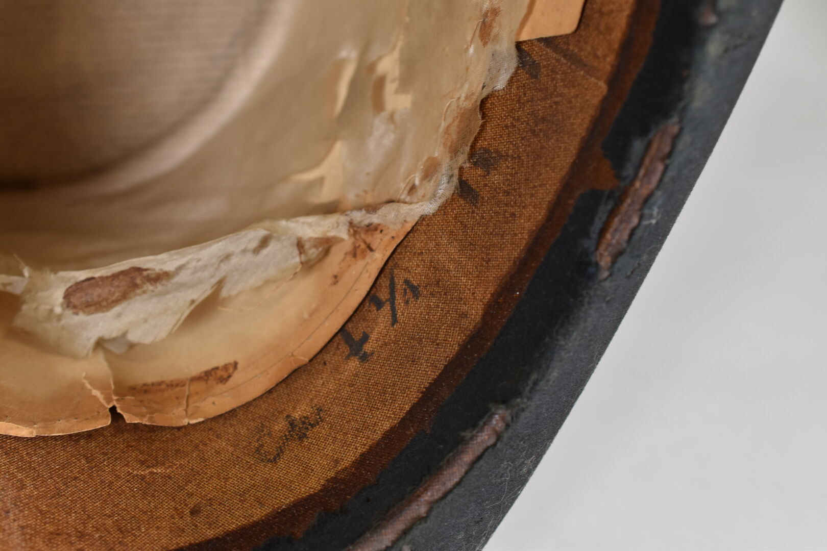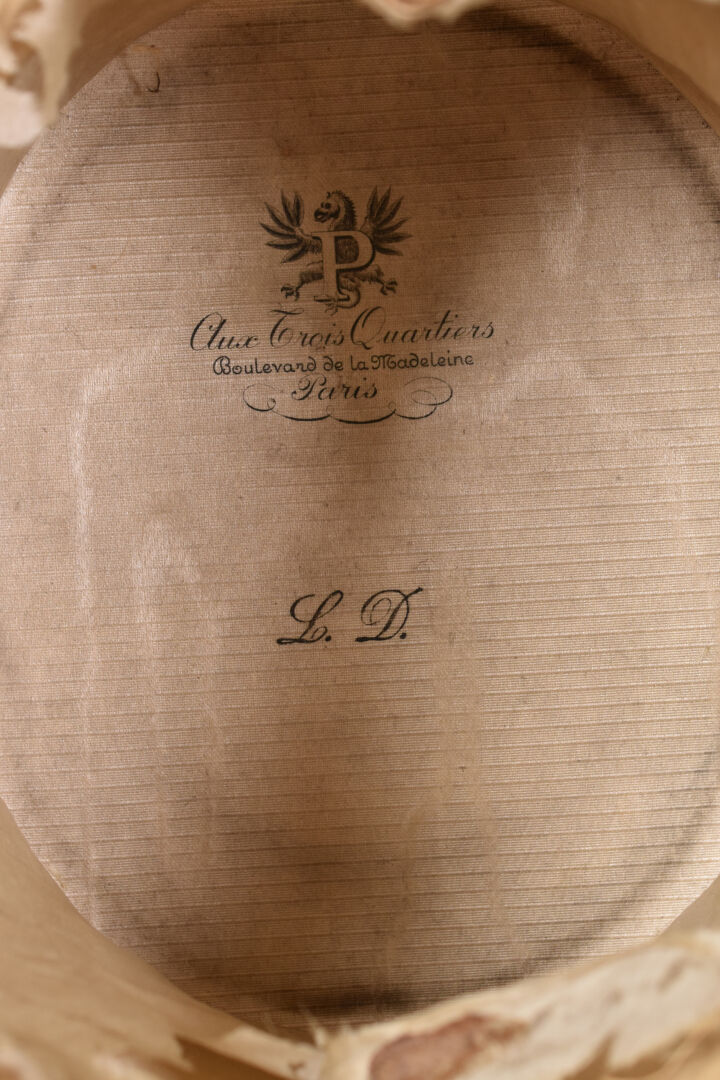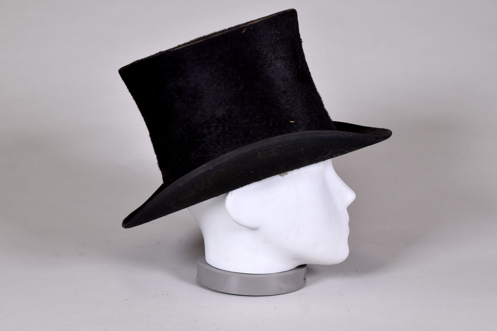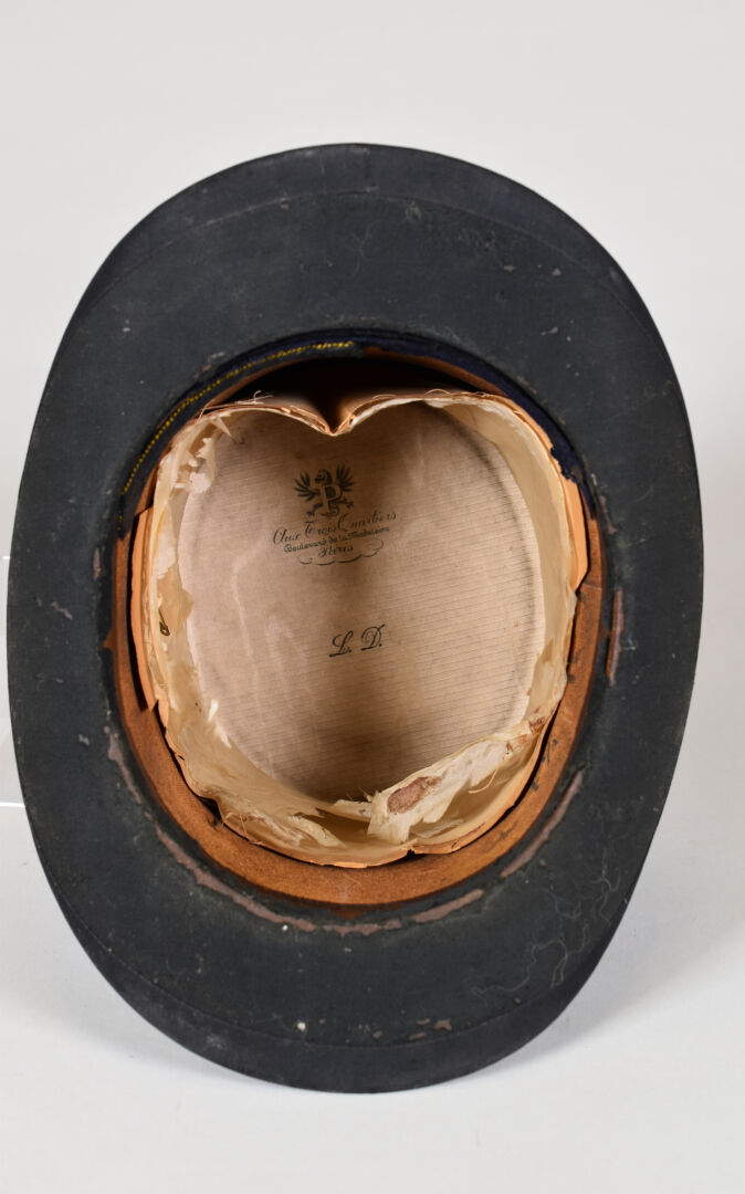Chapeau haut-de-forme en taupé noir. Côté gauche portant une cocarde tricolore en tissu gaufré, retenue par un bouton en laiton avec une aigle non-couronnée sénestrogyre sur foudres, et texte « Ministère d’Etat ». État 2.