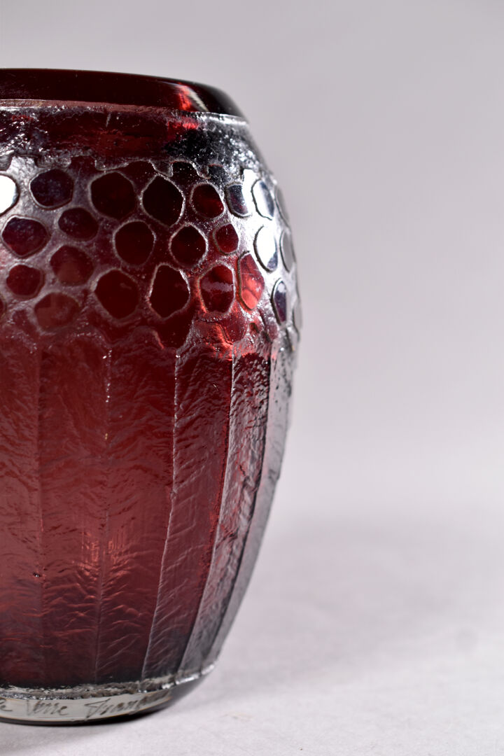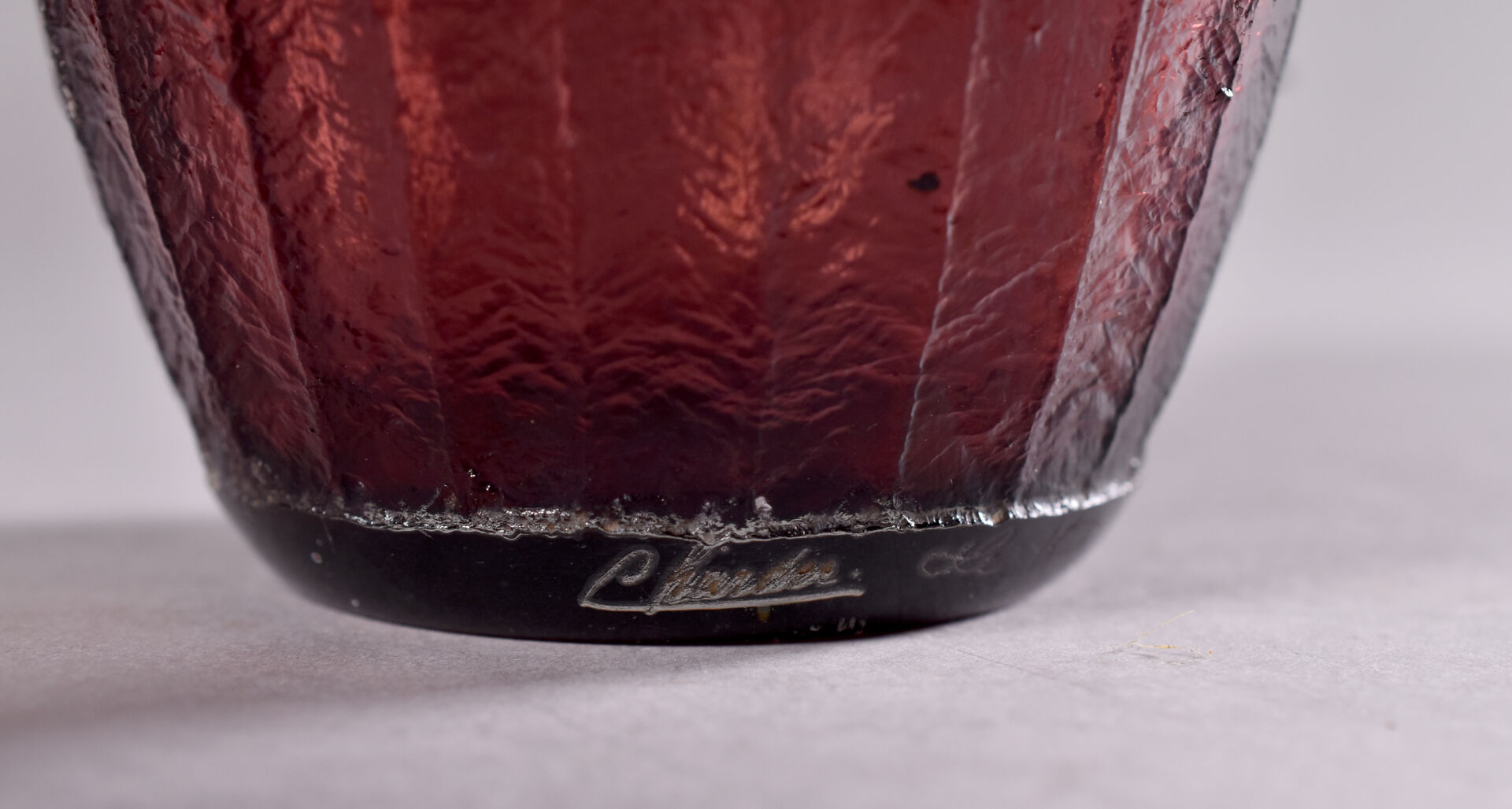 CHARDER LE VERRE FRANCAIS. Vase ovoïde en verre prune à décor gravé de larges godrons et pastilles. Signé à la base. Haut. : 16,5 cm.