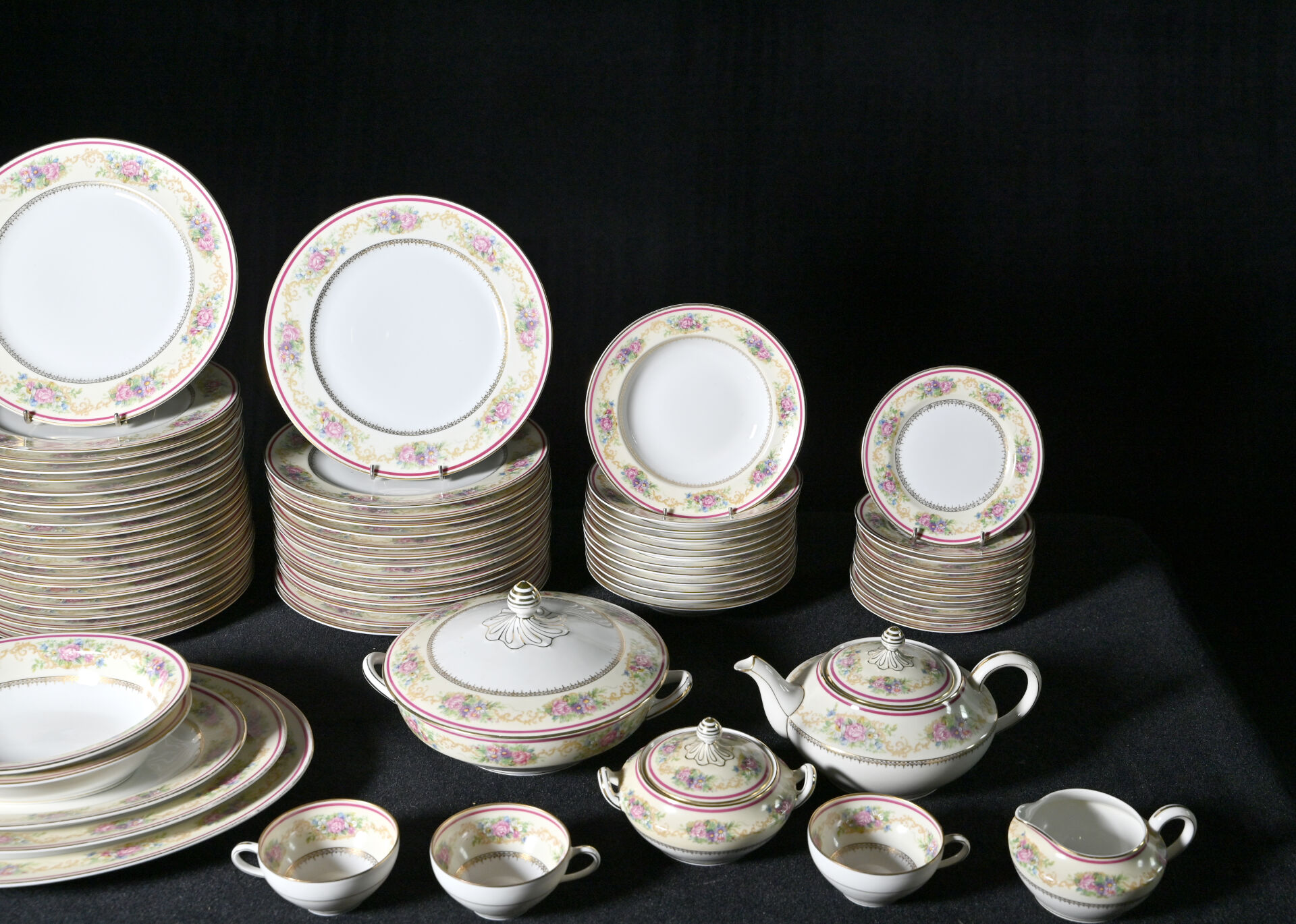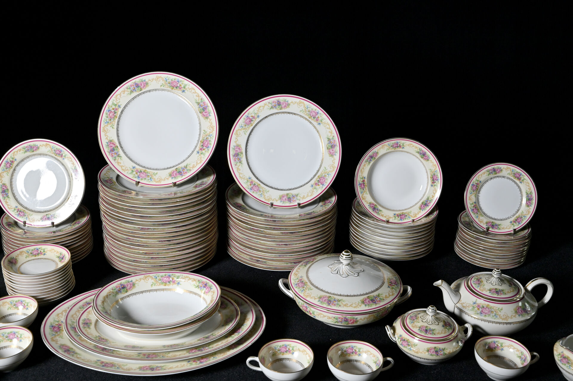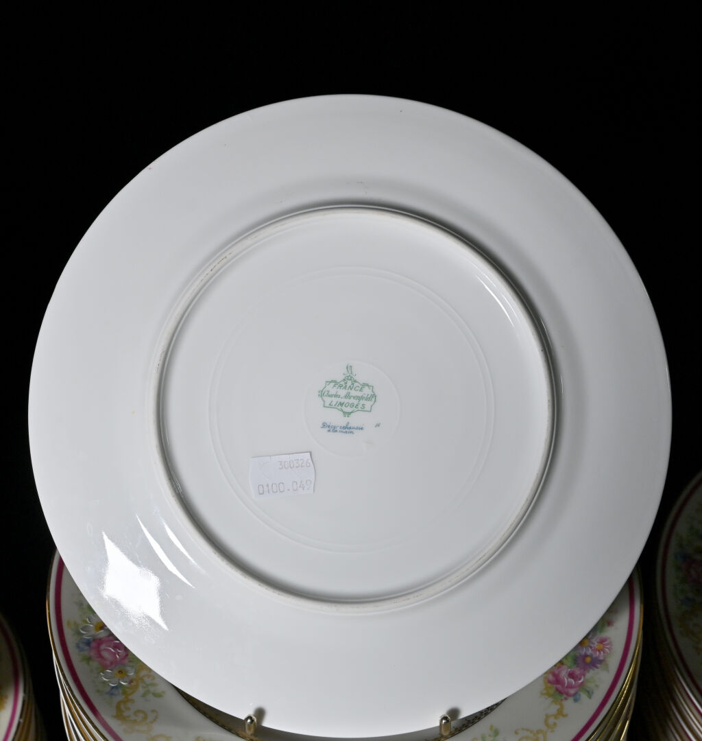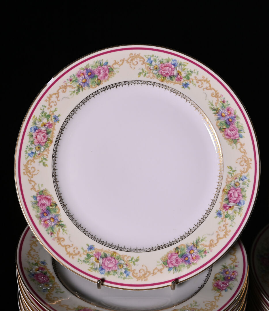 CHARLES AHRENFELDT – LIMOGES. Service de table en porcelaine à décor rehaussé de guirlandes de fleurs en polychromie sur fond crème, liseré framboise et or comprenant 36 assiettes plates (dont 4 avec éclats), 12 assiettes creuses (1 avec égrenures), 12 assiettes à entremets (2 avec éclats), 11 coupelles à dessert), 12 assiettes à gâteaux, 11 tasses et sous-tasses (1 éclat) et 1 sous-tasse seule, 1 théière, 1 pot à sucre, 1 pot à lait, 3 plats de service ovales, 2 jattes, et un légumier (usures à la dorure). Marqués.