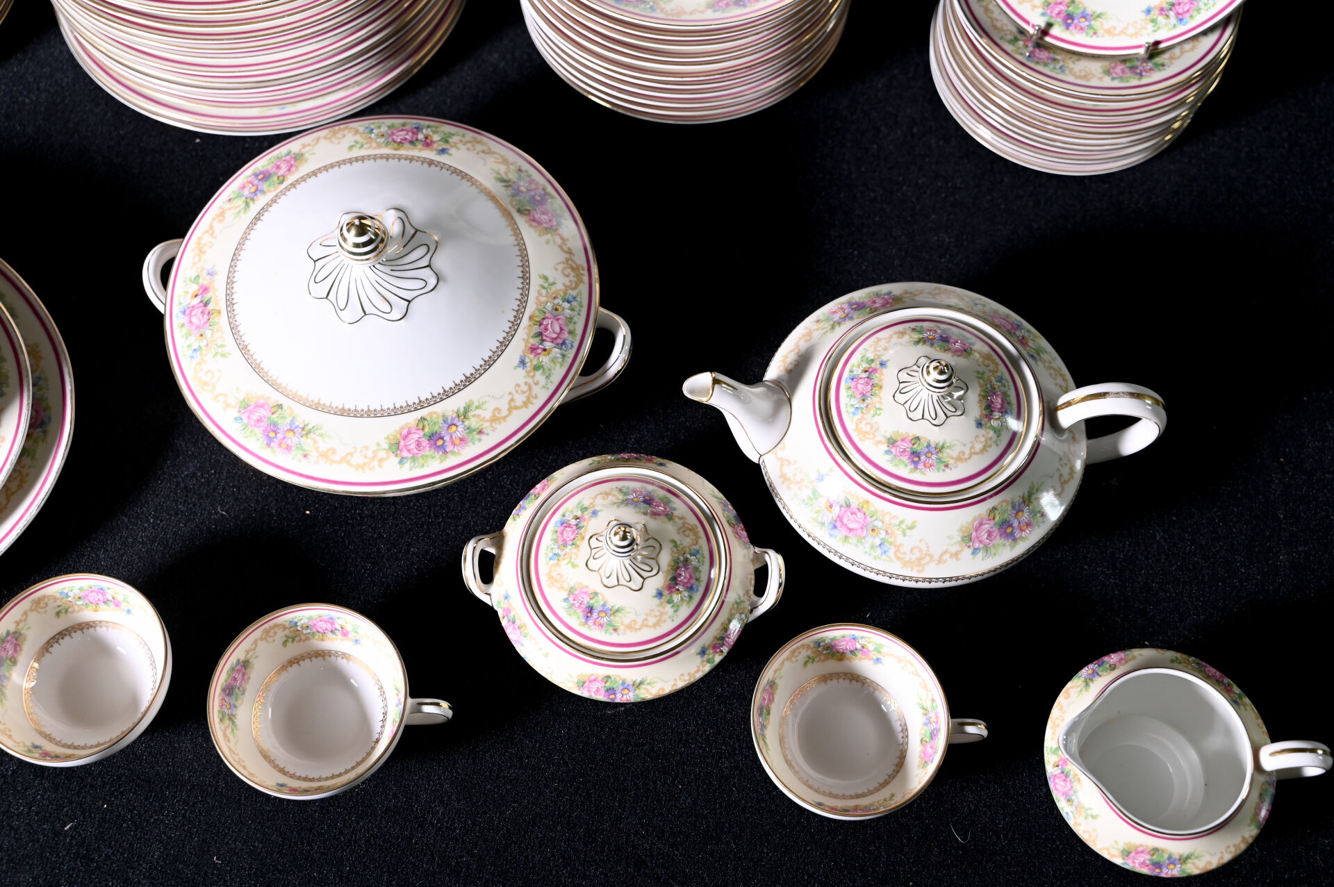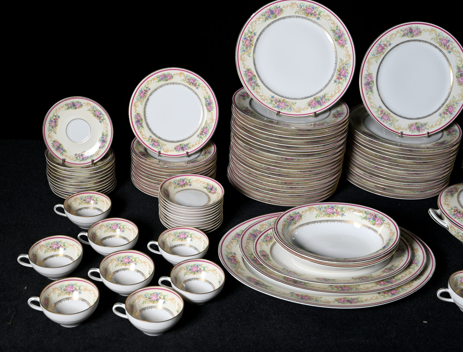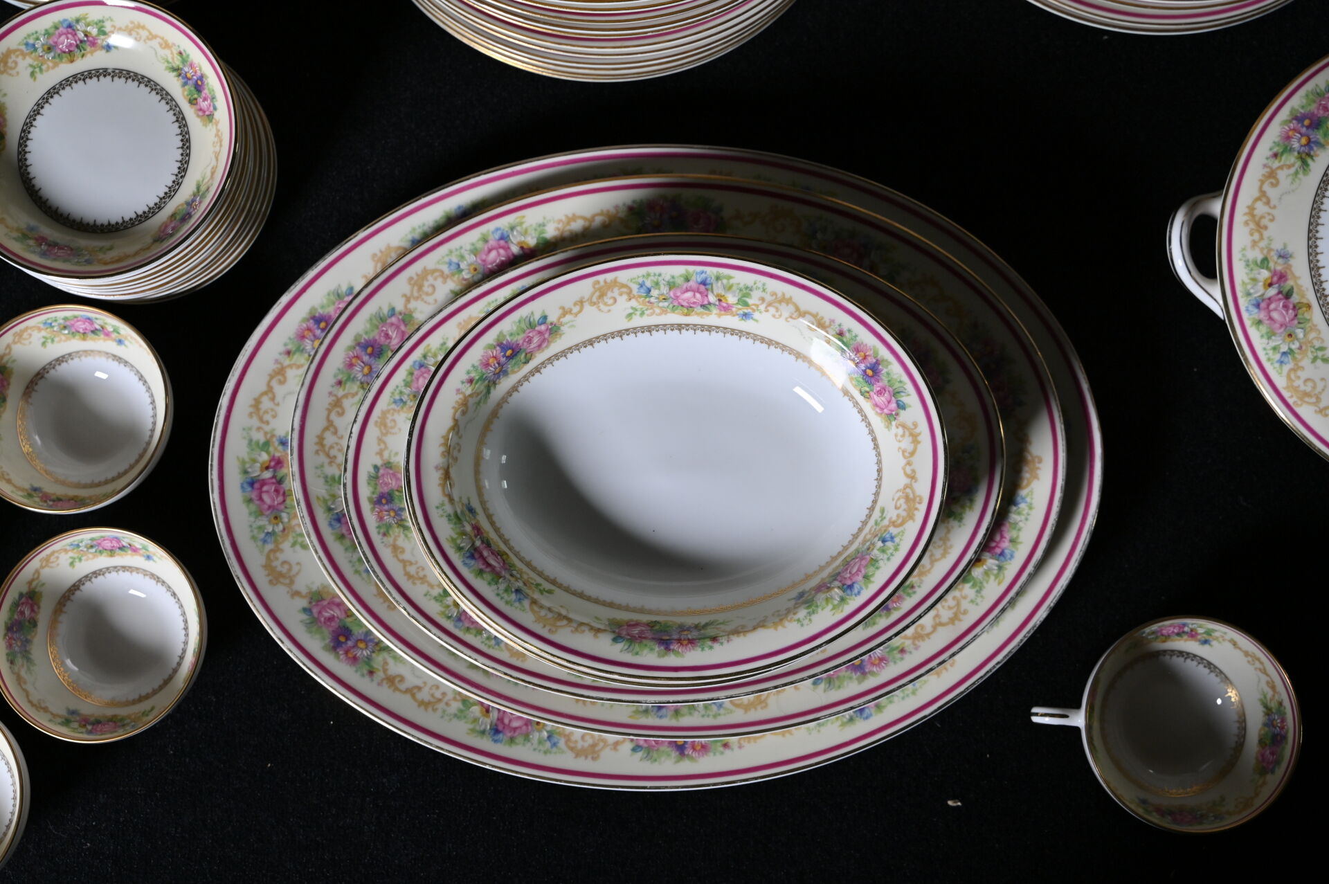 CHARLES AHRENFELDT – LIMOGES. Service de table en porcelaine à décor rehaussé de guirlandes de fleurs en polychromie sur fond crème, liseré framboise et or comprenant 36 assiettes plates (dont 4 avec éclats), 12 assiettes creuses (1 avec égrenures), 12 assiettes à entremets (2 avec éclats), 11 coupelles à dessert), 12 assiettes à gâteaux, 11 tasses et sous-tasses (1 éclat) et 1 sous-tasse seule, 1 théière, 1 pot à sucre, 1 pot à lait, 3 plats de service ovales, 2 jattes, et un légumier (usures à la dorure). Marqués.