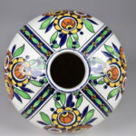 Charles CATTEAU (1880 – 1966) pour BOCH Frères – LA LOUVIÈRE. Vase boule à petit col rétréci en faïence à décor émaillé polychrome de fleurs sur fond crème. Au dessous cachet noir, marque en creux « 446 » et en noir « D-948 A ». Travail Fin période Art déco (années 40). Haut. : 18 cm.