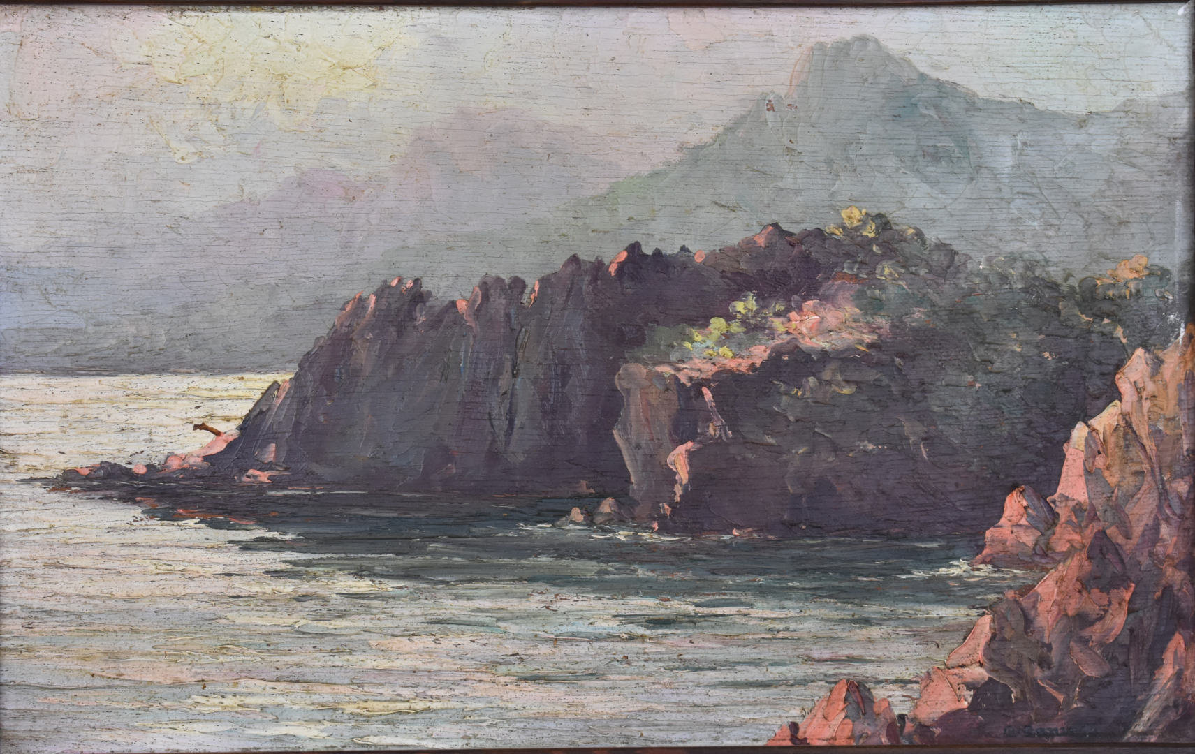 Charles CERMARK (1877 – 1966). Rochers en bord de mer. Huile sur panneau d’acajou signée en bas à droite. 27,7 x 35 cm.