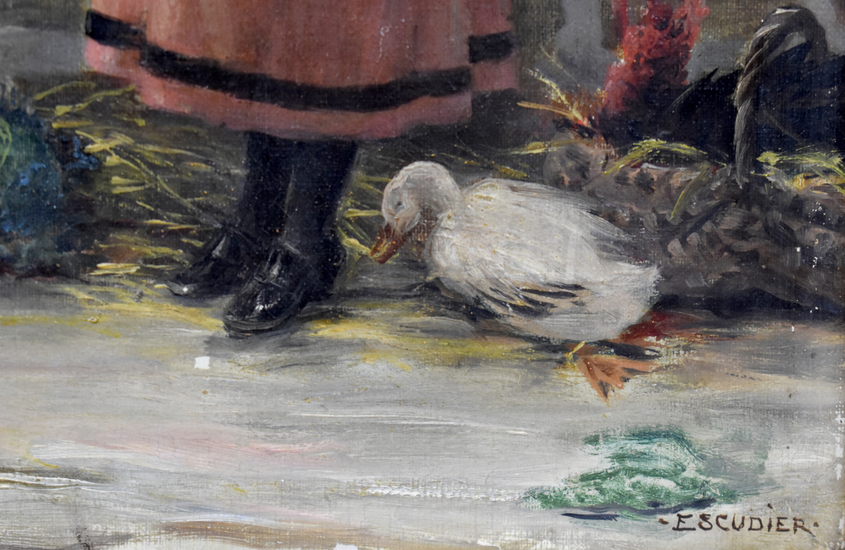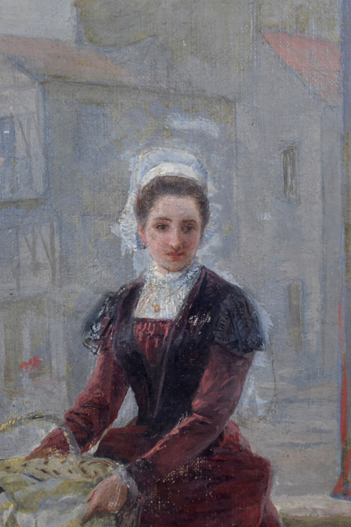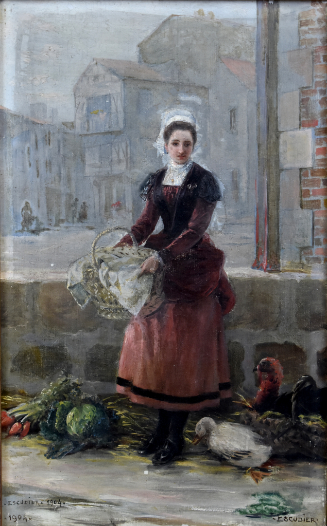Charles Jean Auguste ESCUDIER (1848-1923). Jeune femme au panier. Huile sur toile signée en bas à droite, contre signée et datée 1904 en bas à gauche. 31 x 20 cm.