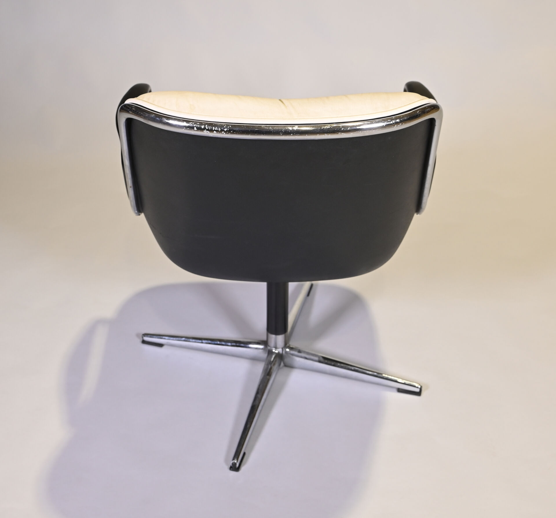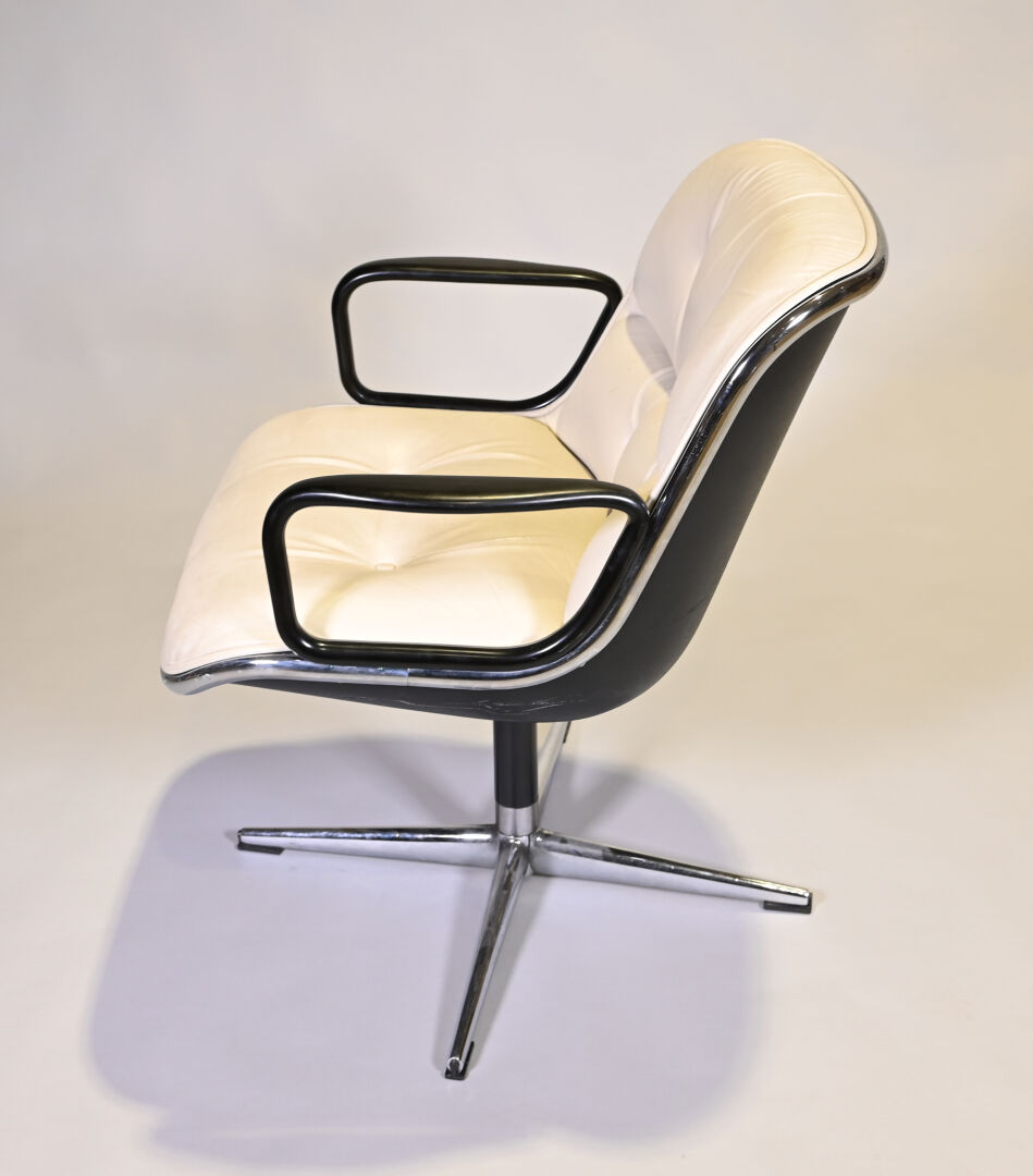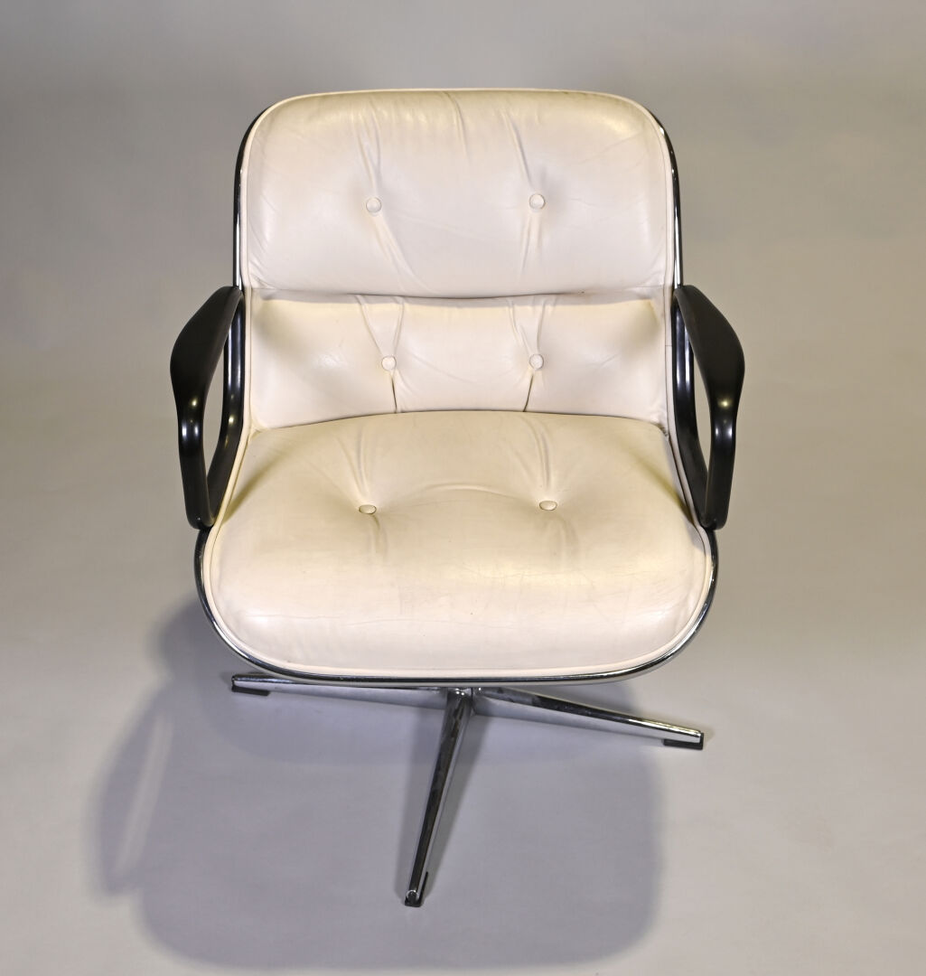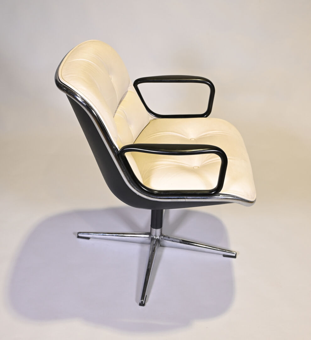 Charles POLLOCK Charles (1930- 2013) pour KNOLL international éditeur Fauteuil de bureau pivotant modèle « Executive Chair » reposant sur un piètement cruciforme en métal chromé. Garniture de cuir crème (quelques petites salissures, pied légèrement mouvant). Années 1970. Haut. : 82 cm.