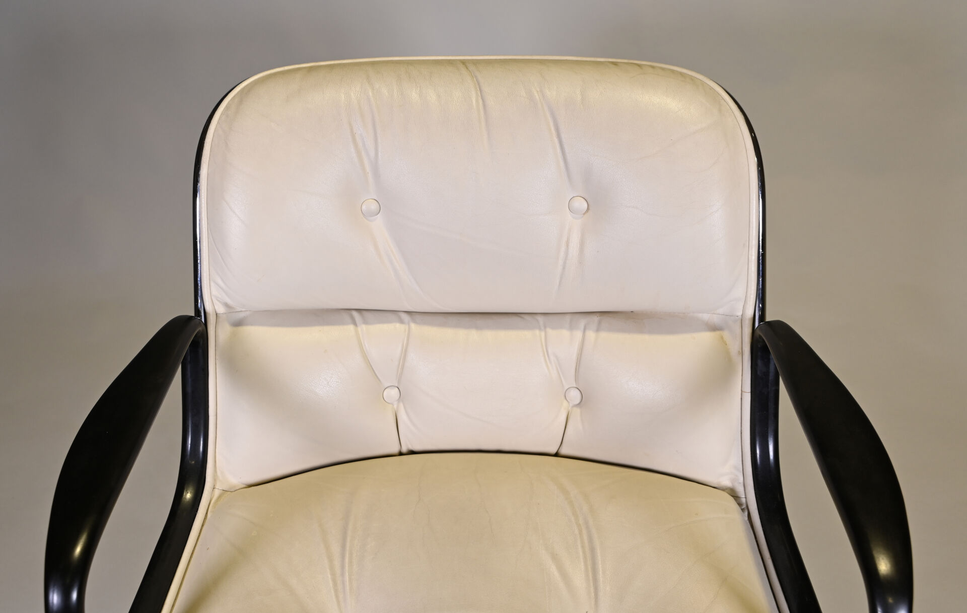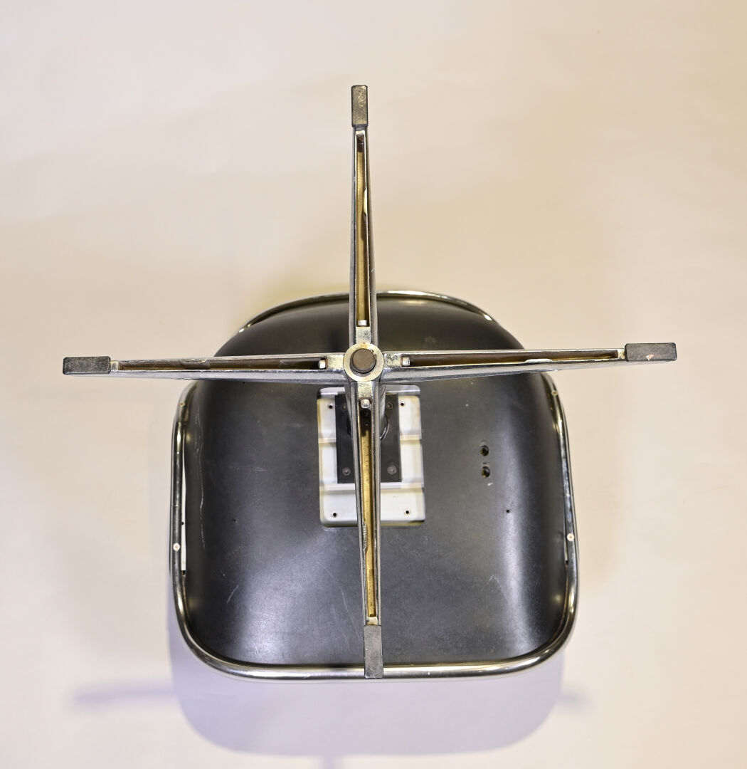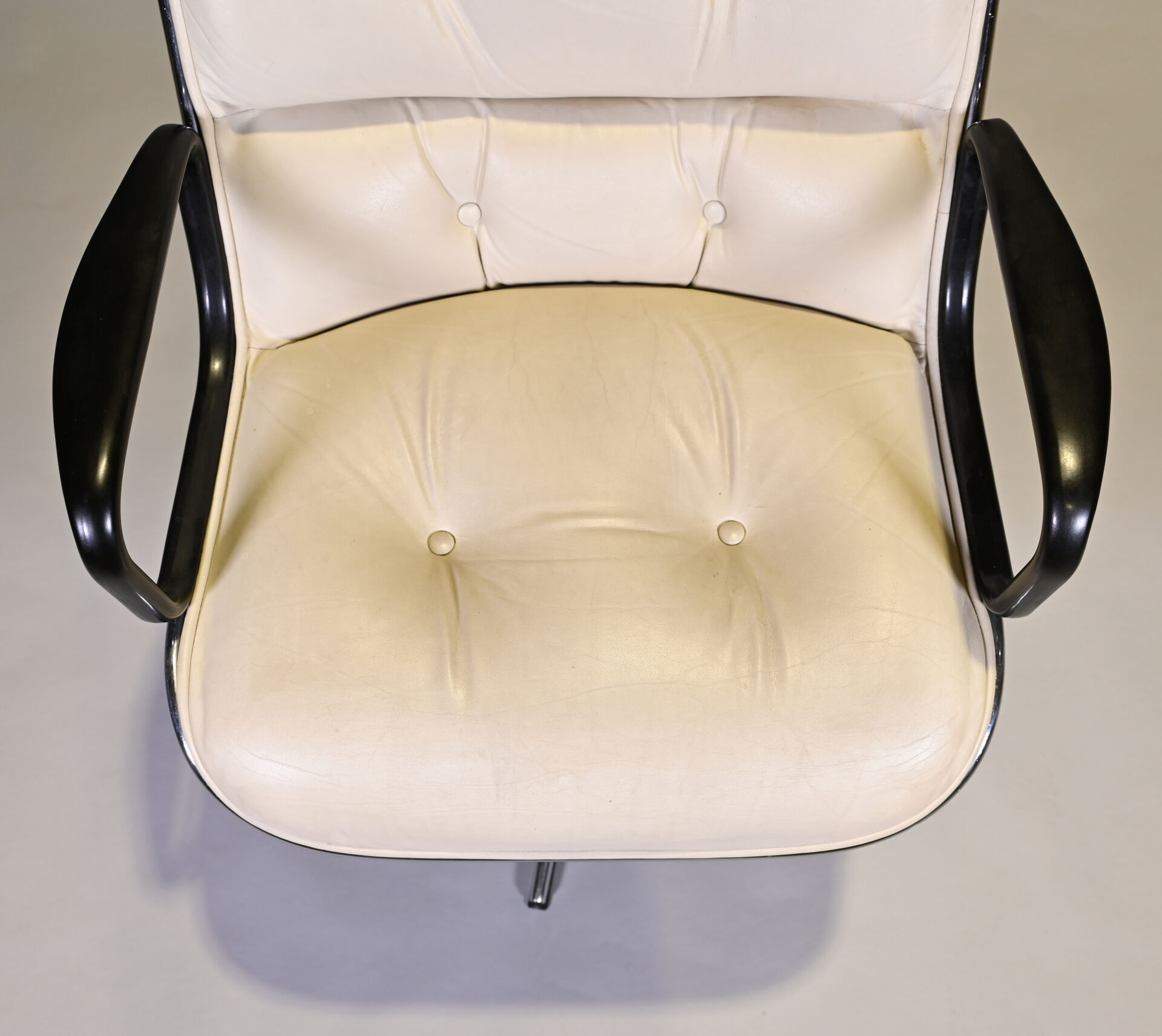 Charles POLLOCK Charles (1930- 2013) pour KNOLL international éditeur Fauteuil de bureau pivotant modèle « Executive Chair » reposant sur un piètement cruciforme en métal chromé. Garniture de cuir crème (quelques petites salissures, pied légèrement mouvant). Années 1970. Haut. : 82 cm.
