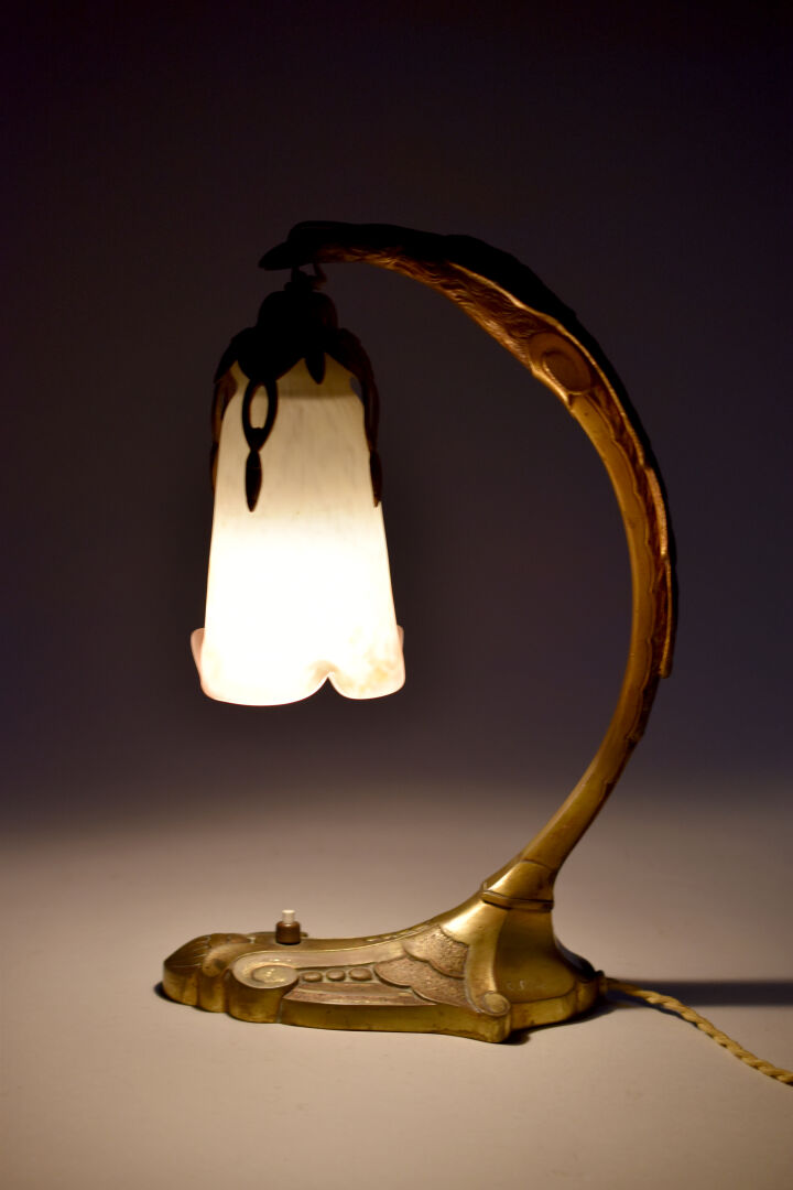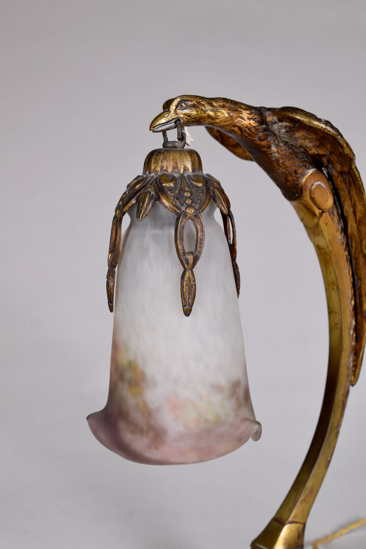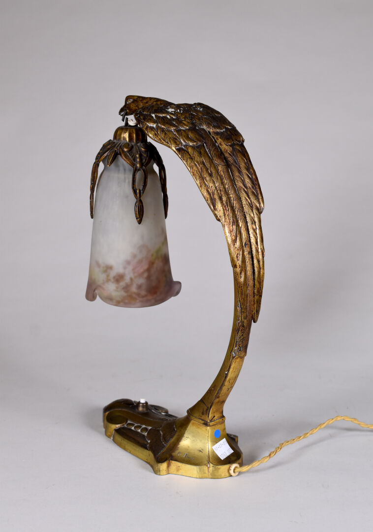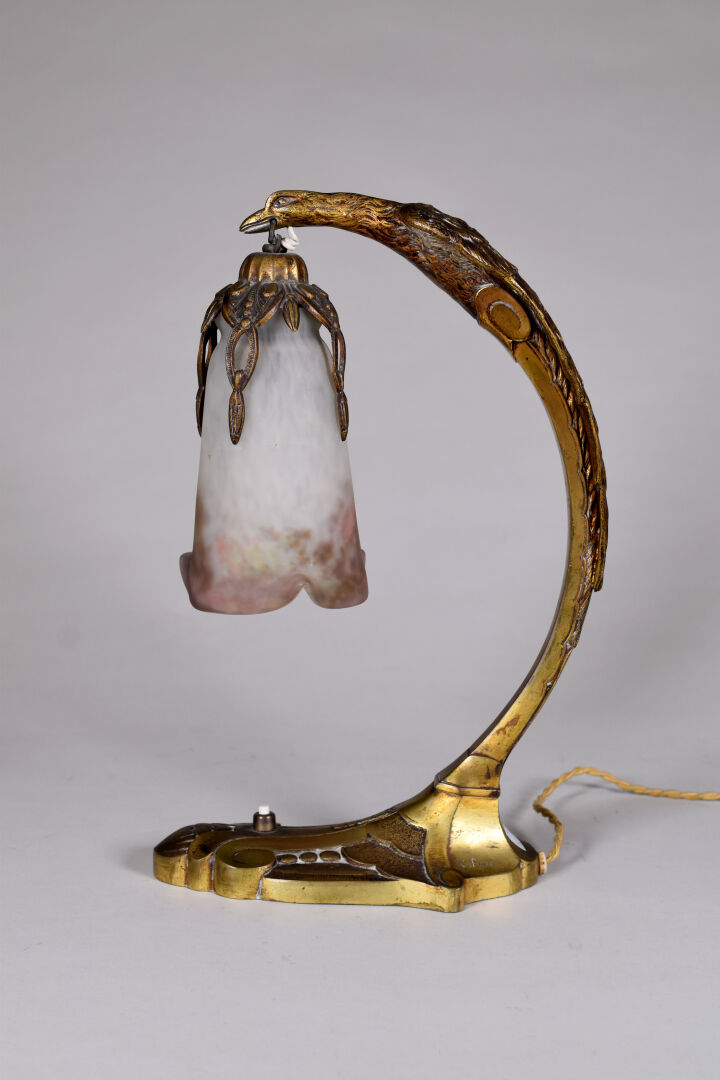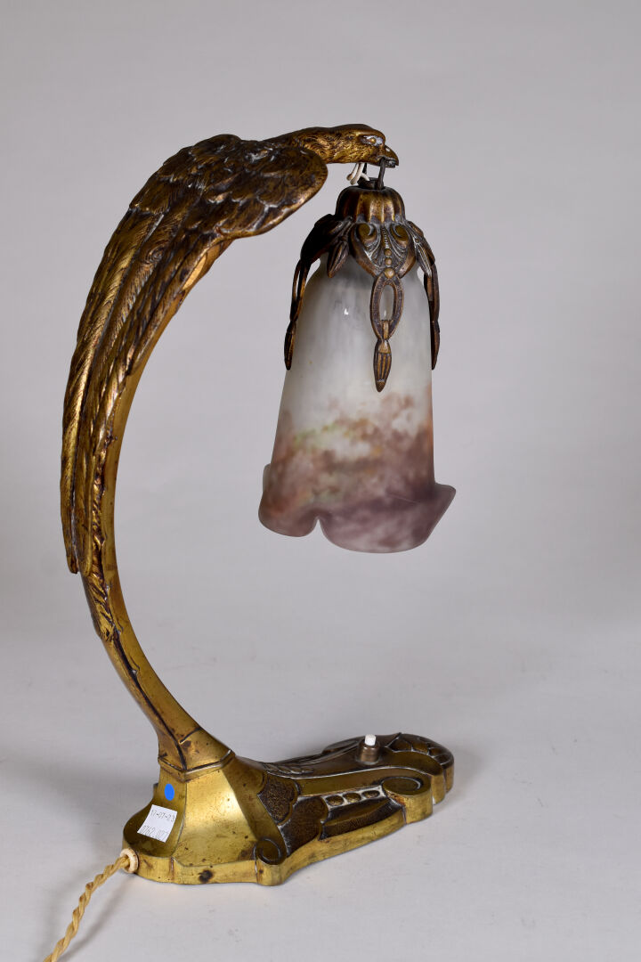 Charles RANC (XIXe-XXe siècle). Lampe en bronze doré (usures) la base à motifs géométrique, le fût formé par un aigle tenant une tulipe en verre marmoréen mauve orange et blanc signée Muller Frères à Luneville. Base également signée de RANC. Vers 1920. Haut. : 37,5 cm.