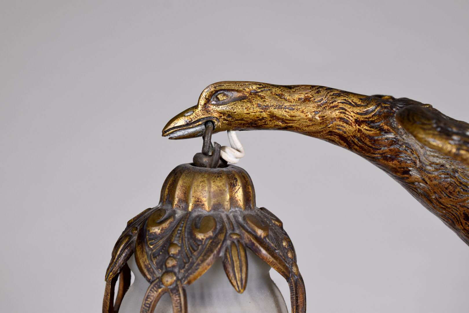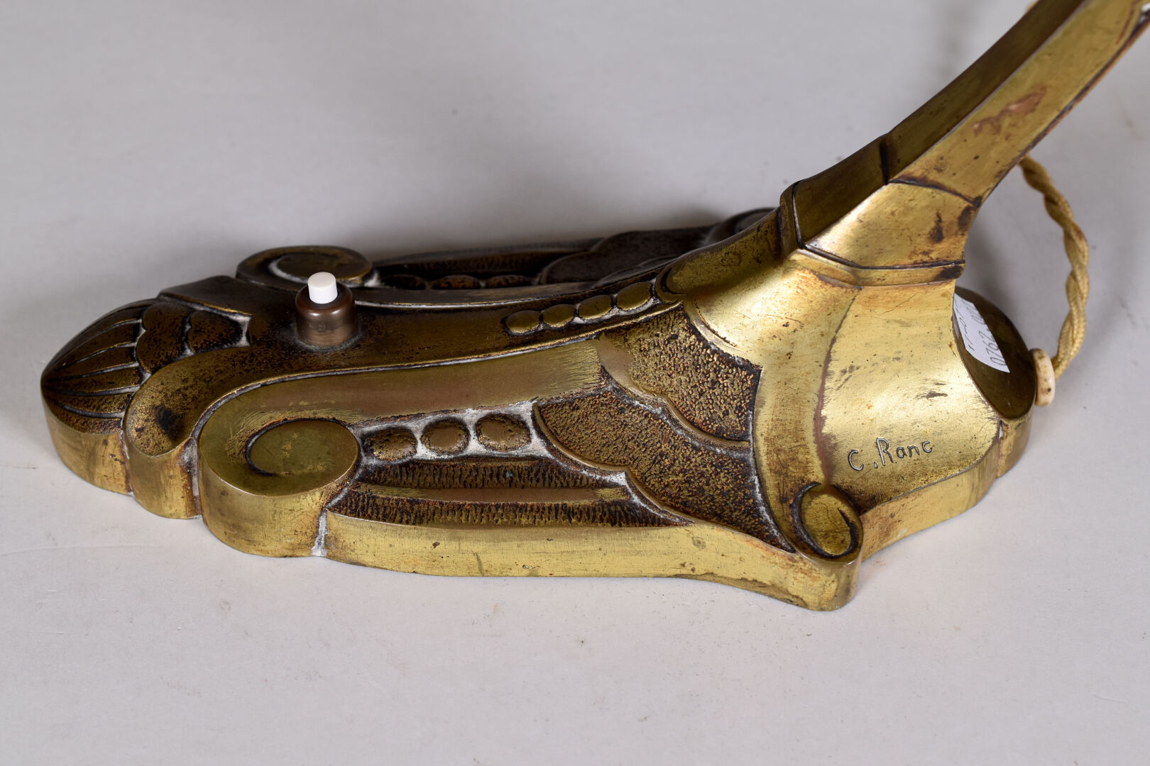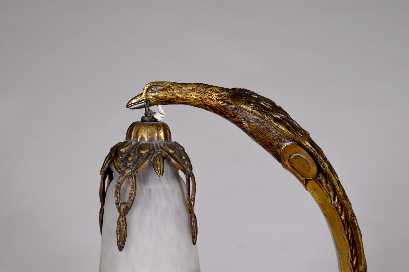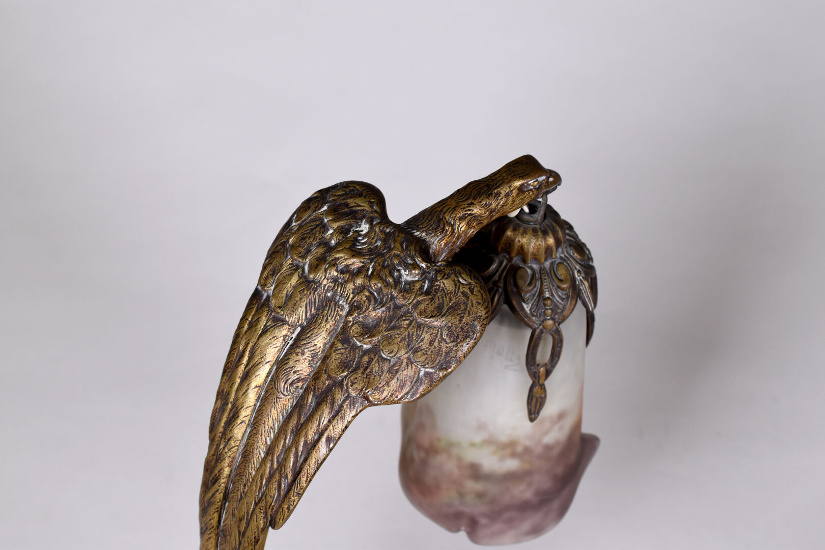 Charles RANC (XIXe-XXe siècle). Lampe en bronze doré (usures) la base à motifs géométrique, le fût formé par un aigle tenant une tulipe en verre marmoréen mauve orange et blanc signée Muller Frères à Luneville. Base également signée de RANC. Vers 1920. Haut. : 37,5 cm.