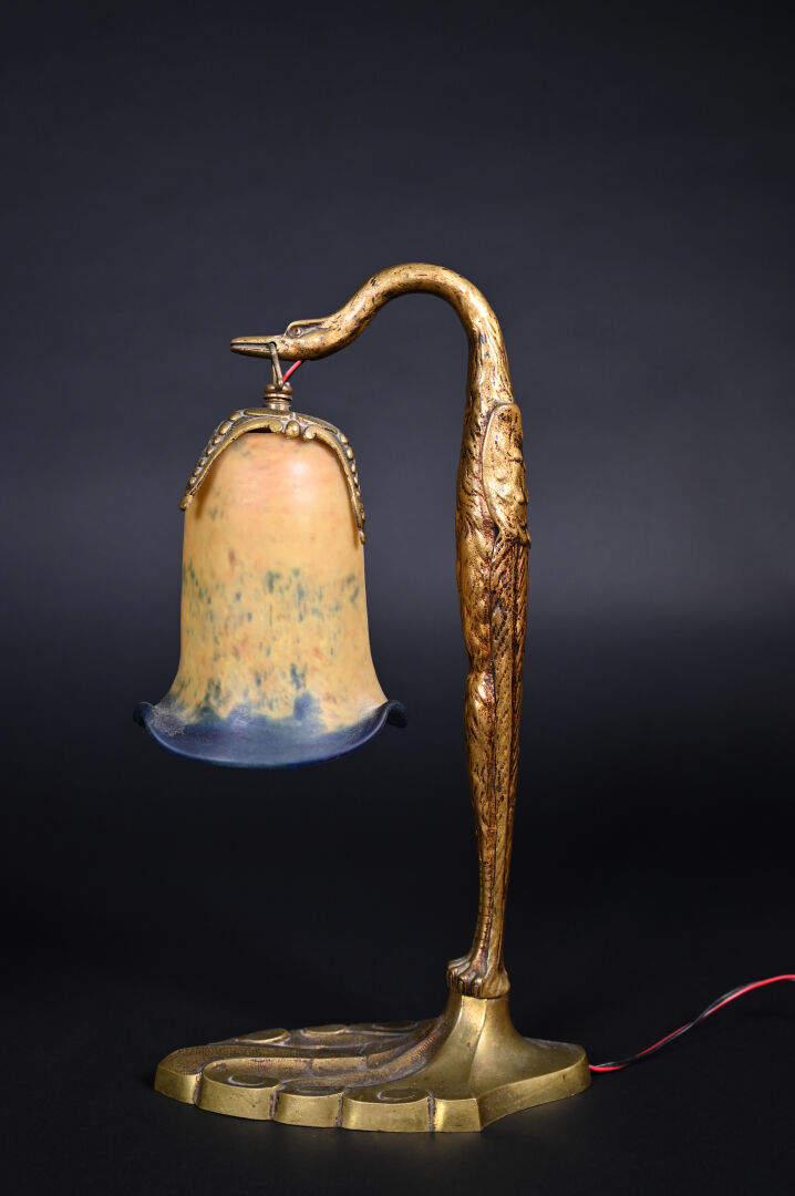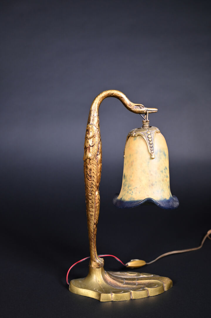 Charles RANC (XIXème-XXème) et BIOT. lampe à poser en bronze, le fût figurant un oiseau, la tulipe en verre marmoréen jaune et bleu. Tulipe et bronze signés. Haut. : 37,5 cm.