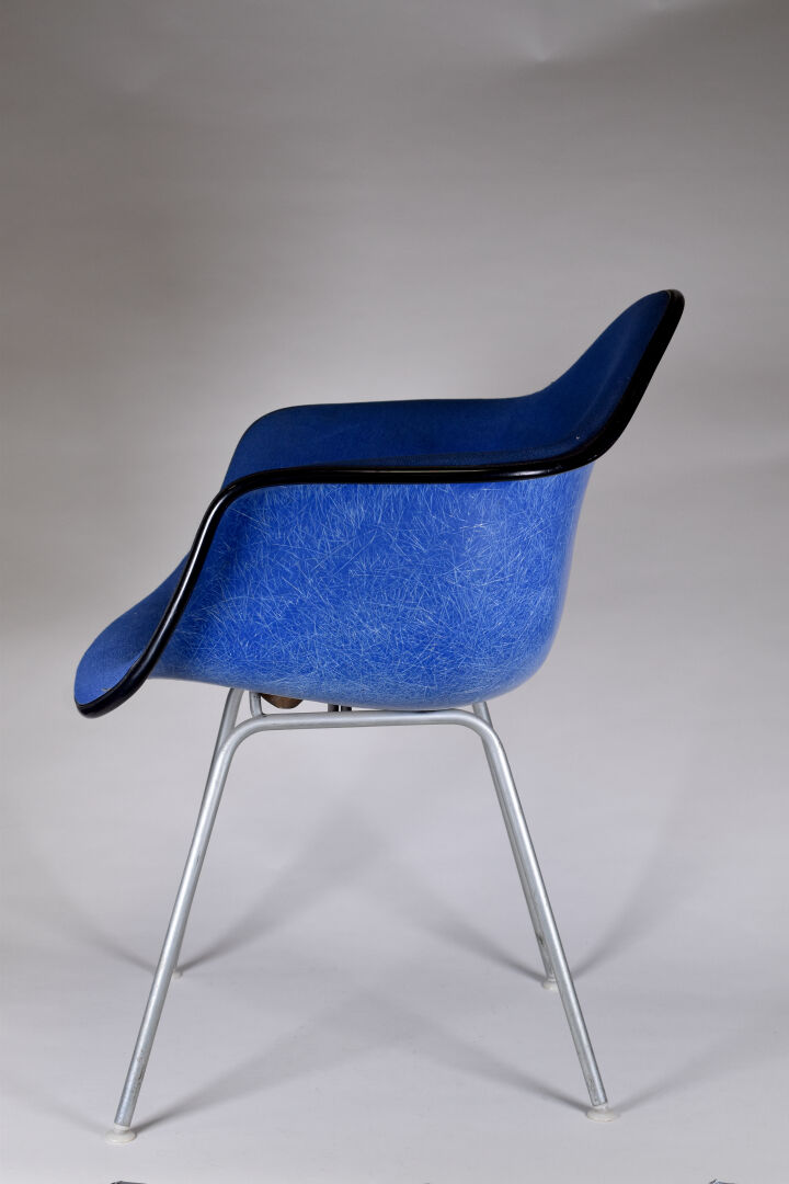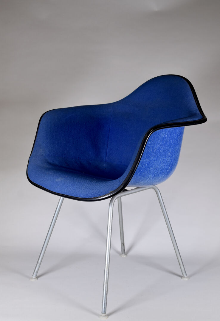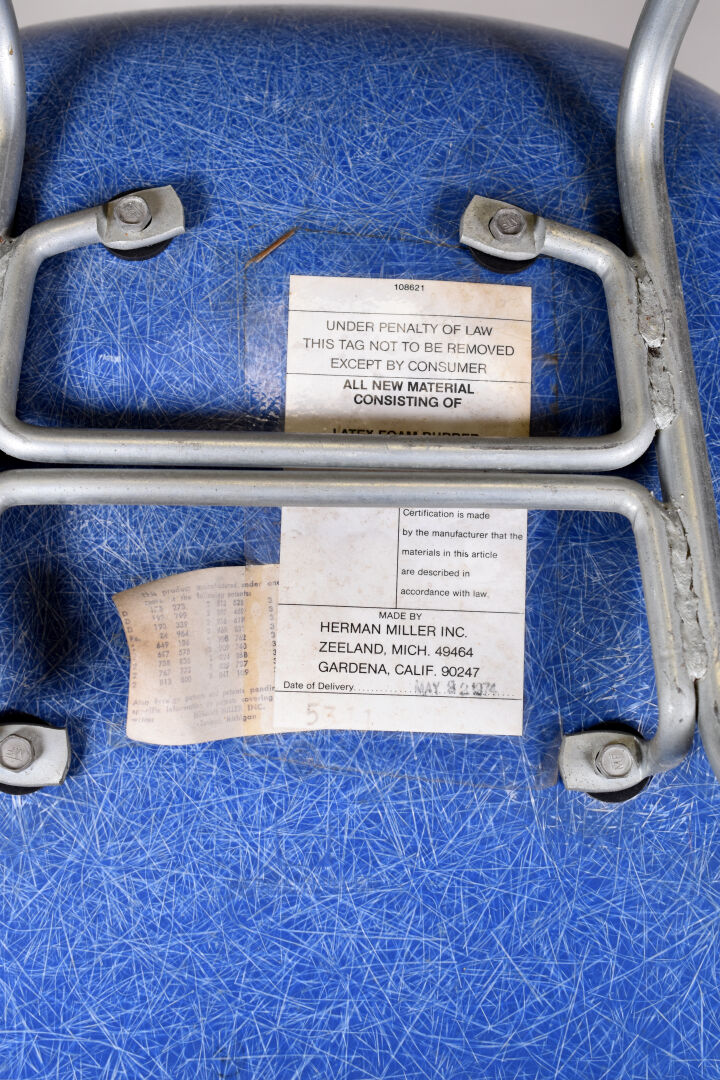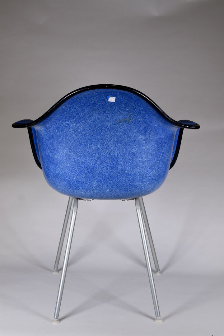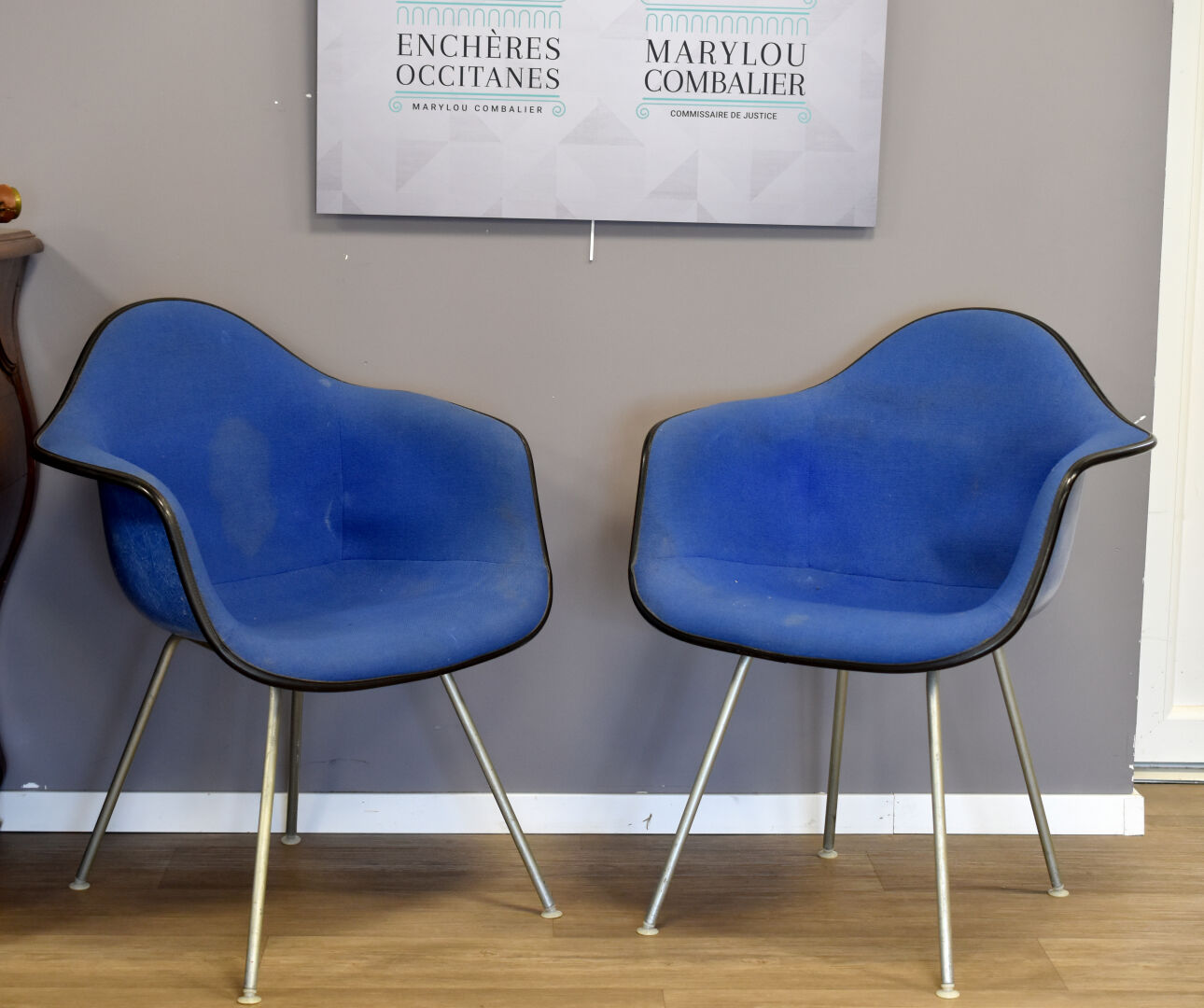 Charles & Ray EAMES (1907-1978 & 1912-1988) édition HERMAN MILLER. Paire de fauteuils modèle « DAR », coque en fibre de verre moulée teintée bleue garnies de mousse et recouvertes de tissu bleu (salissures). Piétement tubulaire en métal gris. Etiquette sous l’assise. Mai 1974. Haut. : cm.