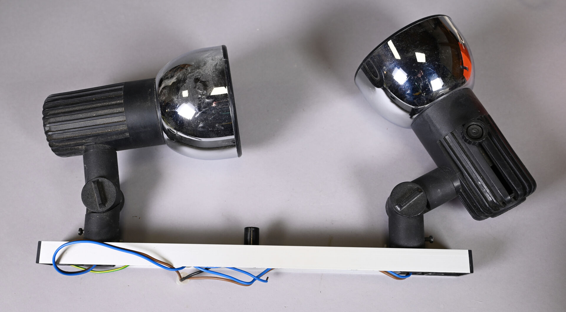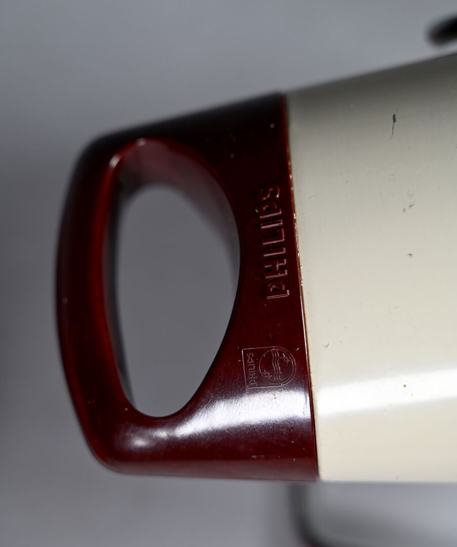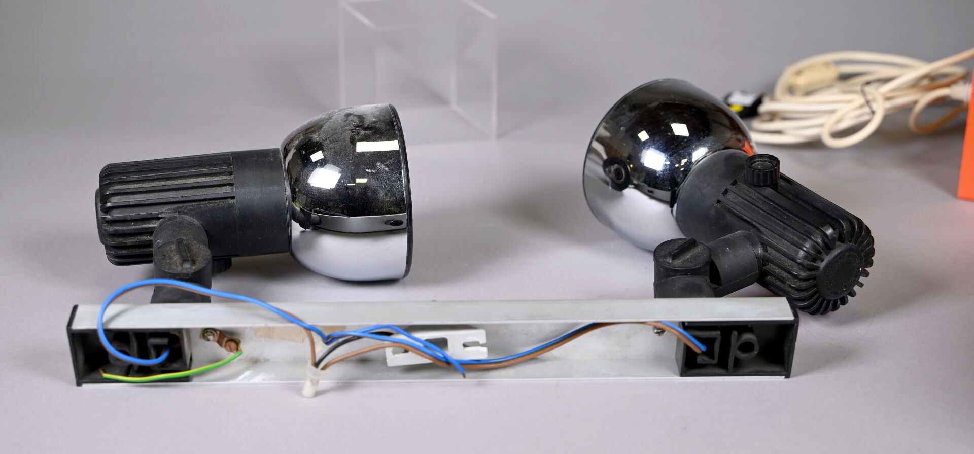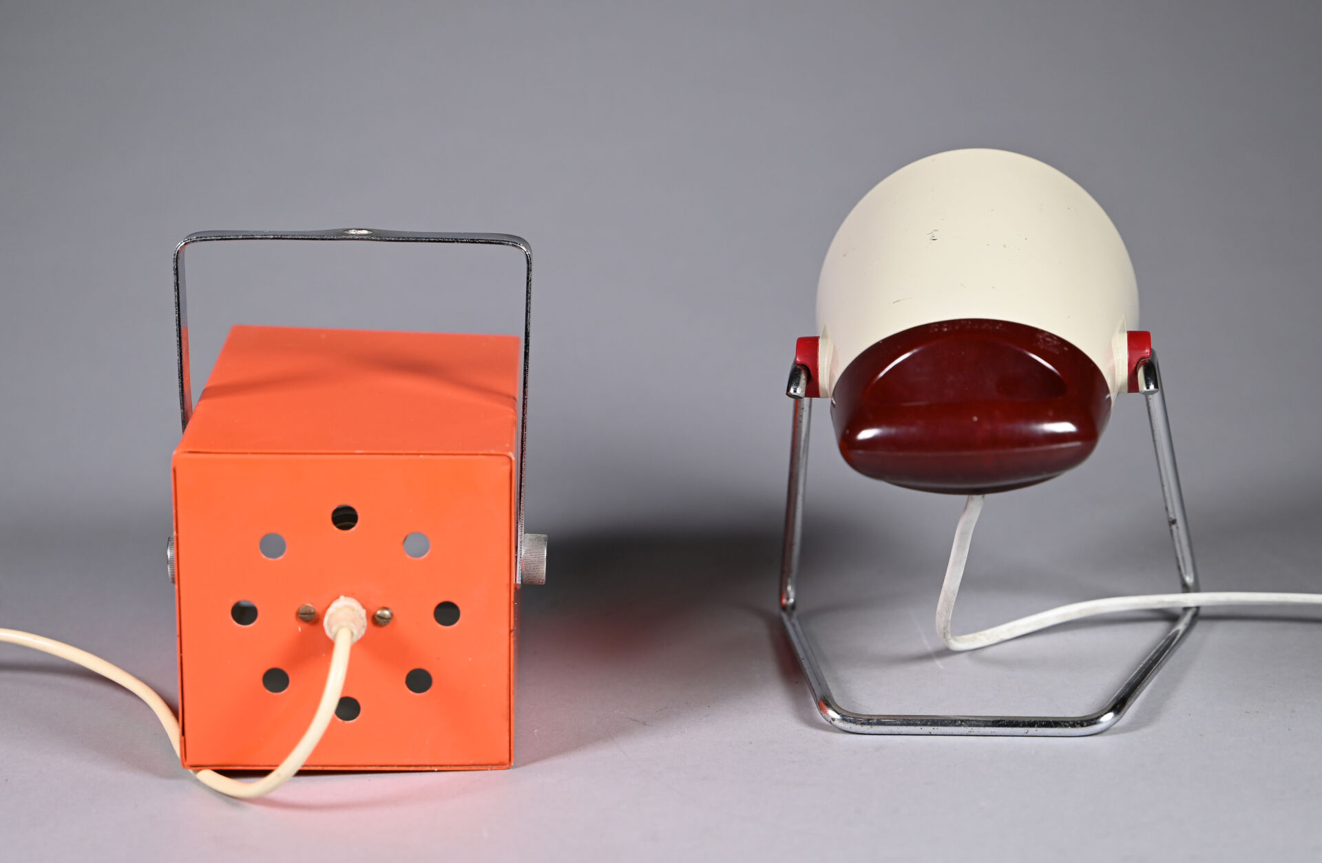 Charlotte PERRIAND (1903-1999) pour PHILIPS. Lampe à poser modèle « Infrarouge » à pied en métal chromé, fonte d’aluminium laquée beige et rouge. Hauteur ajustable. : 24,5 cm. On joint une autre cubique en métal laqué orange. vers 1970 et une applique à deux lumières orientables en plastique noir et métal, vers 1980.