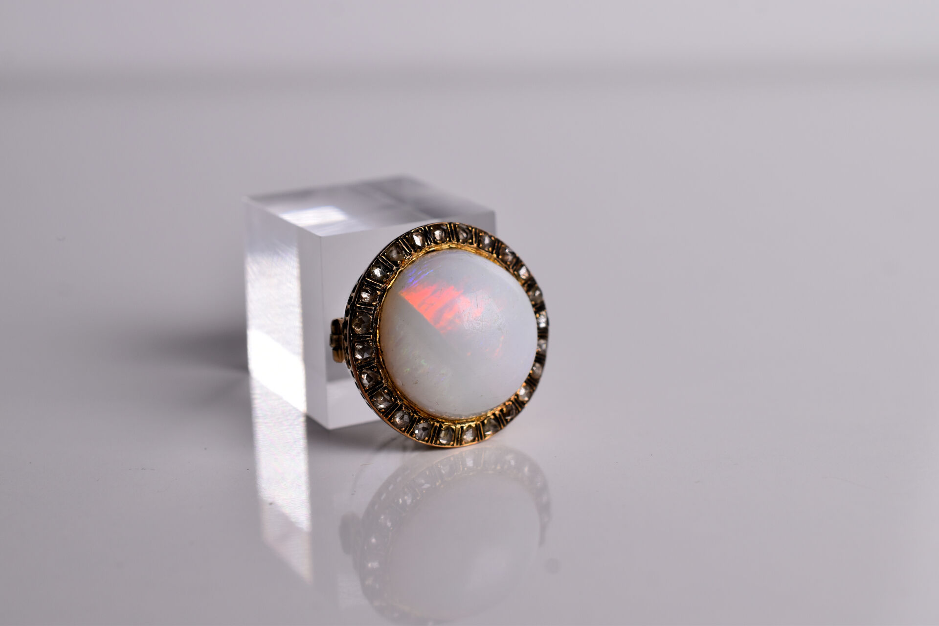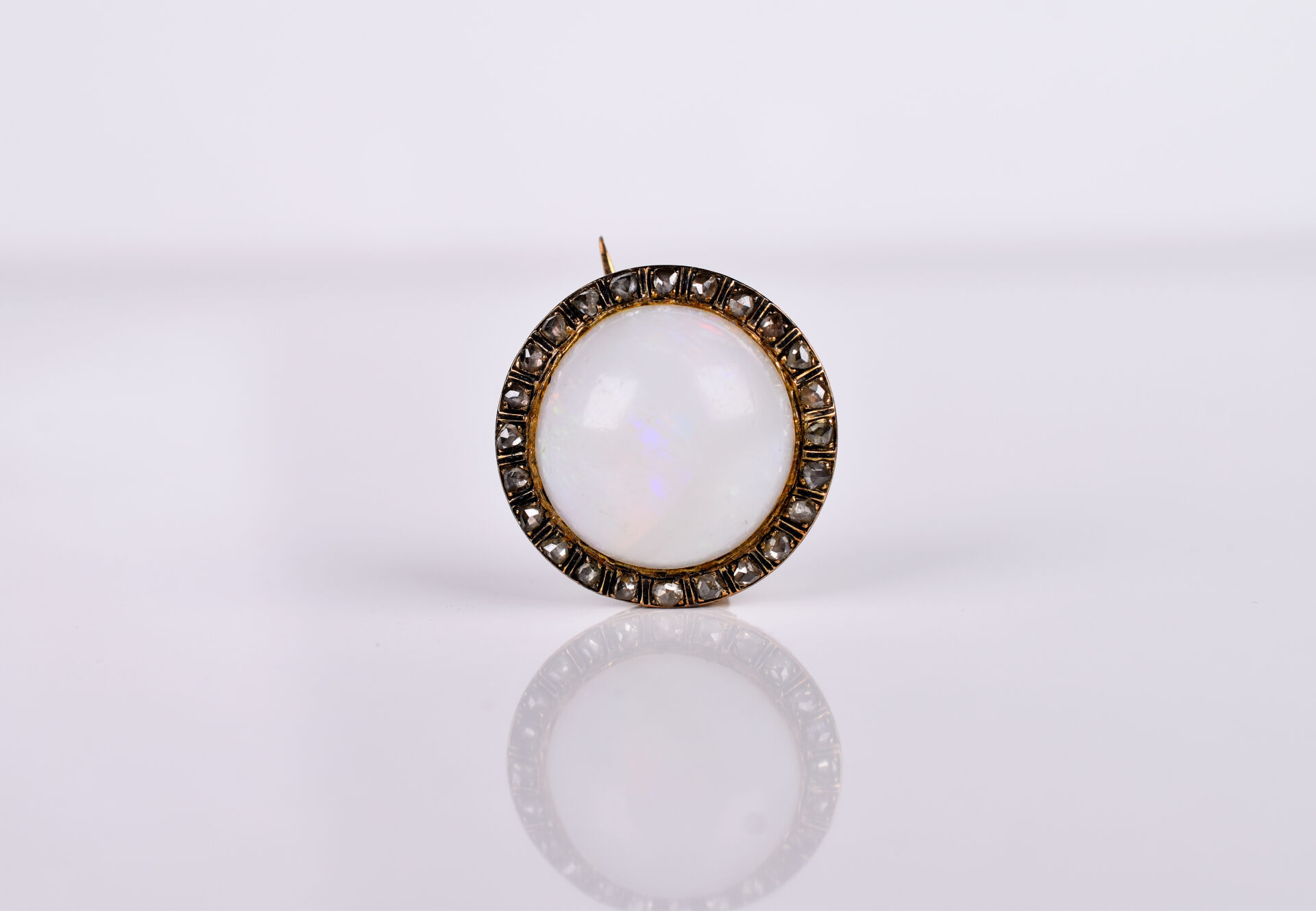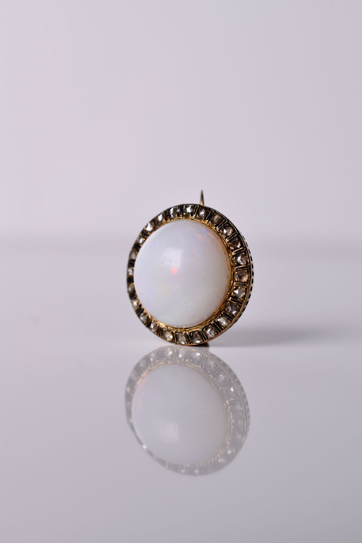 Charmante broche ronde en or 18k 750/1000e centrée d’un cabochon d’opale précieuse (16,5 x 7,5 mm env), dans un entourage d’un ligne de diamants taille rose. Diamètre : 2 cm. Poids brut : 5,7 g