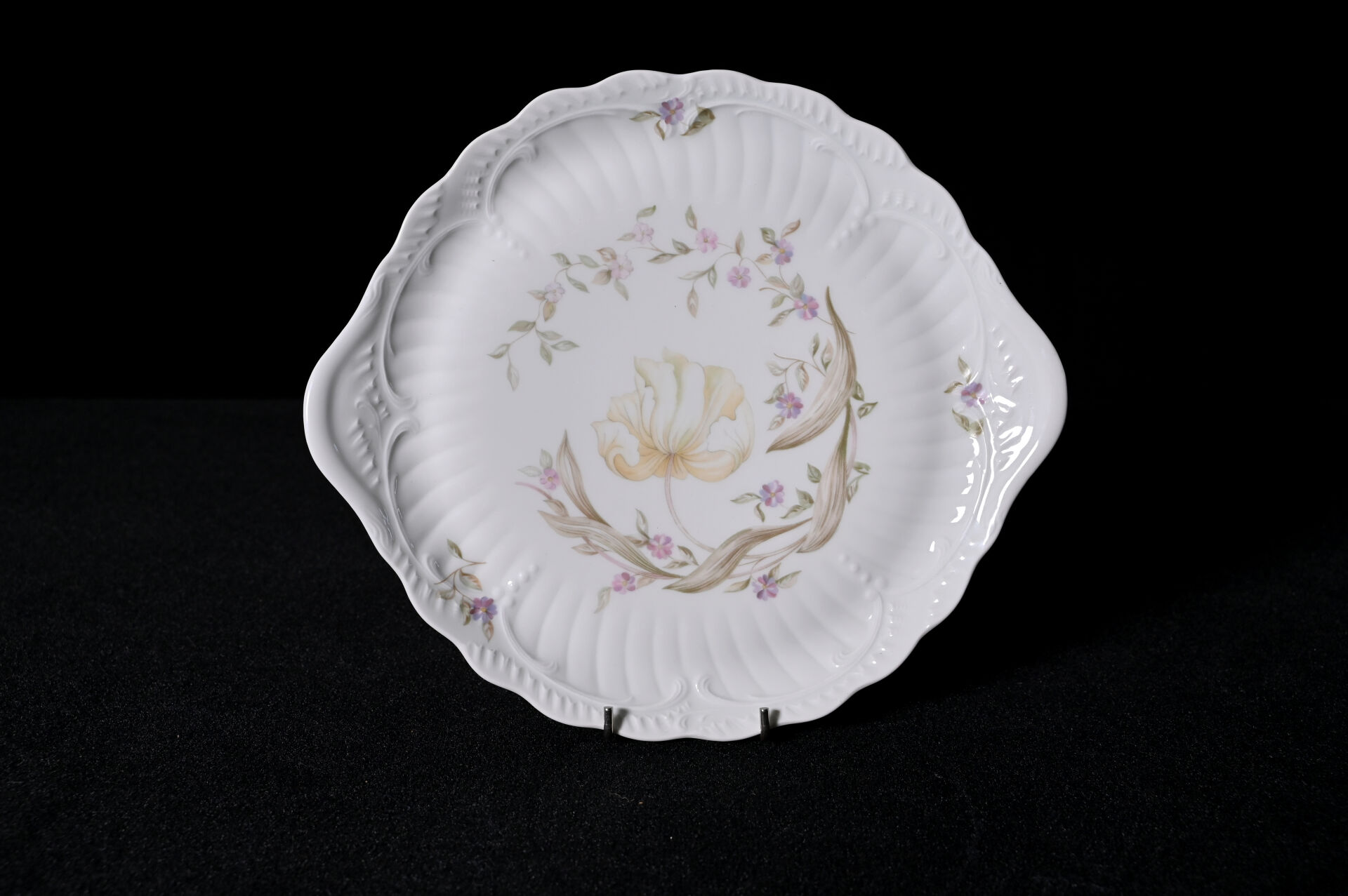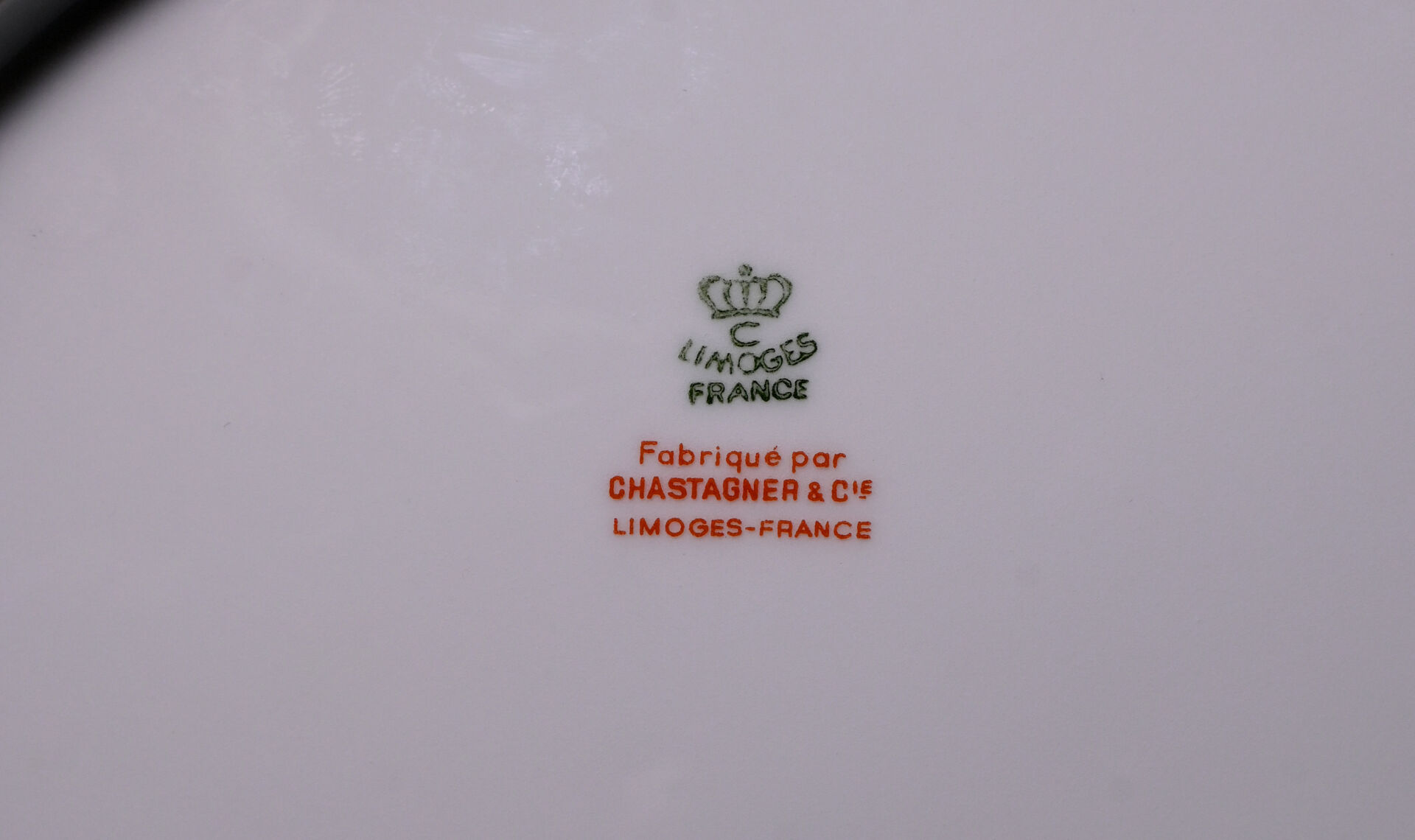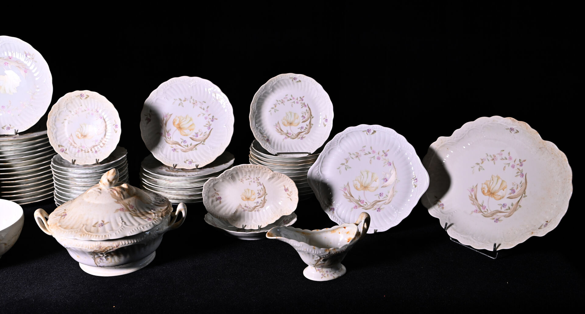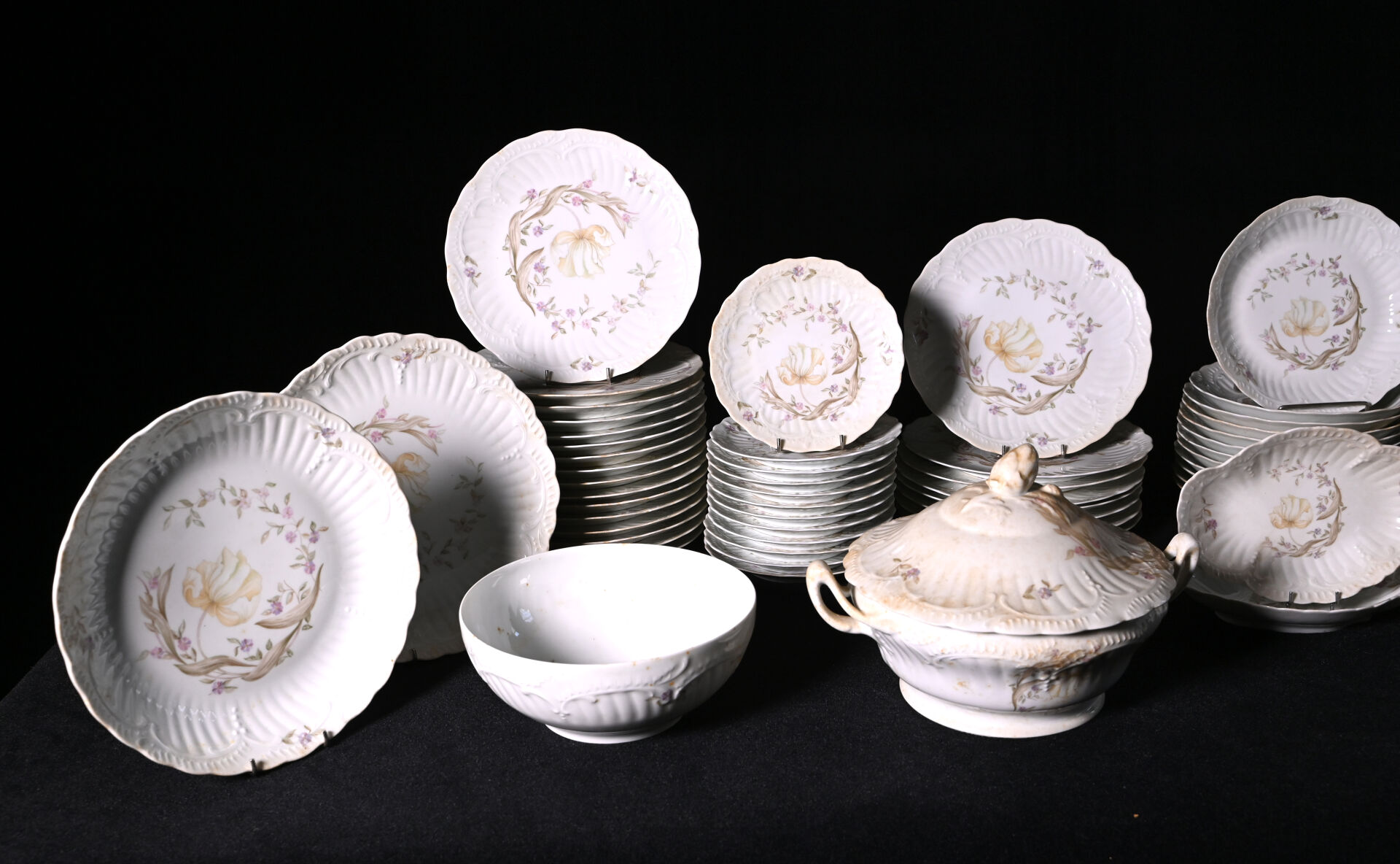 CHASTAGNER & Cie à Limoges. Partie de service de table en porcelaine blanche à décor en polychromie de fleurs. L’aile à décor en relief de godrons et acanthes. Il comprend 24 assiettes plates, 12 assiettes creuses, 12 assiettes à entremets, 3 plats de service ronds, un plat de service ovale, un saladier, une saucière, une soupière, deux raviers. Marqués au dessous.