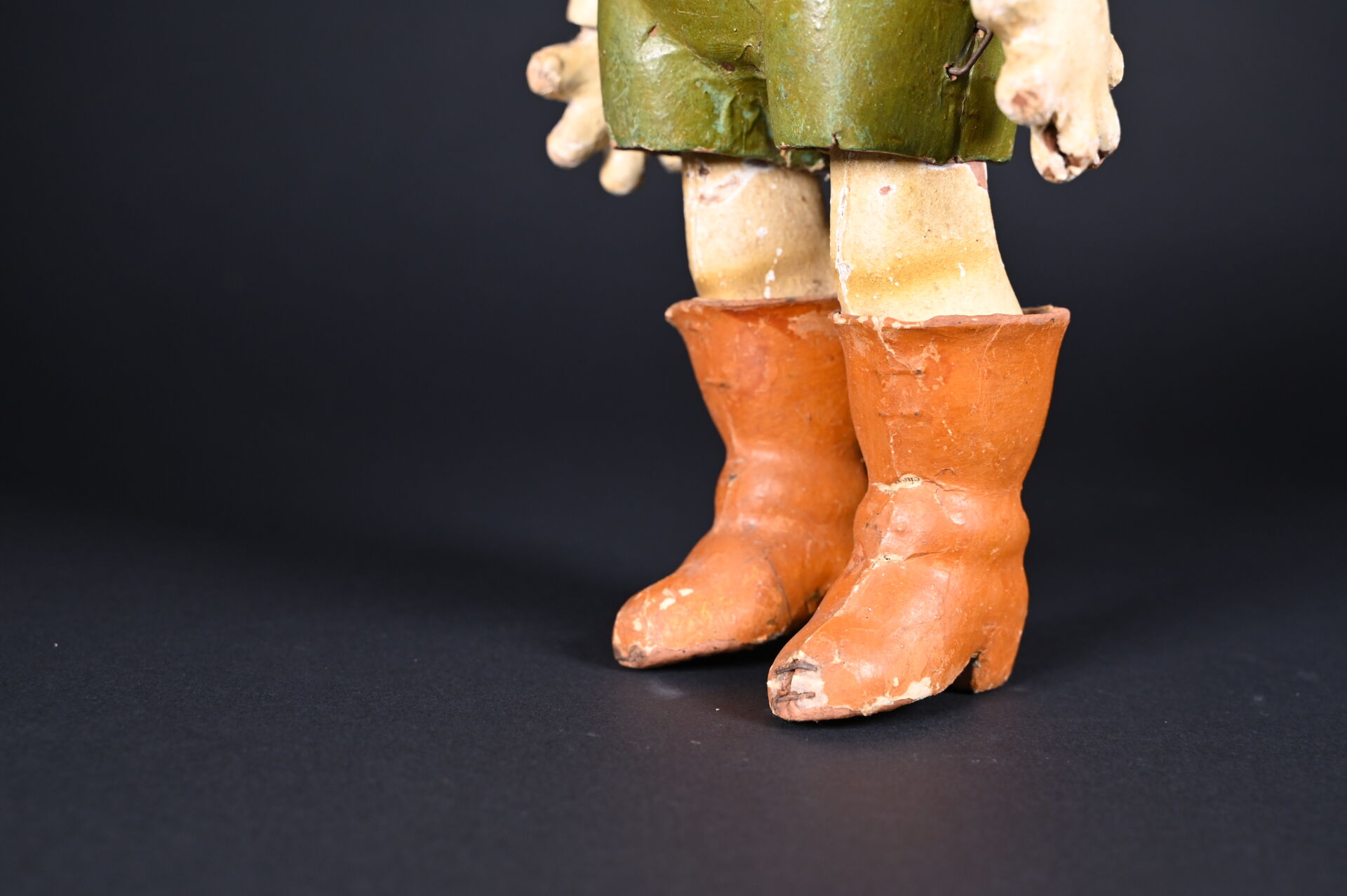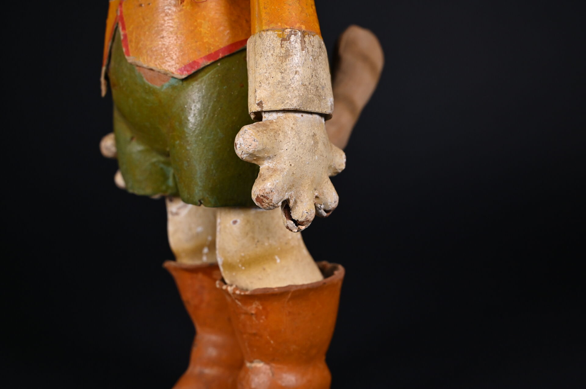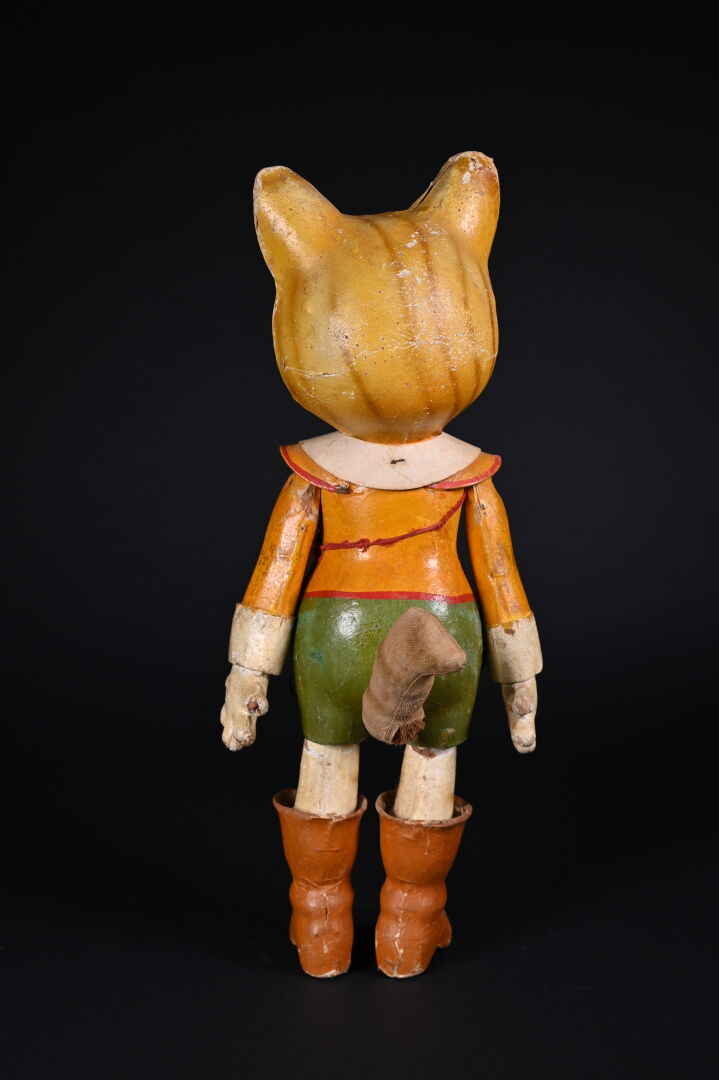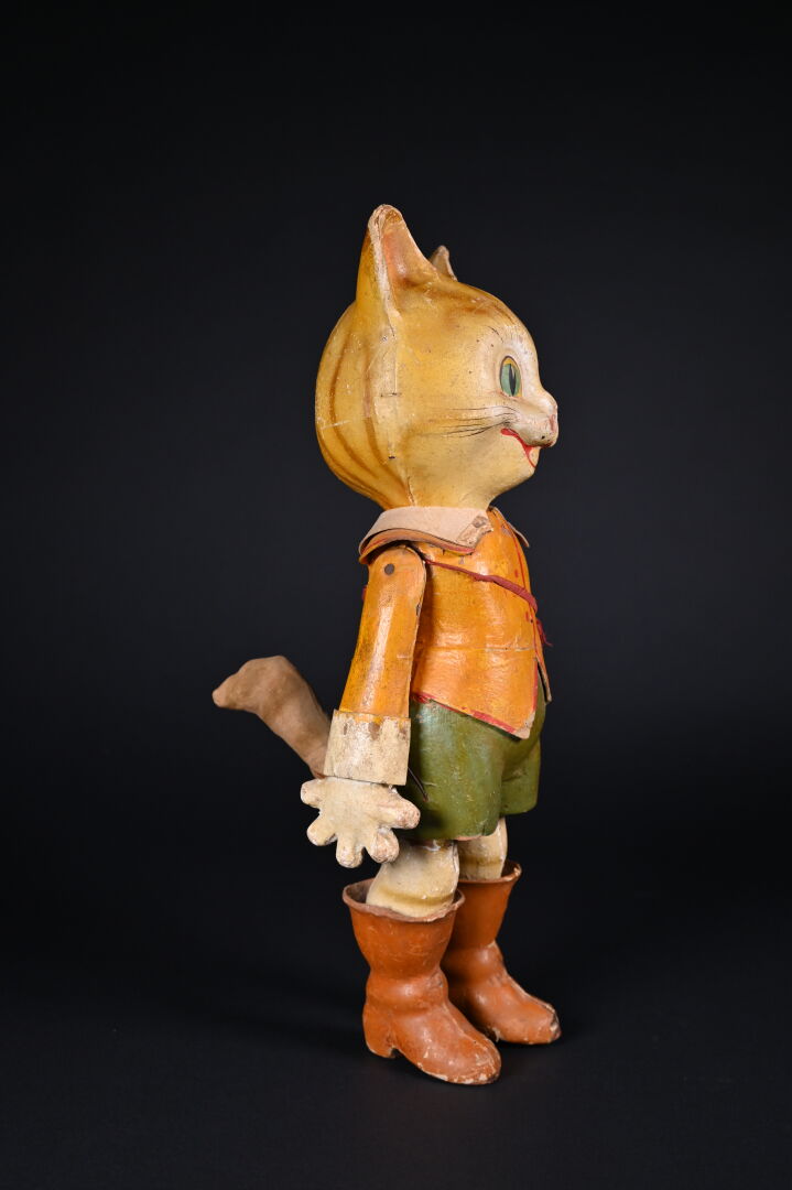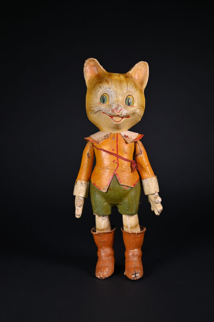 Chat botté en carton cuit issu de la série des Bambins Marcheurs. Fabrication française, par la maison G. César, fondée en 1842. Première moitié du XXème siècle. Bel état de conservation avec ses couleurs d’origine. Haut. : 44 cm.