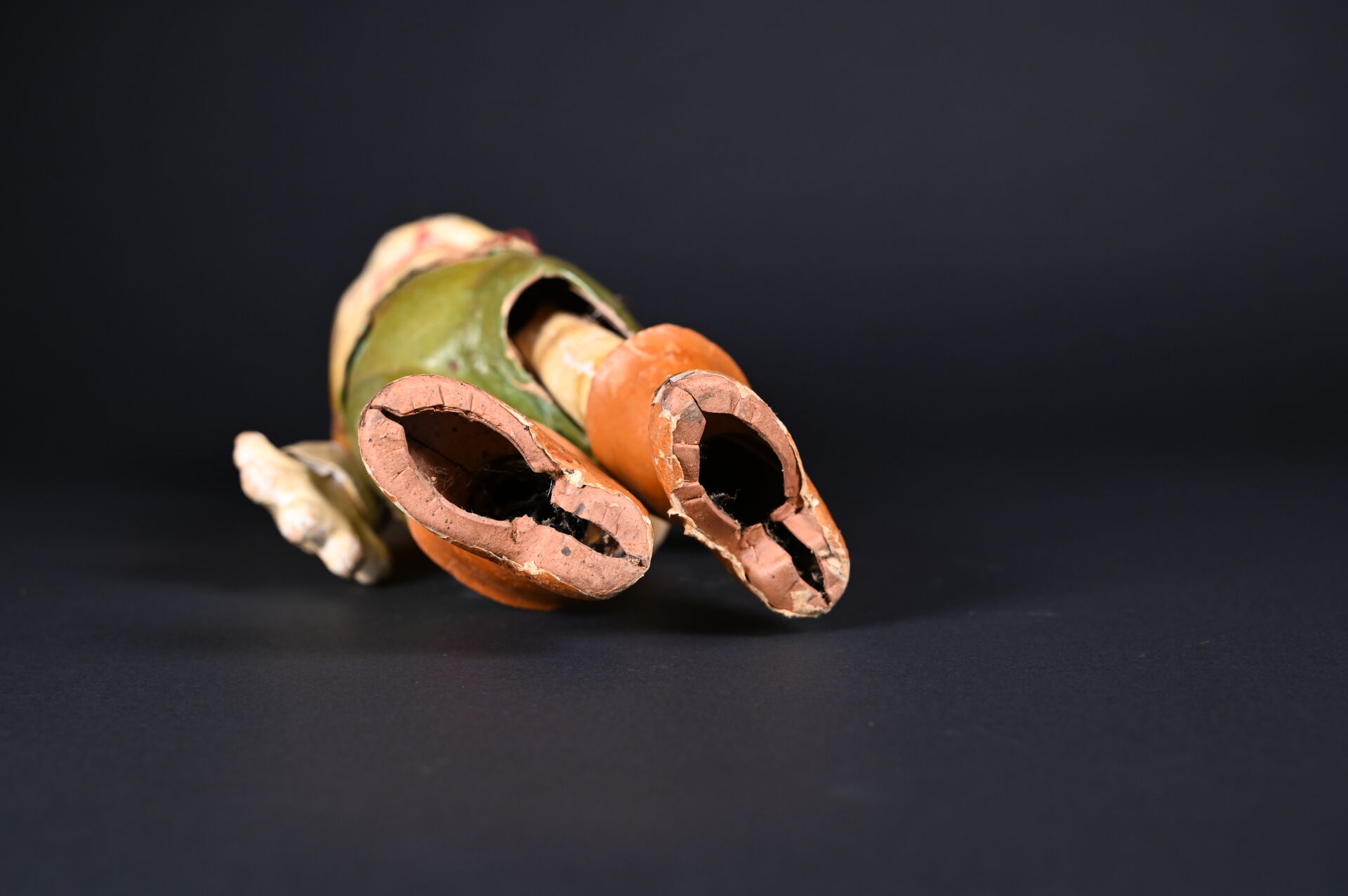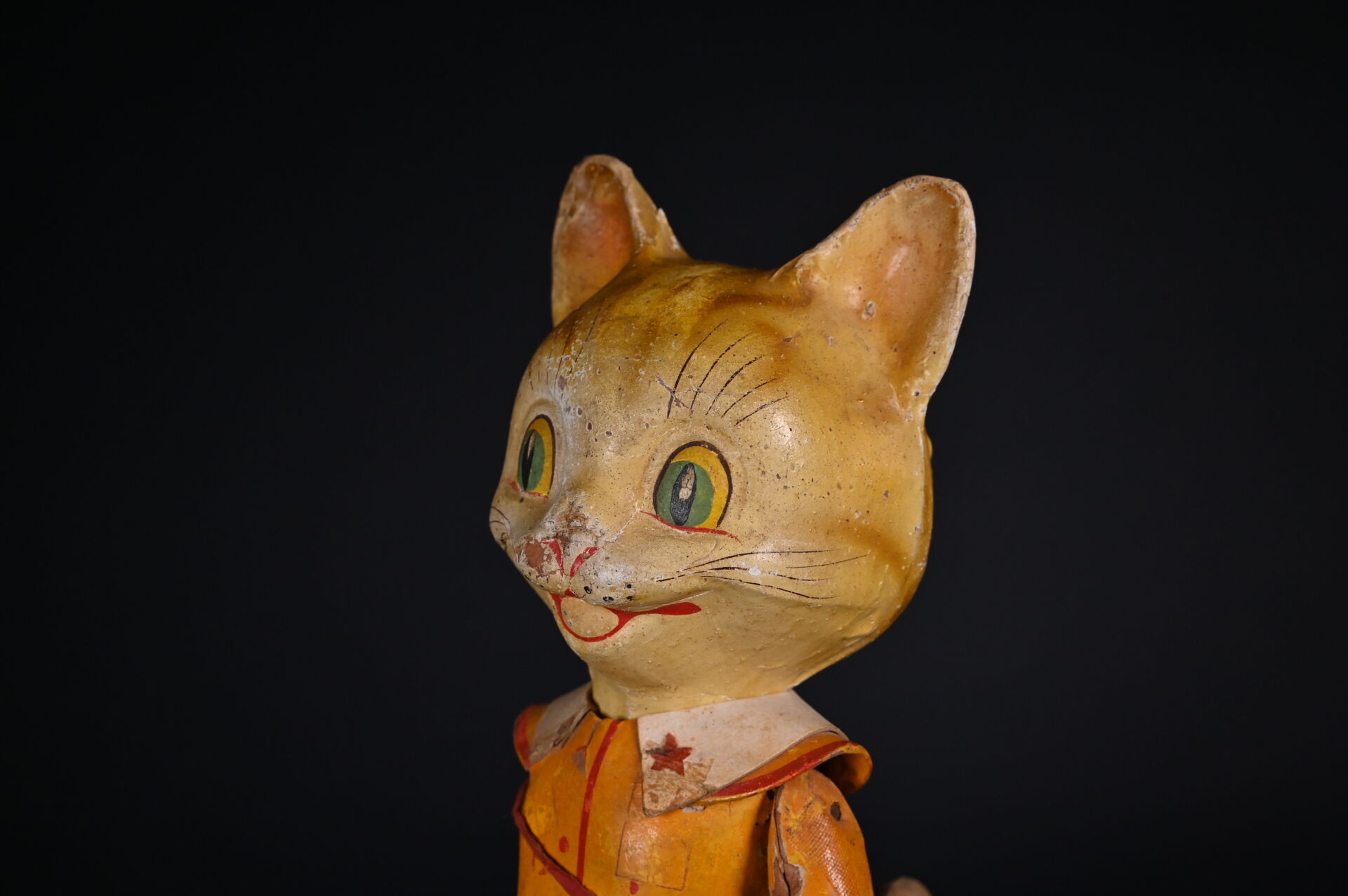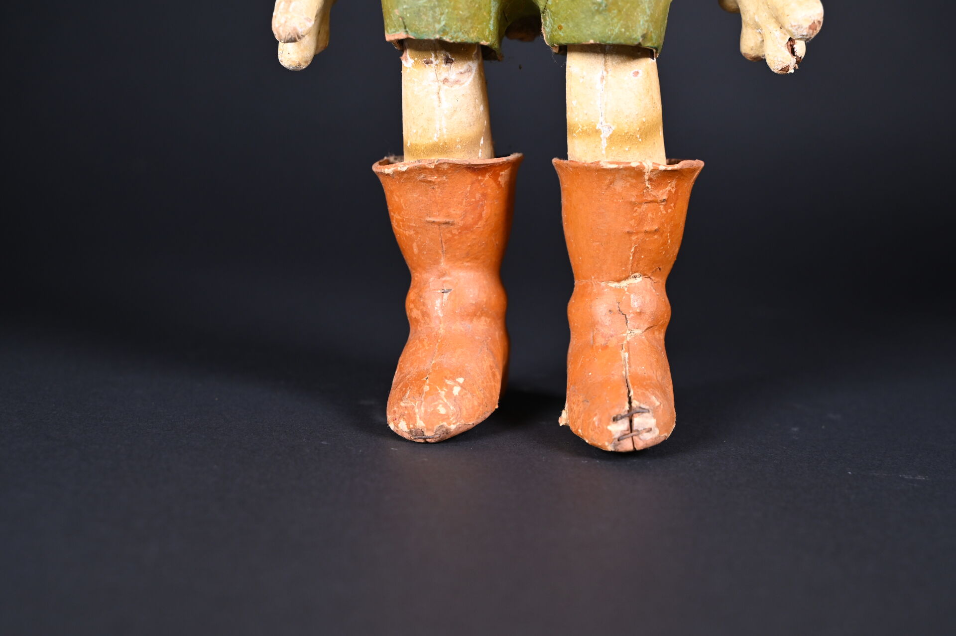 Chat botté en carton cuit issu de la série des Bambins Marcheurs. Fabrication française, par la maison G. César, fondée en 1842. Première moitié du XXème siècle. Bel état de conservation avec ses couleurs d’origine. Haut. : 44 cm.
