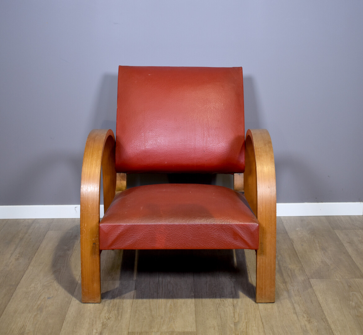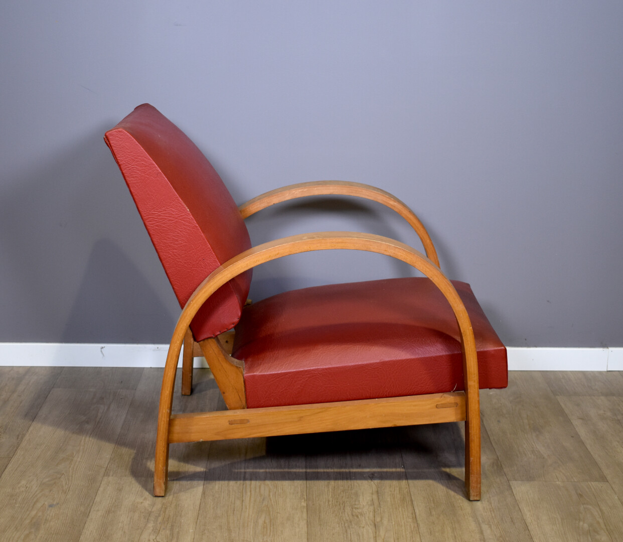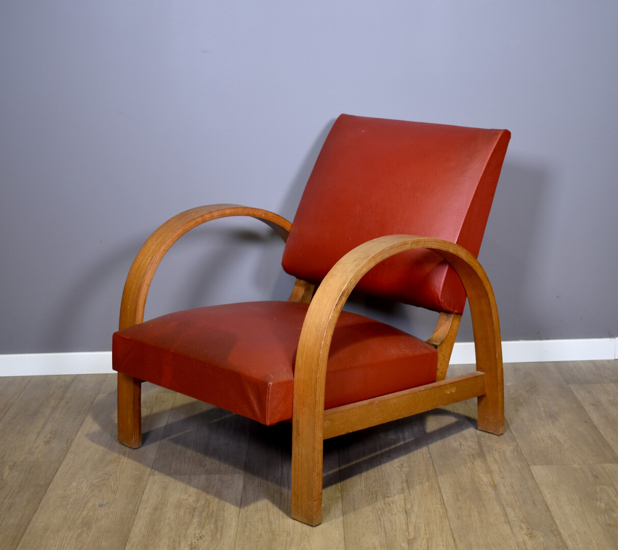 Chauffeuse en bois blond, les accotoirs en arc de cercle. Garniture de skaï grainé rouge. Vers 1950. Haut. : 67,5 cm – Larg. : 60,5 cm – Prof. : 72,5 cm.