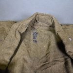 Chemise réglementaire française modèle 1935 en drap écru kaki. Demi boutonnage, bouton en pate de verre kaki. Une poche à soufflet. Etat 1-