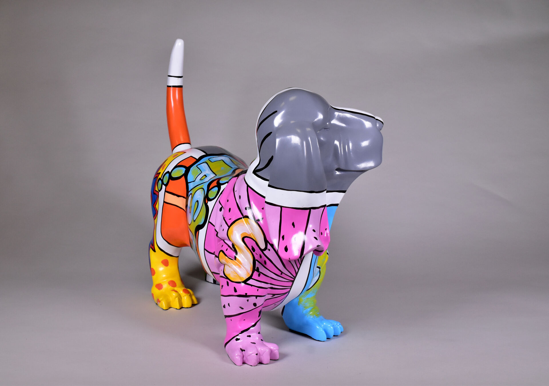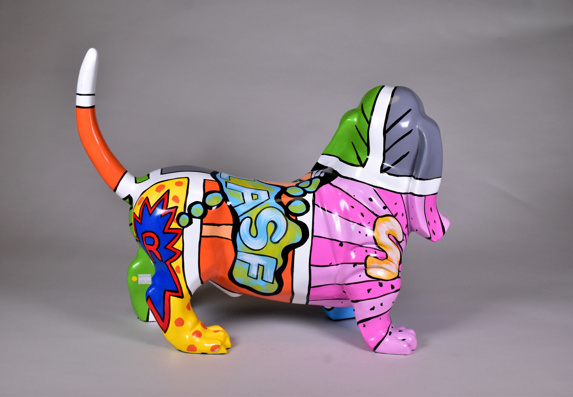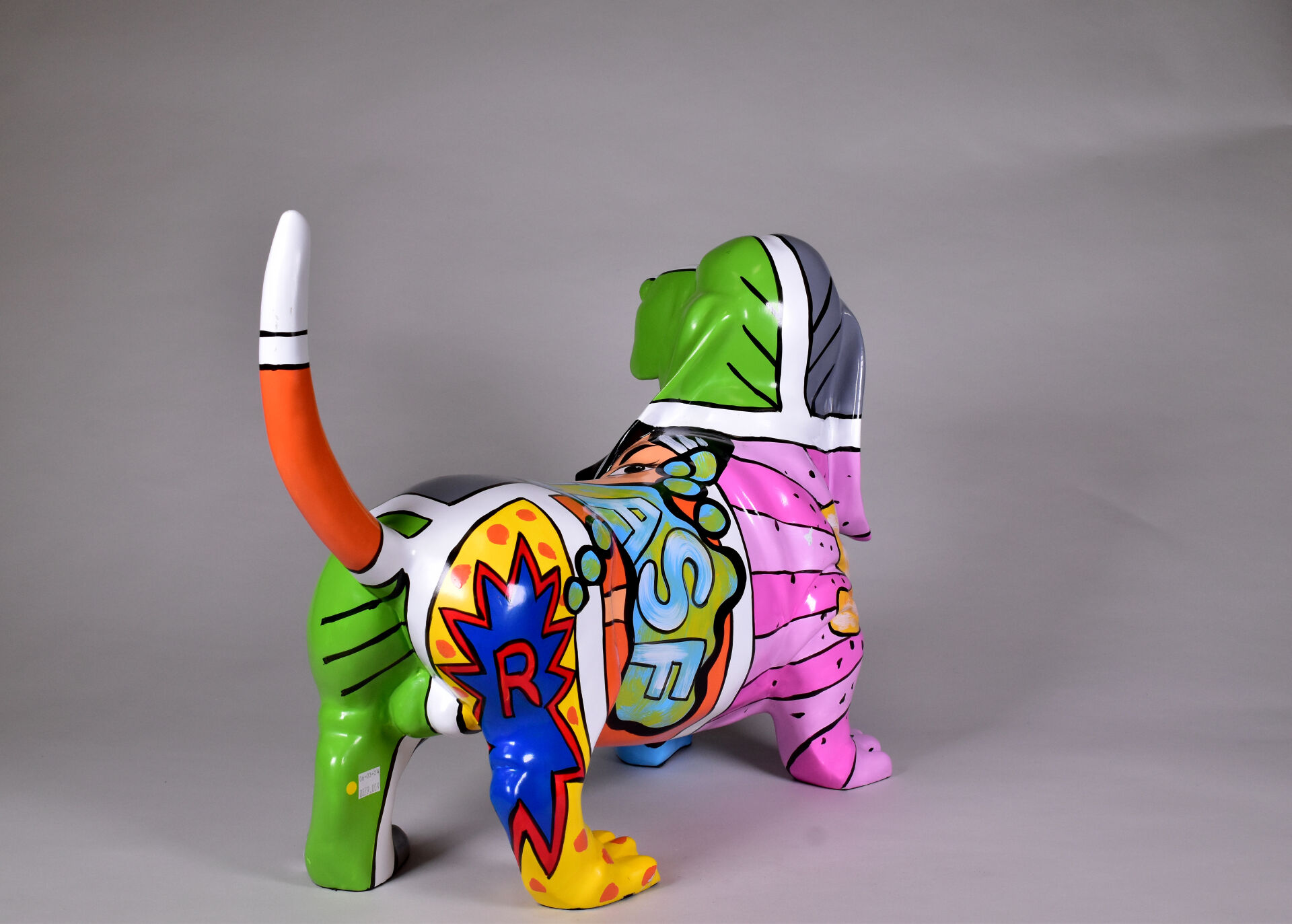 Chien (basset) en résine à décor inspiré de Roy LICHTENSTEIN (petits manques). XXe siècle. Haut. : 42 cm – Larg. : 59 cm.