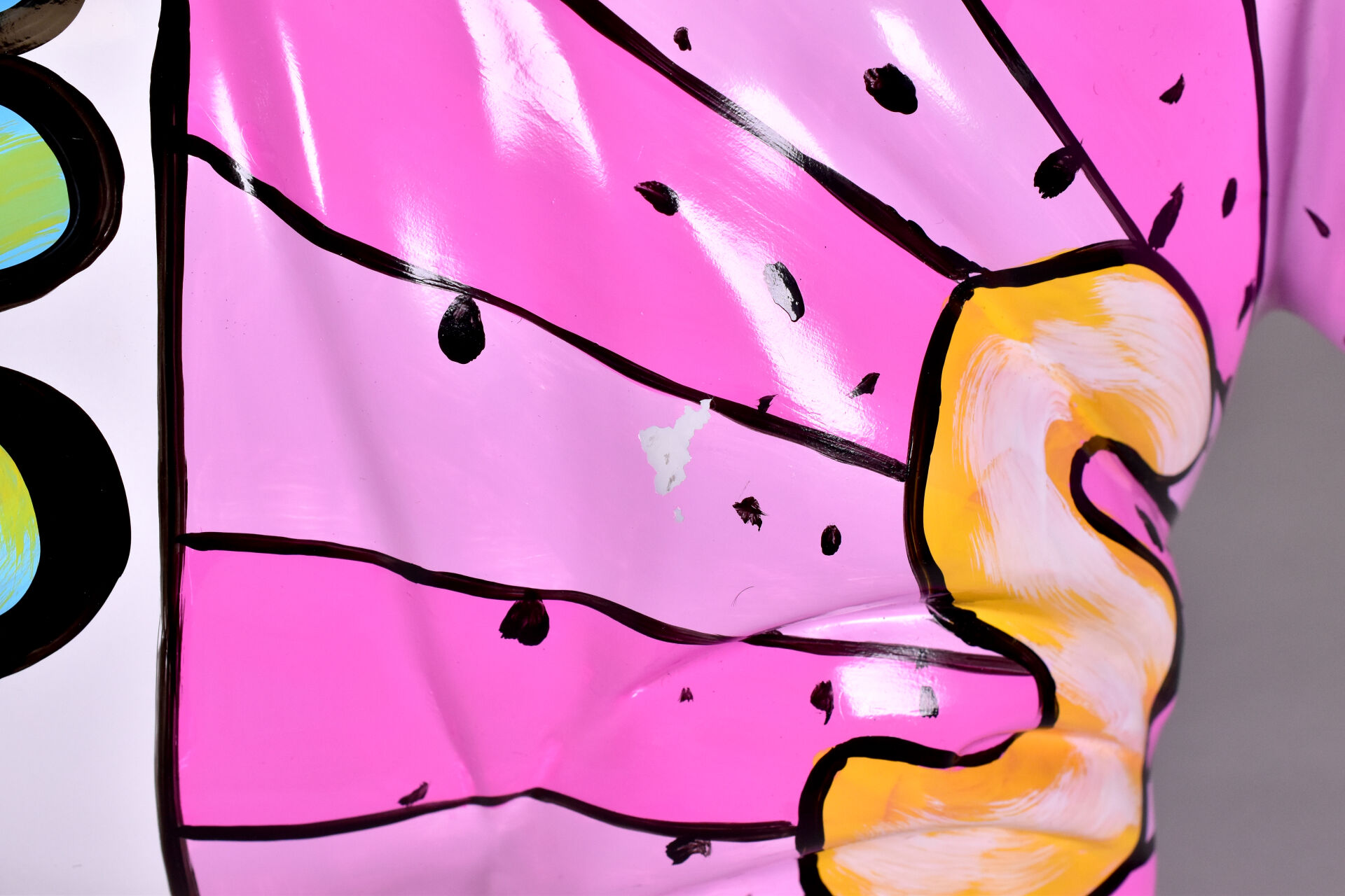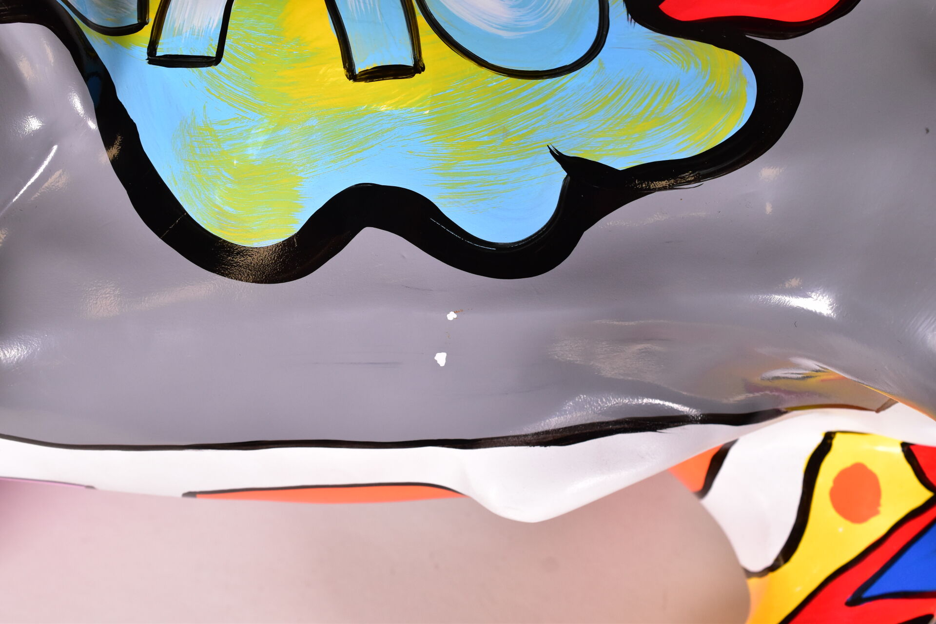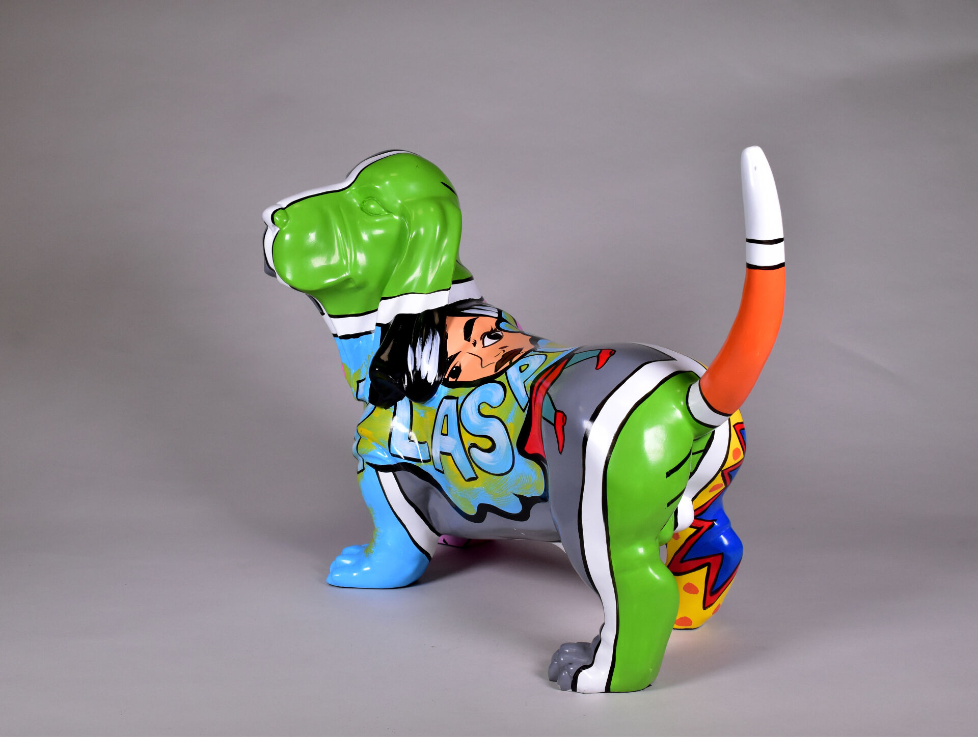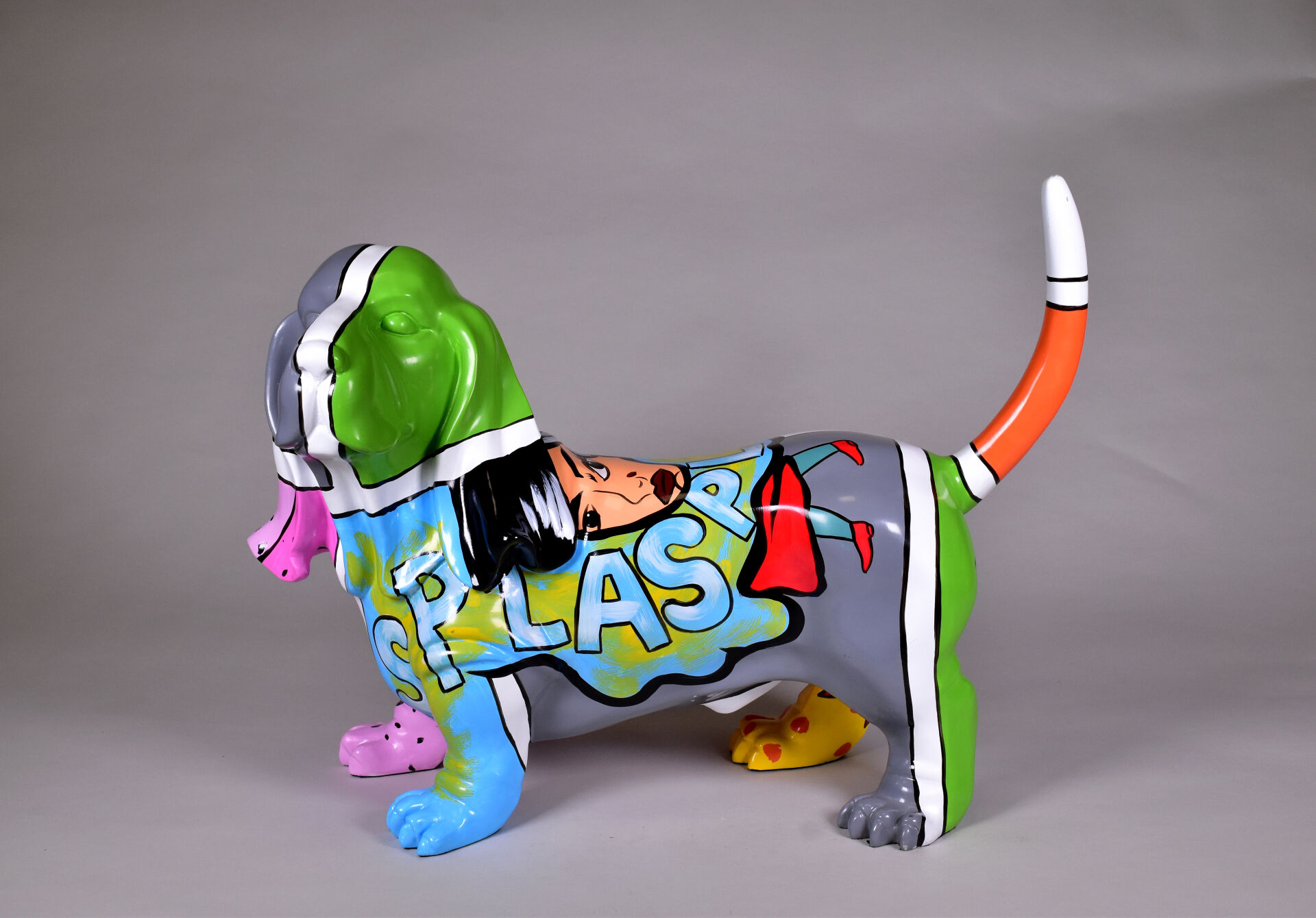 Chien (basset) en résine à décor inspiré de Roy LICHTENSTEIN (petits manques). XXe siècle. Haut. : 42 cm – Larg. : 59 cm.