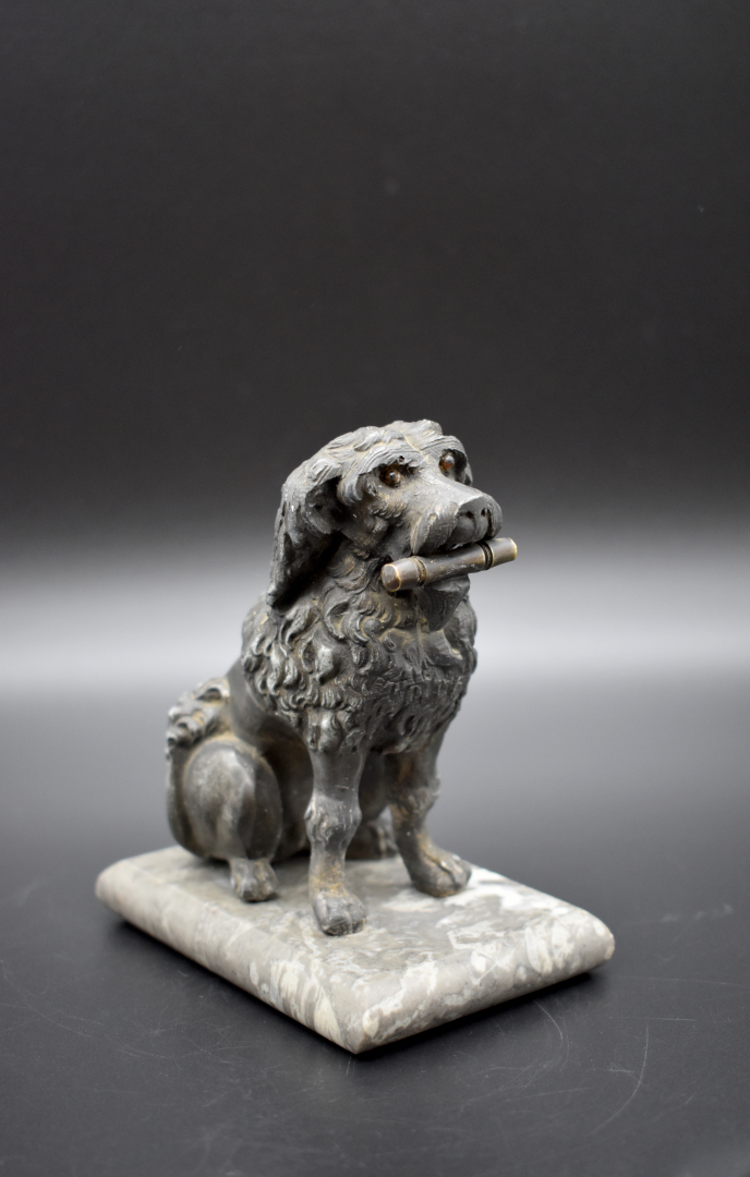 Chien miniature en régule. La base en marbre gris veiné blanc. Haut.: 12 cm.