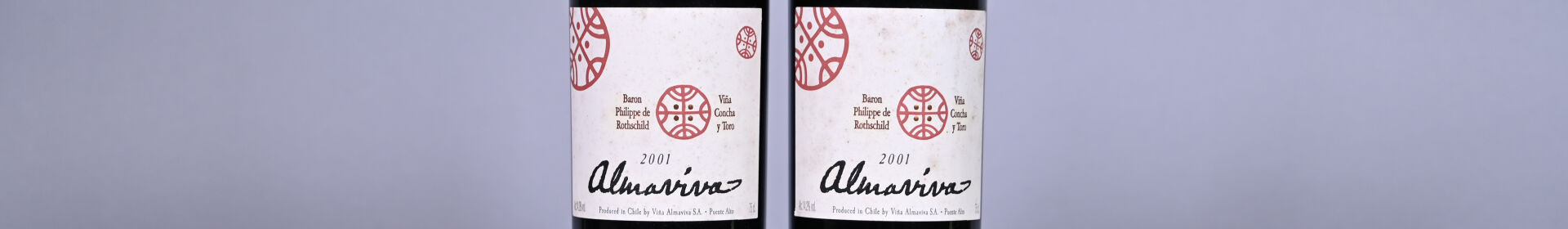 CHILI – 2 bouteilles, Baron Philippe de Rothschild Vina Concha y Toro, Almaviva, 2001. 2 BG. Deux capsules légèrement incurvées. Etiquettes légèrement sales avec des traces d’humidité.