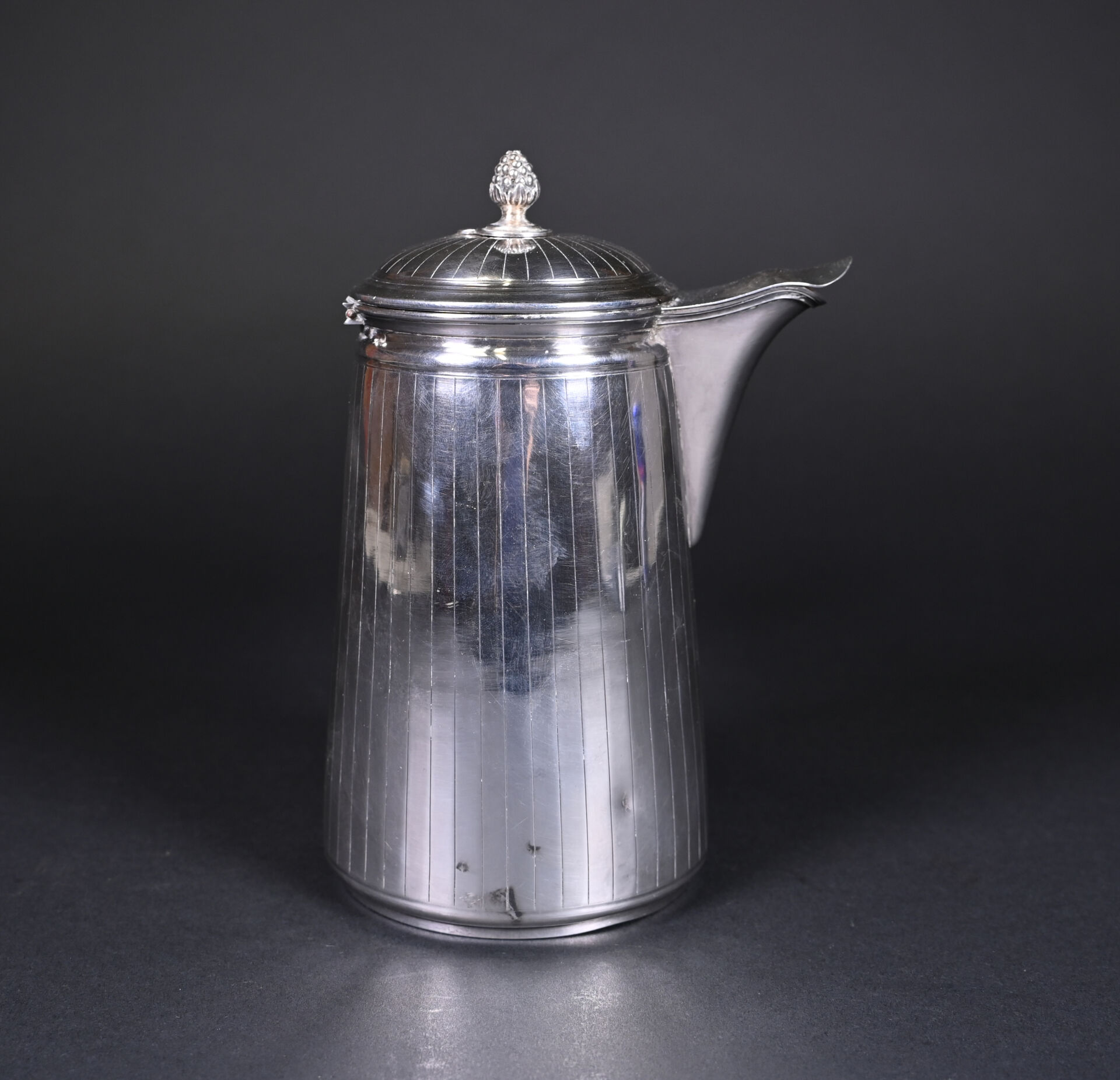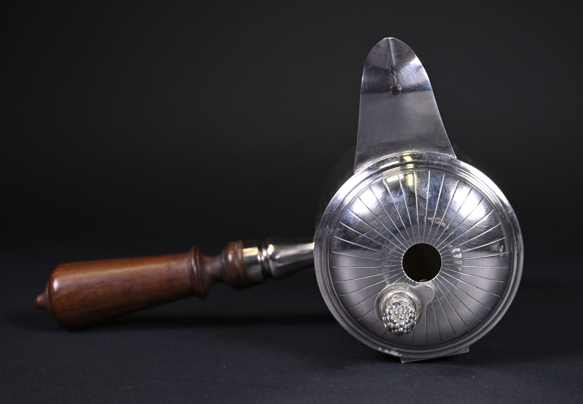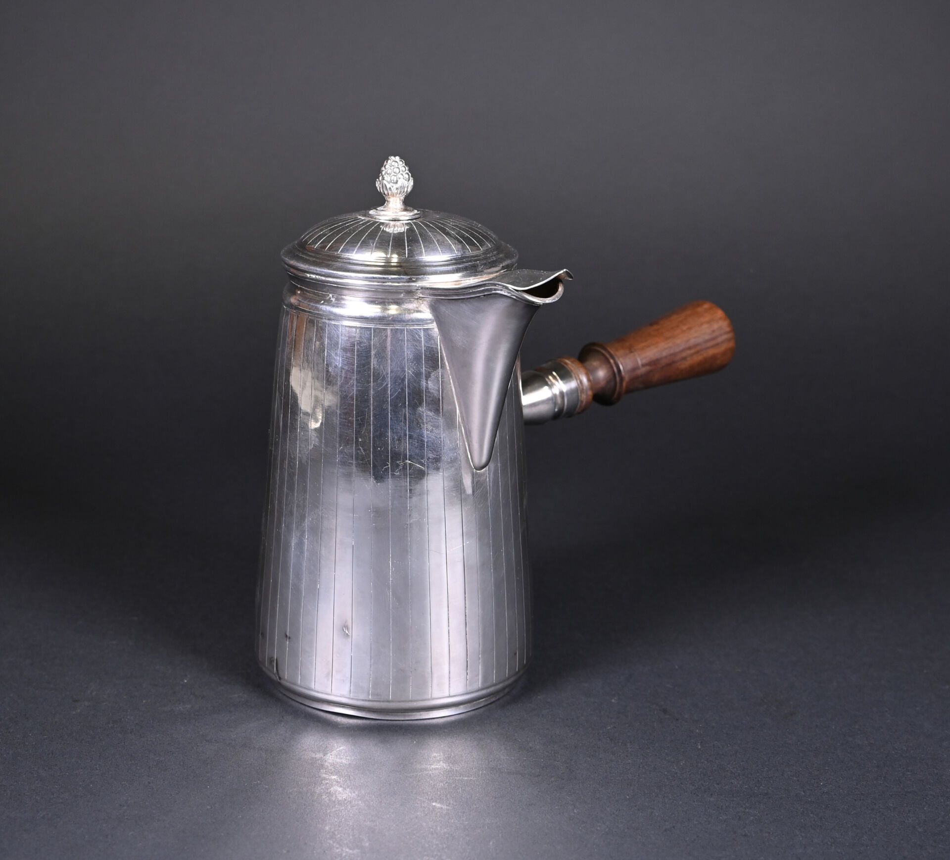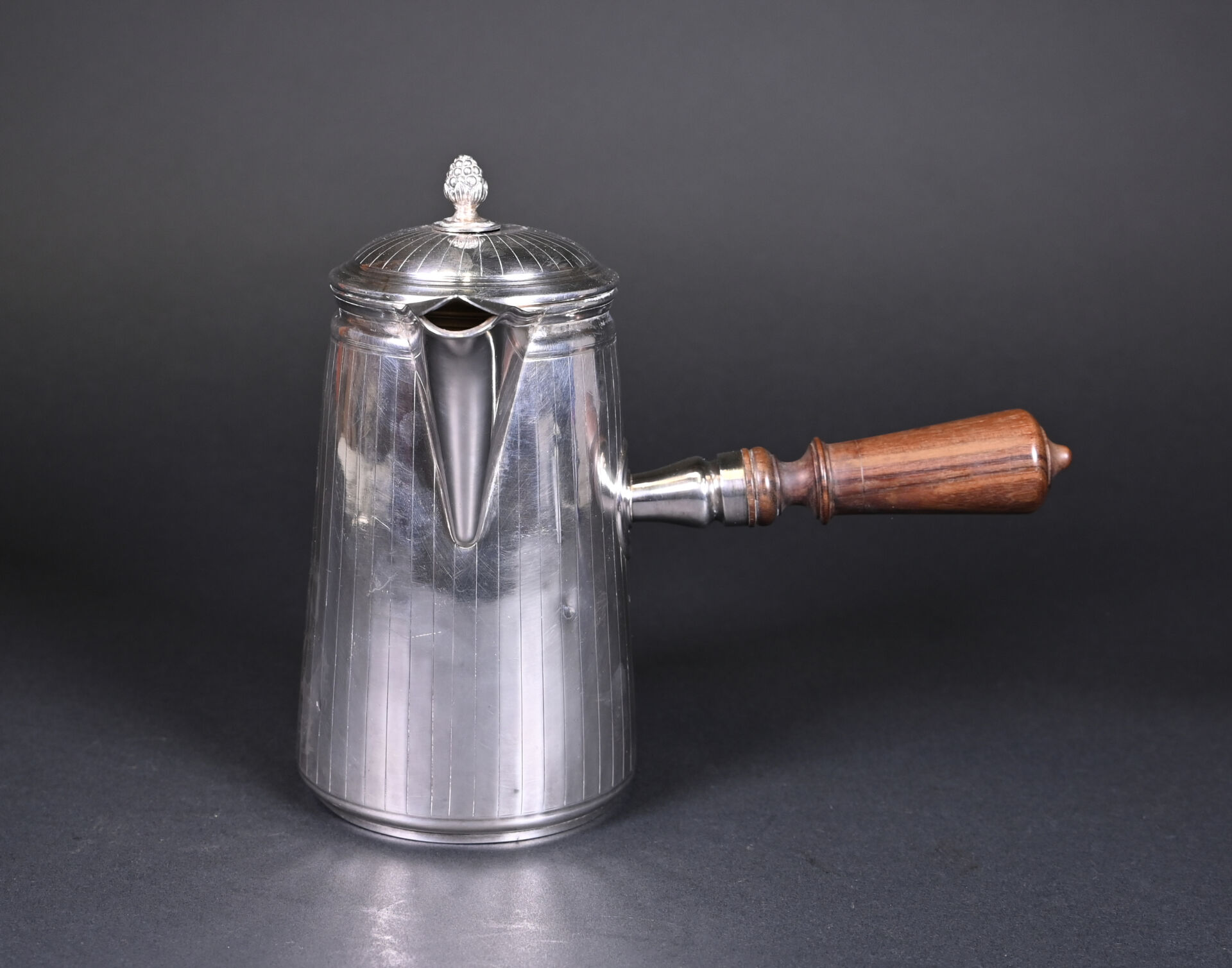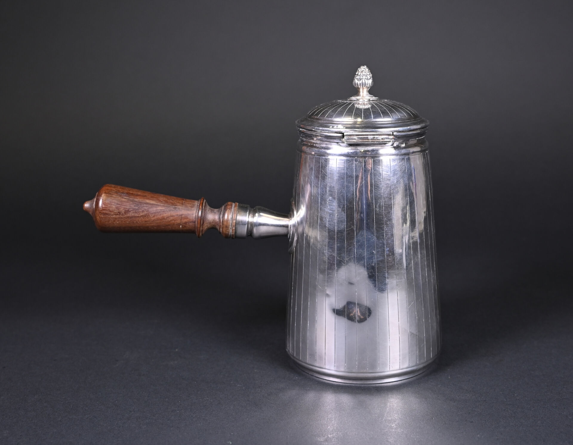 Chocolatière en argent 925/1000e à décor de rayures (chocs). Le manche en palissandre. Haut. : 20 cm Poids brut. : 467 g.