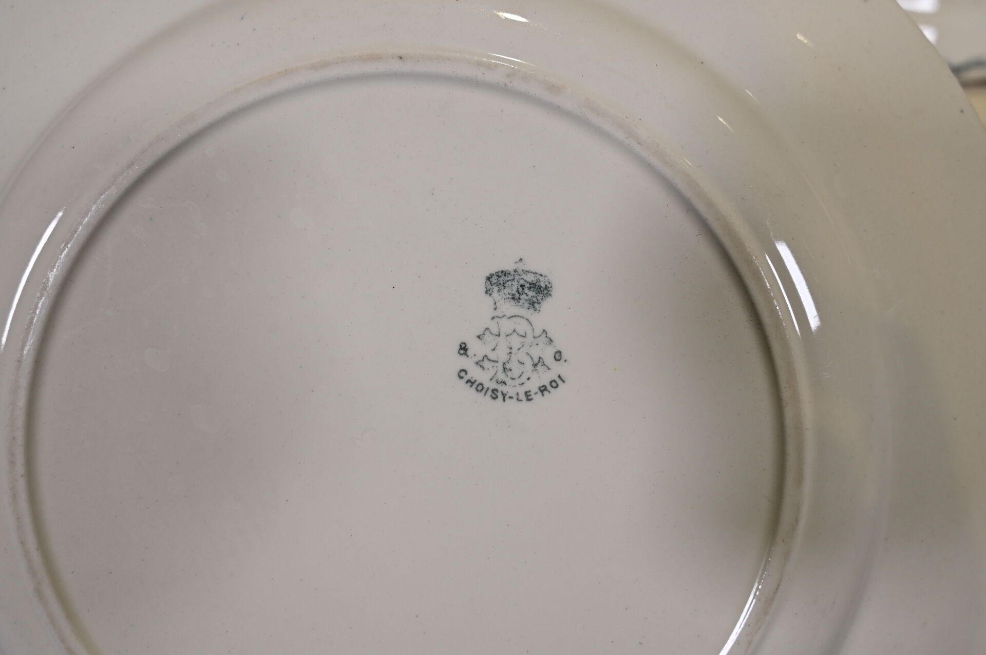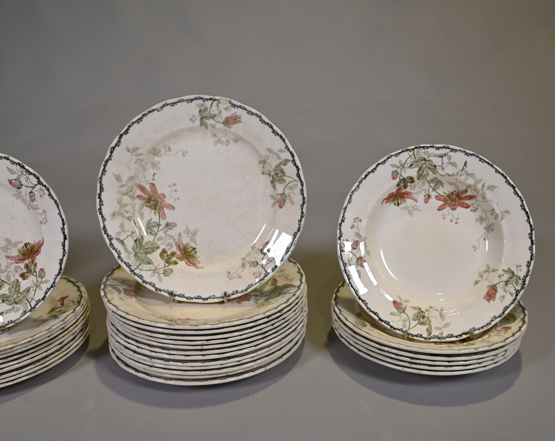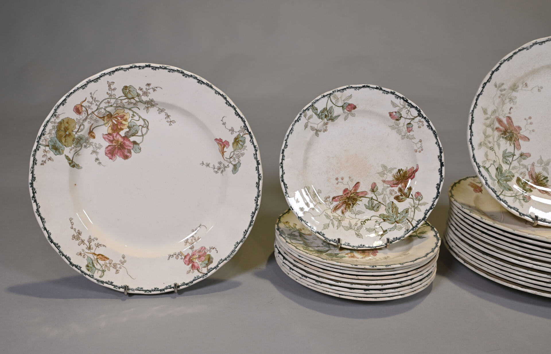 CHOISY-LE-ROI. Partie de service de table en faïence à décor de capucines, ancolies, clématites, bignones, en polychromie comprenant un plat de service rond, 6 assiettes creuses, 10 assiettes à entremets, 13 assiettes plates (usures).