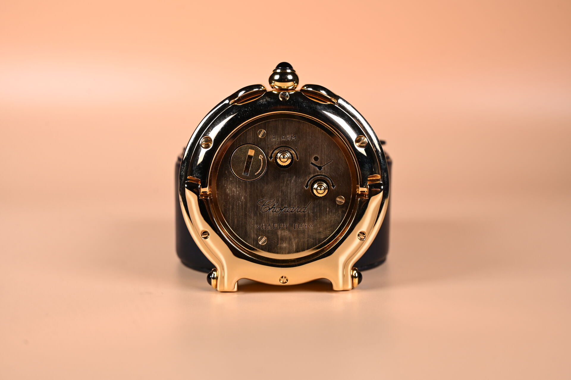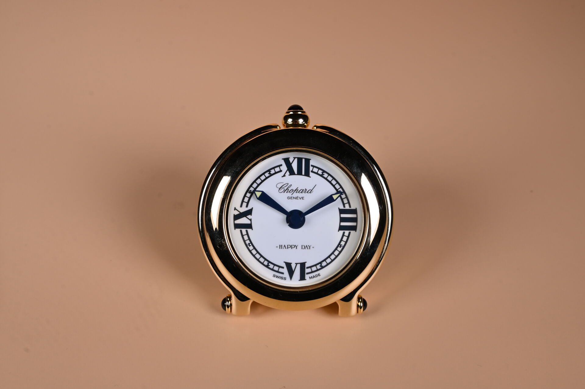 CHOPARD Happy Day. Réveil à poser en métal doré, avec cabochons de pierres bleues. Mouvement quartz (pile à réviser). Ht. 10 cm.Avec sa housse de la maison et sa boîte.