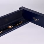 CHOPARD. Montre bracelet de dame modèle HAPPY DIAMOND, boitier rond en or jaune 18K 750/1000e avec verre en renfermant 5 petits diamants. Bracelet en cuir noir d’origine sur boucle ardillon en plaqué or. Boitier 20 millimètres numéroté 377597 4112. Mouvement quartz. Poids brut. : 16,2 g. Elle est vendue dans son écrin d’origine avec bracelet interchangeable en cuir bleu et ses deux remontoirs en métal doré.