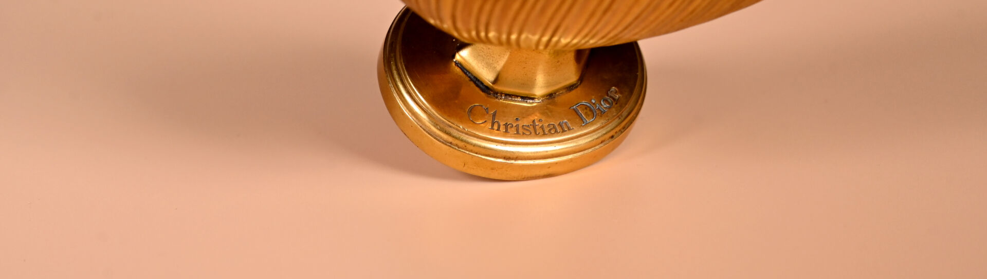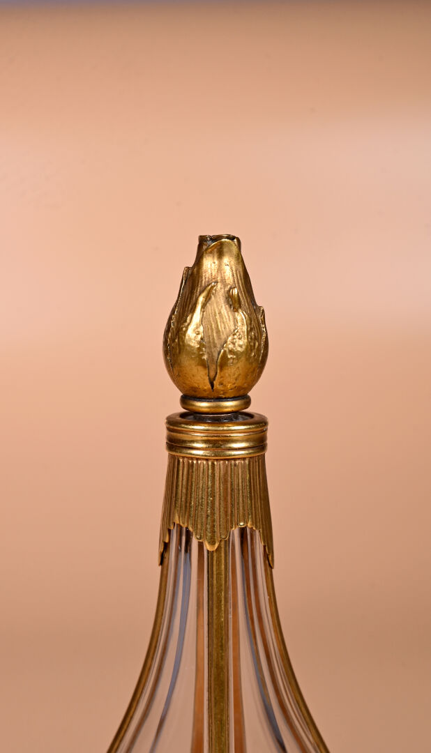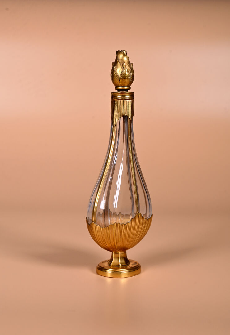 CHRISTIAN DIOR – « Diorling » – (1963). Luxueux flacon en cristal incolore soufflé pressé moulé de Baccarat habillé de bronze doré, figurant une amphore sur piédouche, sa panse habillée d’une coquille, col habillé de bronze, son bouchon en bronze doré figurant un bouton de rose. Titré. Haut. : 18 cm.
