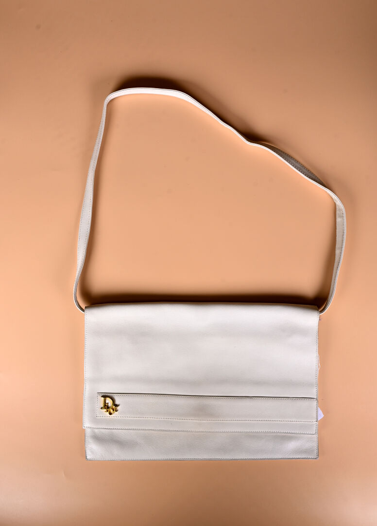 CHRISTIAN DIOR. Petit sac en cuir crème. Fermoir à rabat avec logo Dior en doré sur un coté (usures, ne s’ouvre pas). 19,5 x 29,5 cm.
