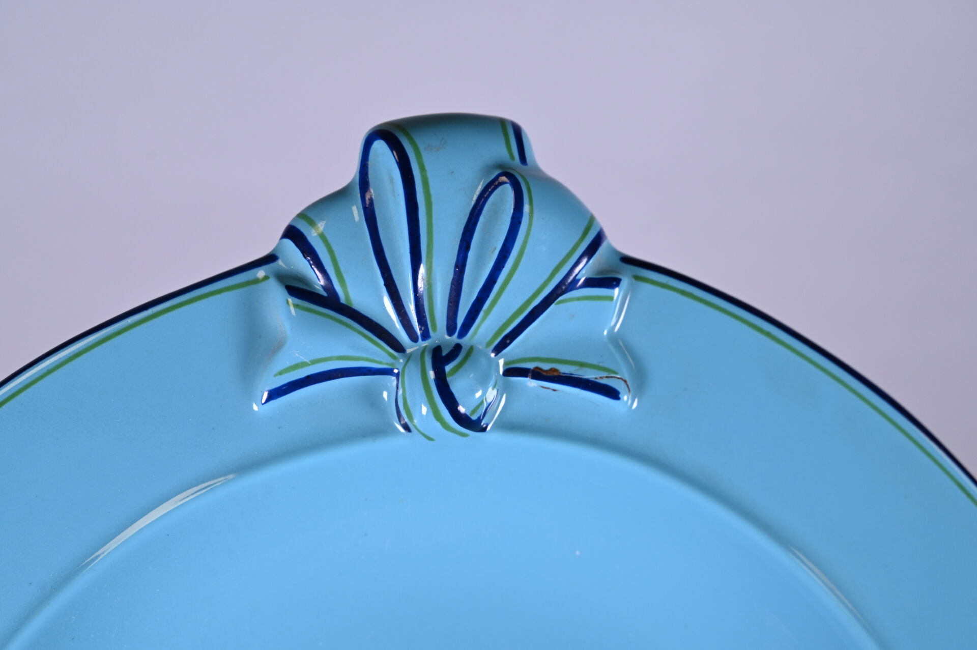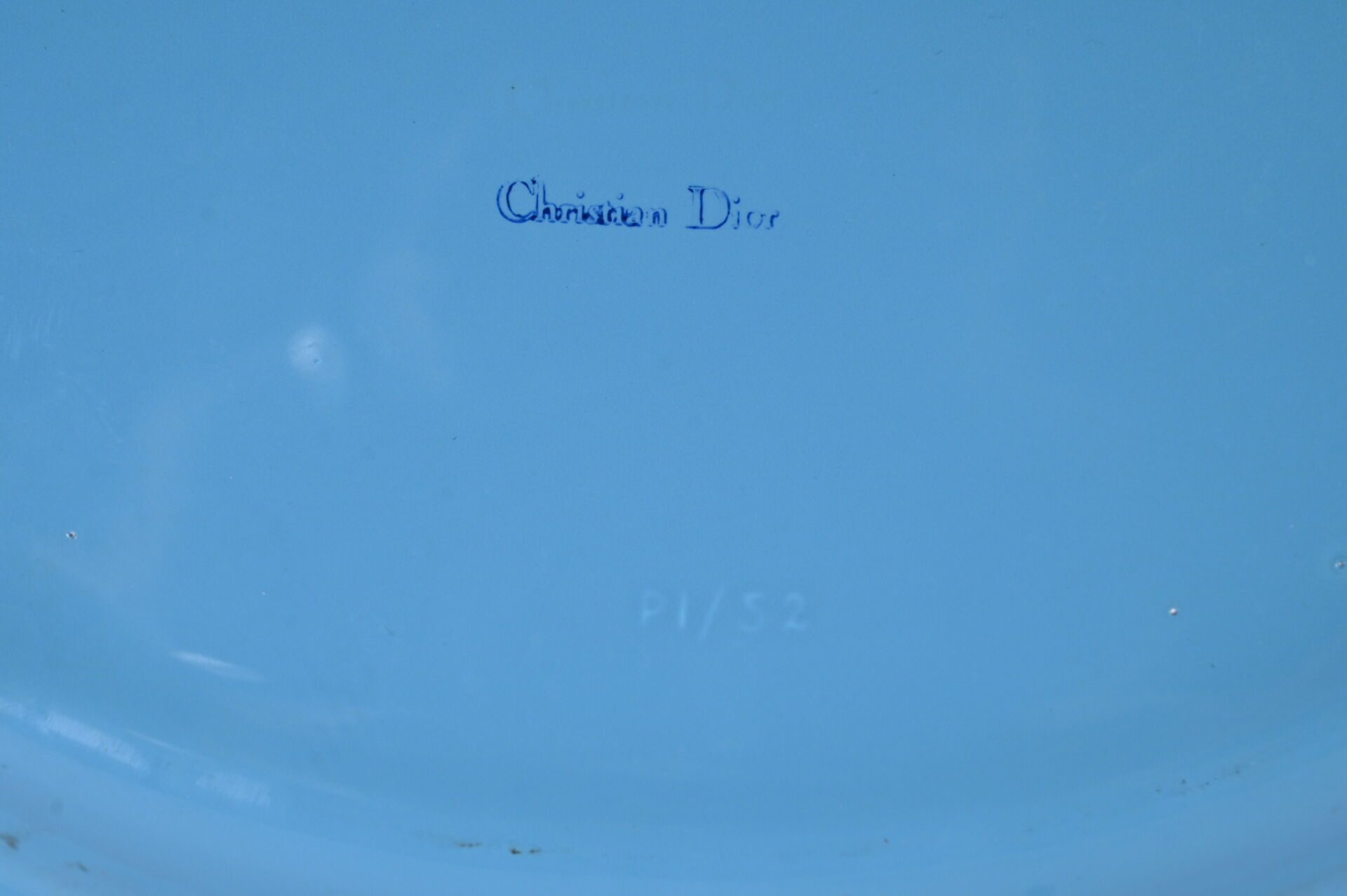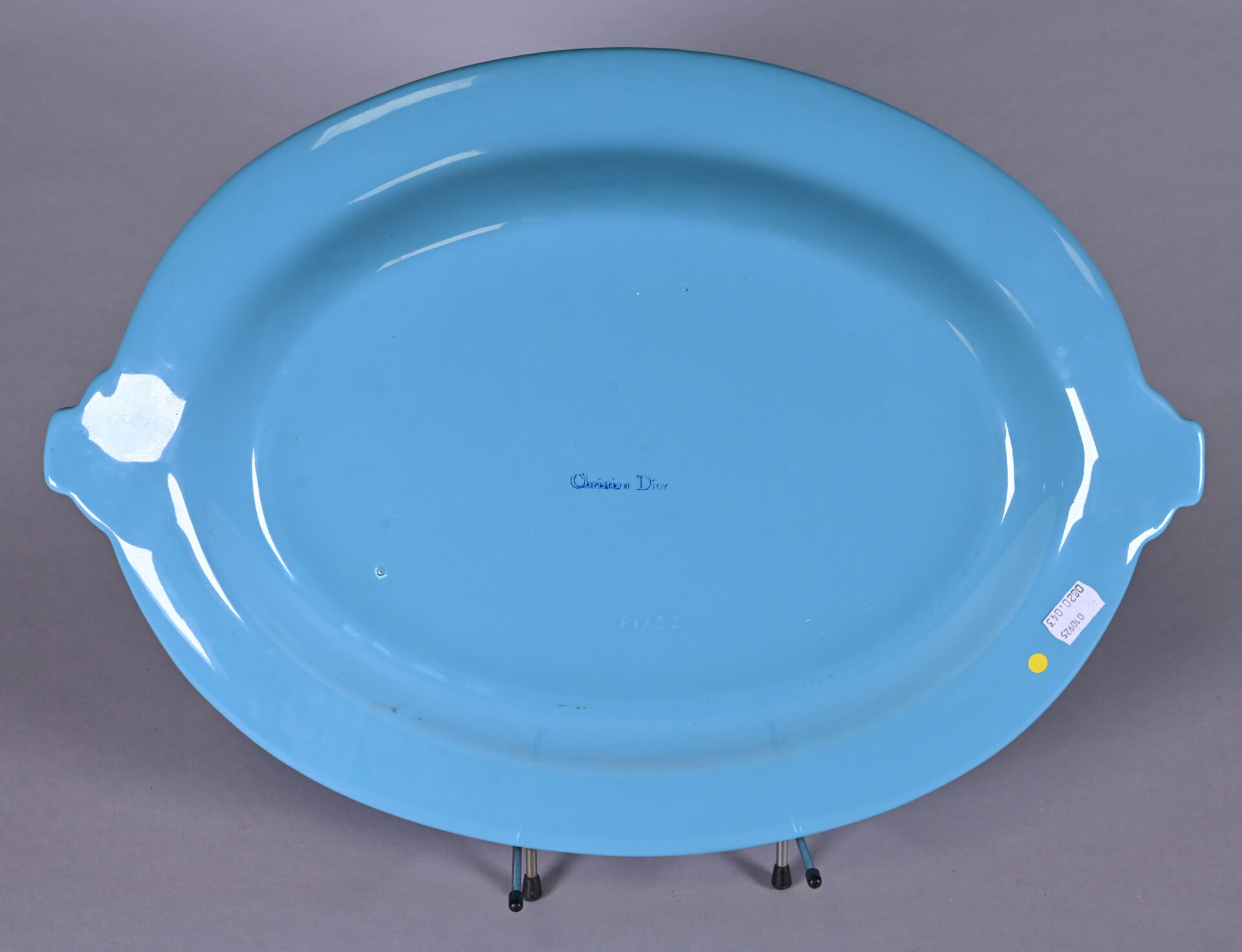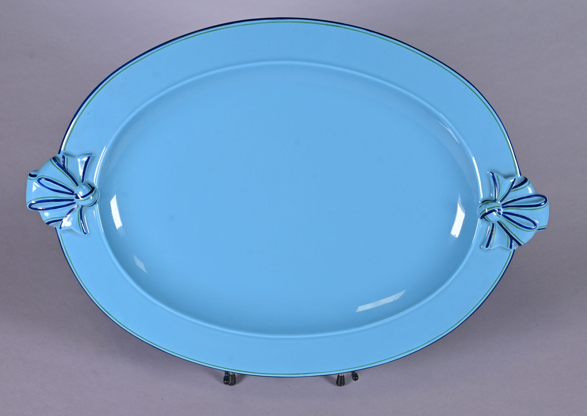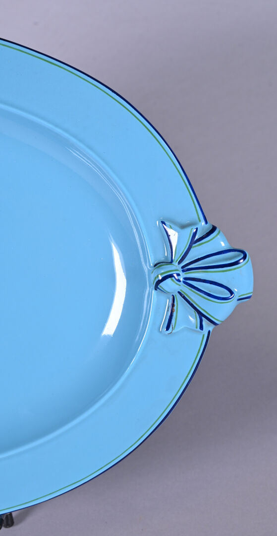 CHRISTIAN DIOR. Plat ovale en faïence émaillée bleue à décor de rubans noués sur les prises (un éclat recollé). Marqué au dessous. 49 x 34,5 cm.