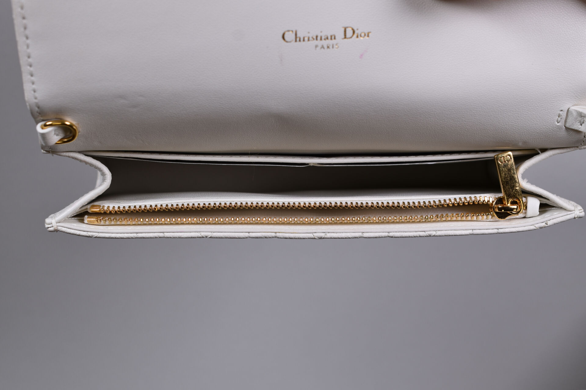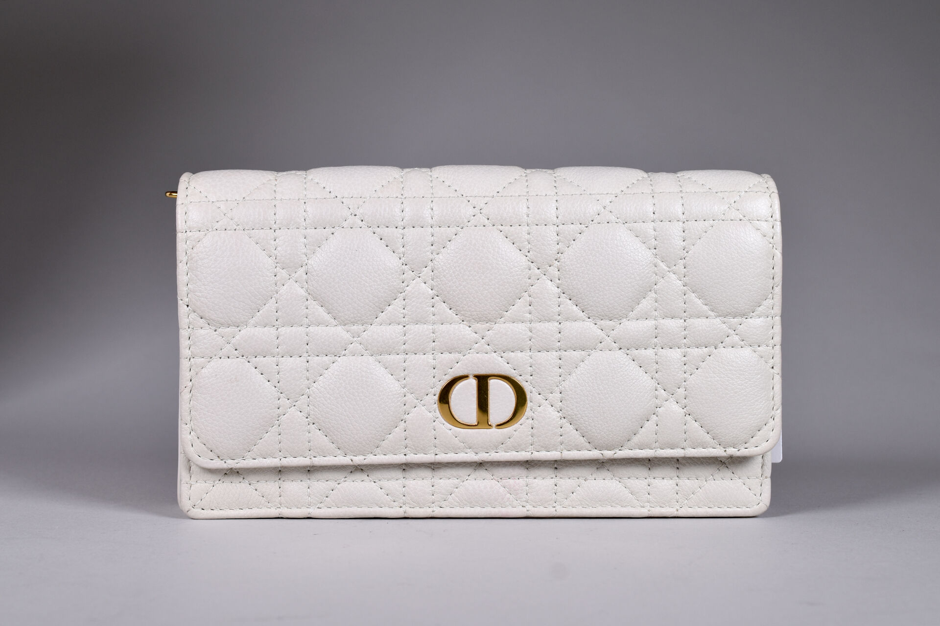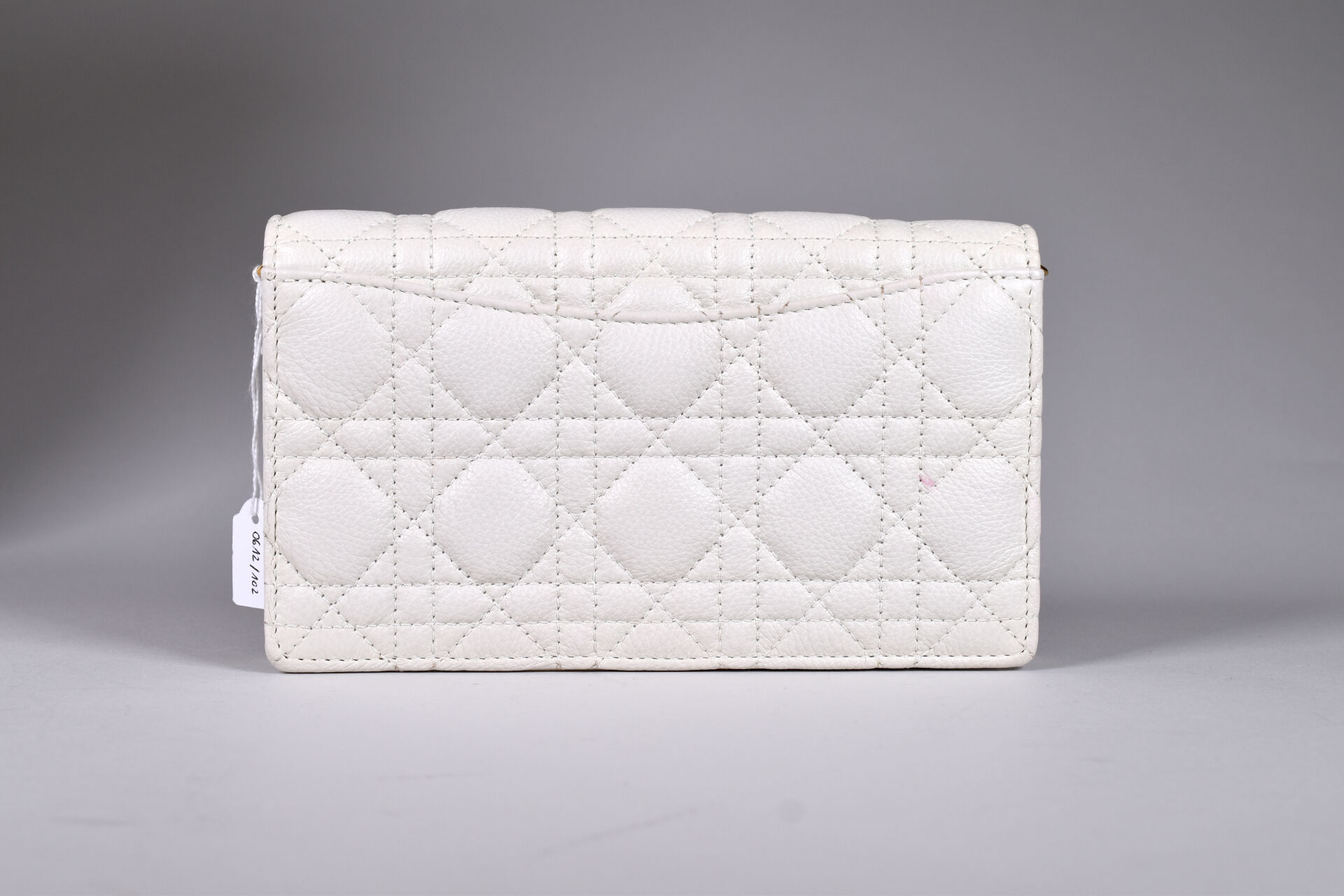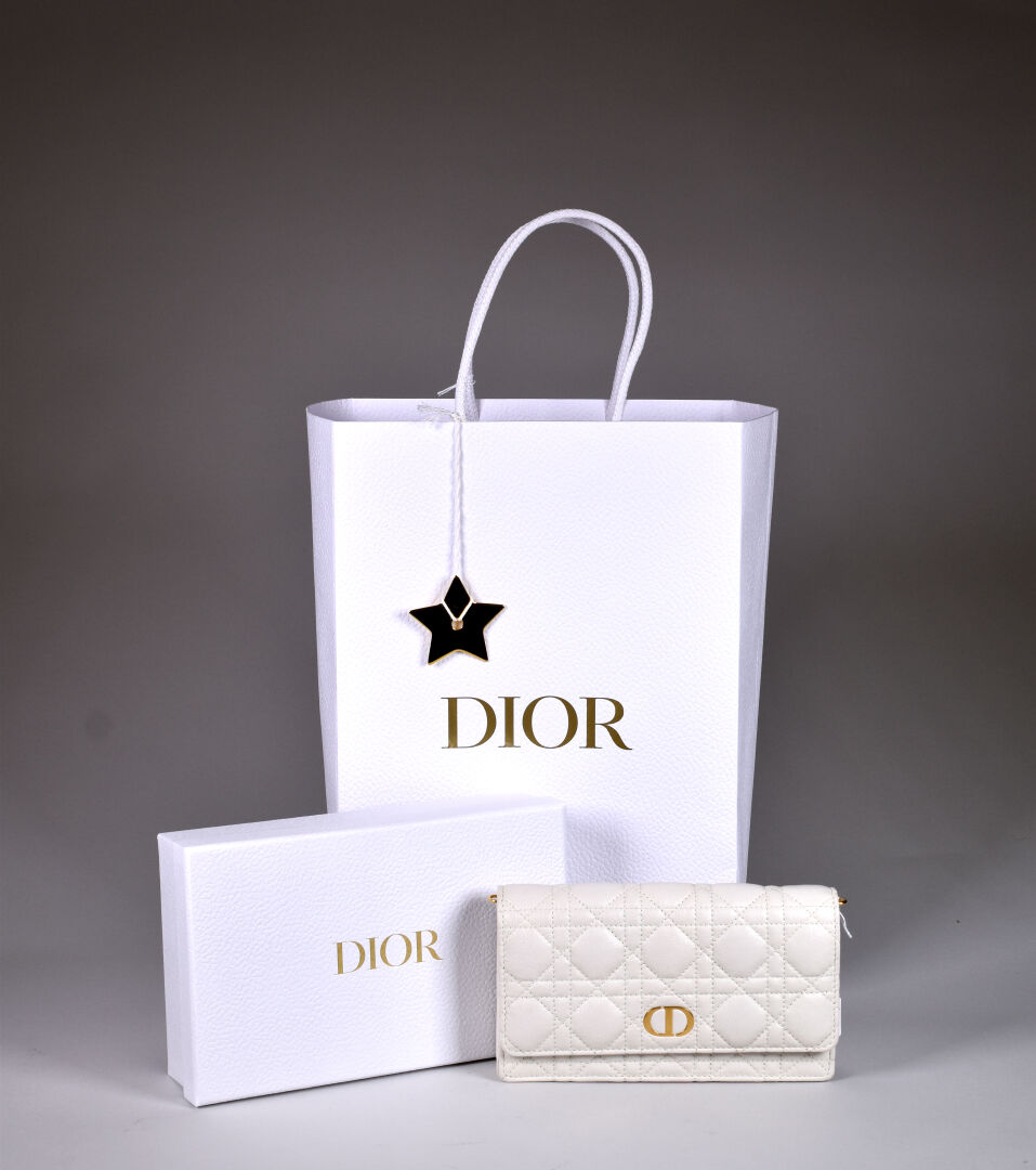 CHRISTIAN DIOR. Pochette en cuir matelassée surpiquée crème. Fermeture à rabat aimantée (aimants avec film plastique encore présent), intérieur cuir et tissu crème (quelques taches rouges à l’intérieur et à l’extérieur, petites usures, sans bandoulière). Avec Dustbag et boîte. Et sac en papier. Haut. : 12 cm – Larg. : 20,5 cm.