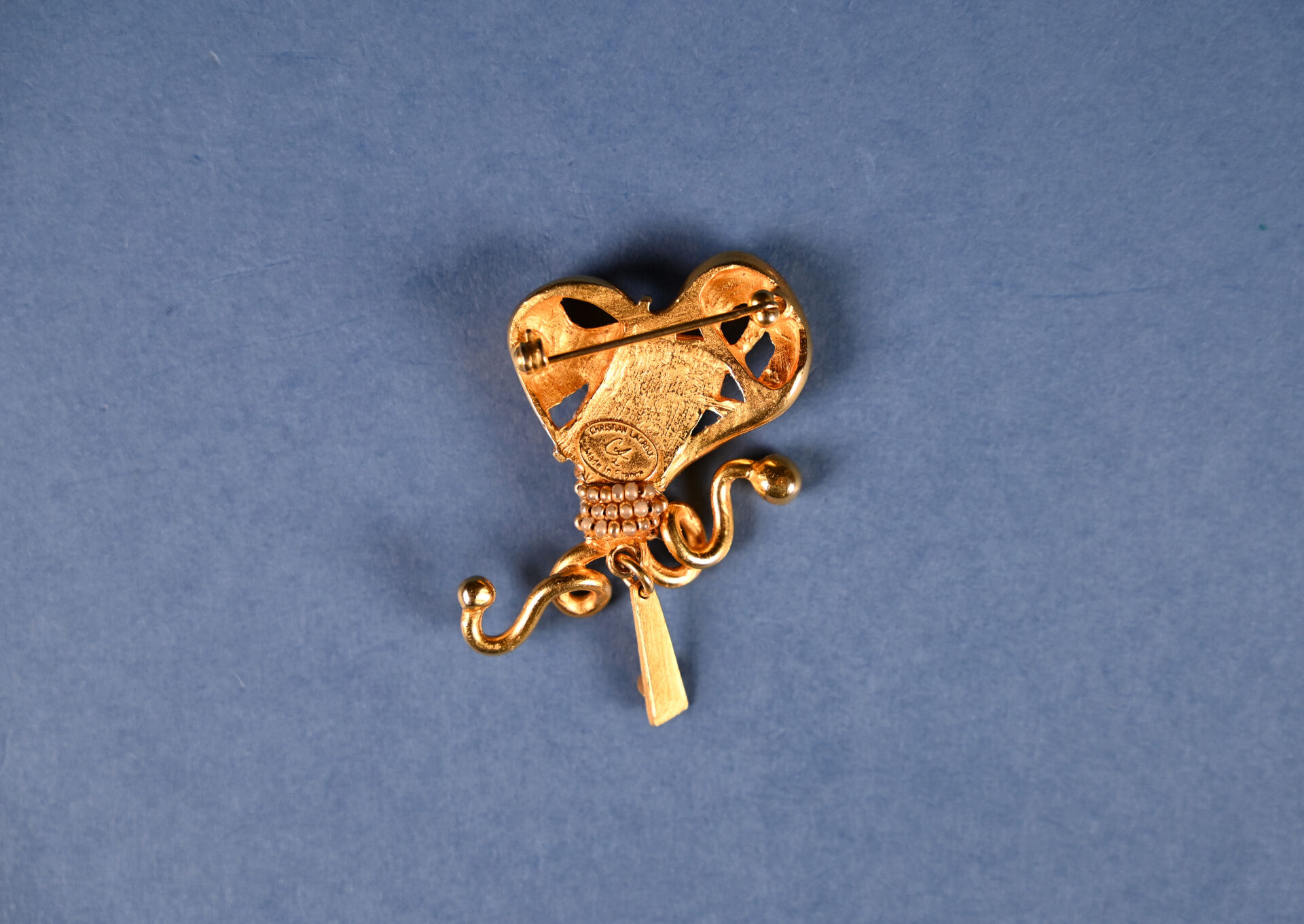 CHRISTIAN LACROIX. Broche de forme libre en métal doré. Signée. Haut. : 5,5 cm.
