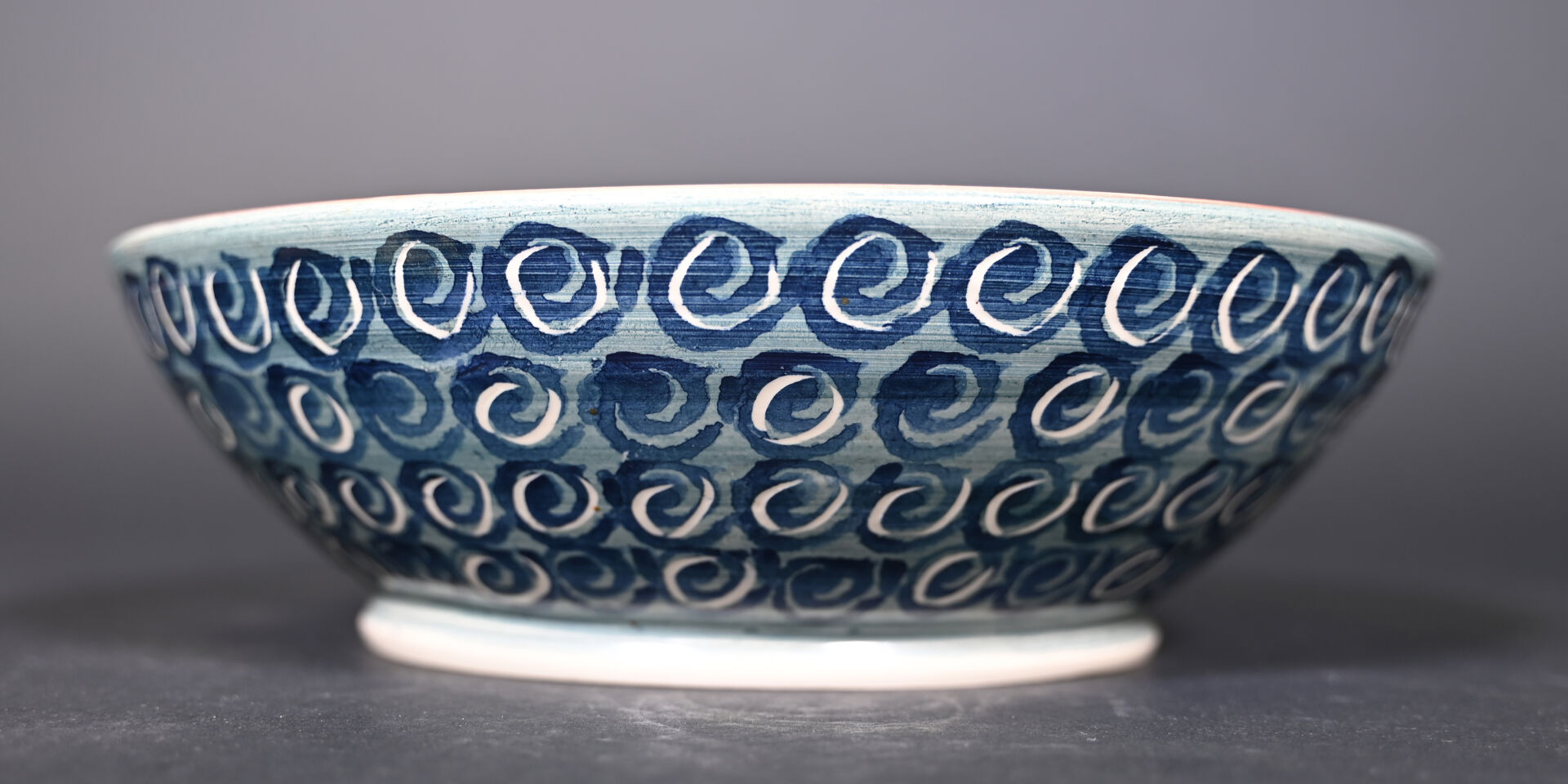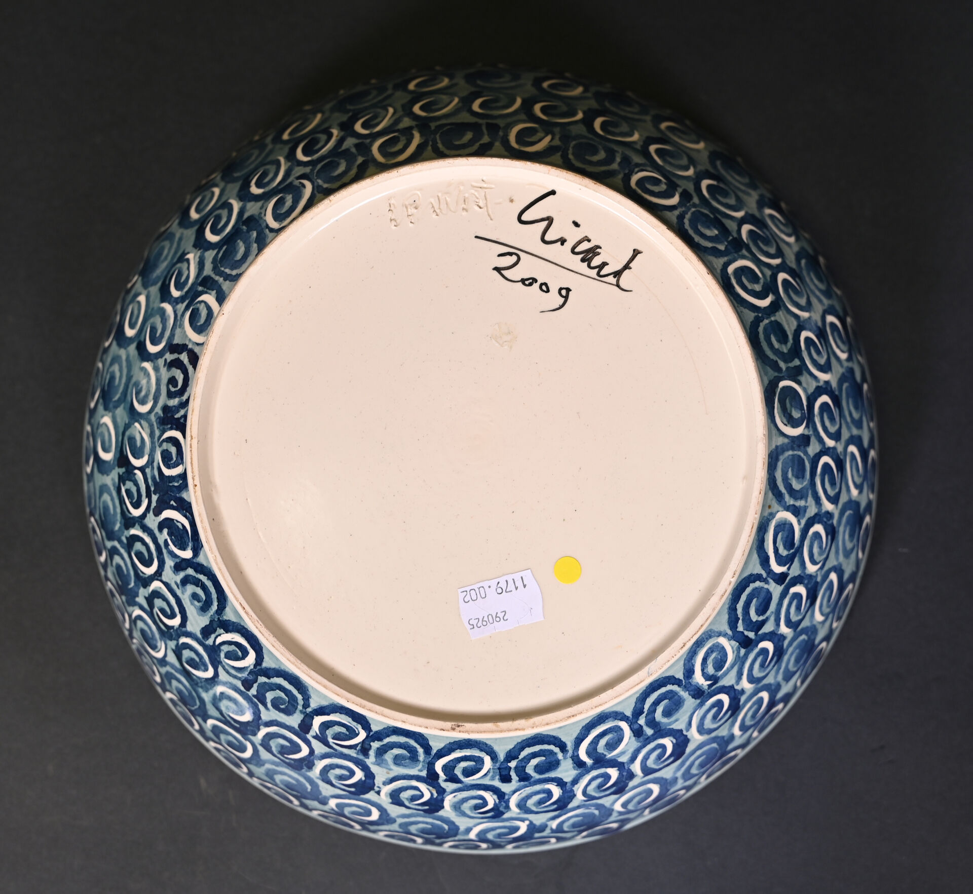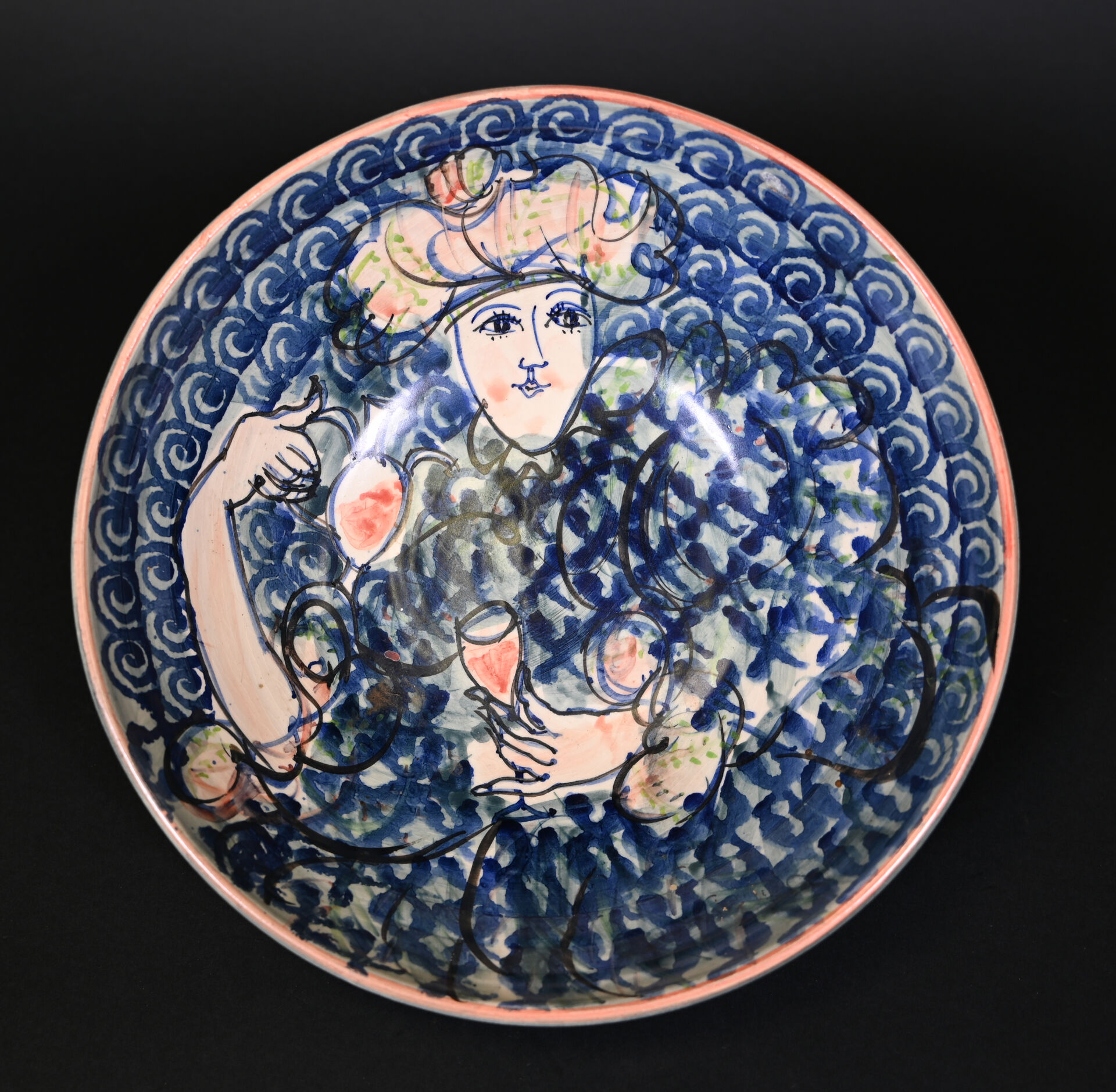 Christine RICARD (Née en 1950). Coupe en céramique ornée d’une femme se servant du vin sur un fond de spirales bleues. Marquée au dessous. Diam. : 29 cm.