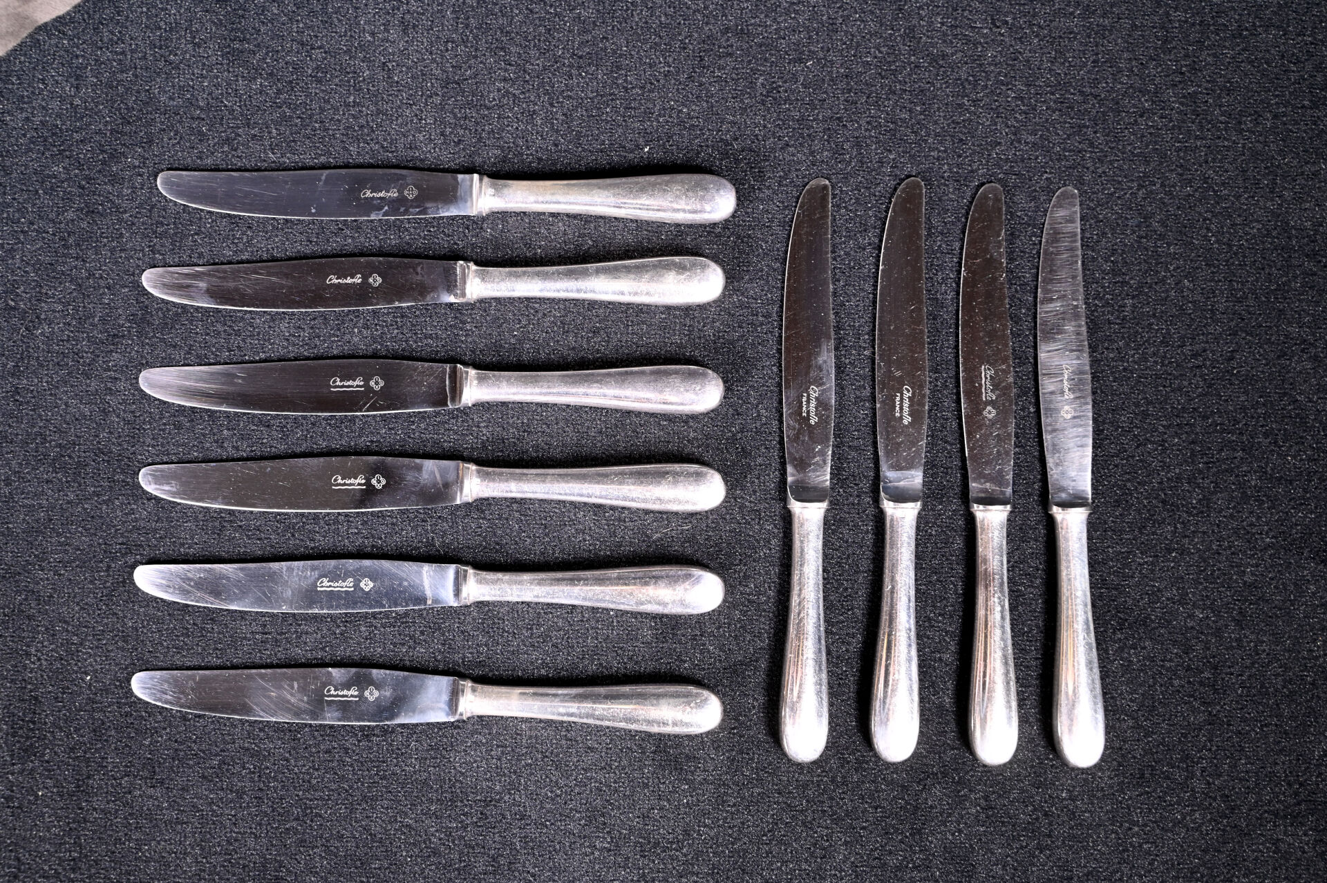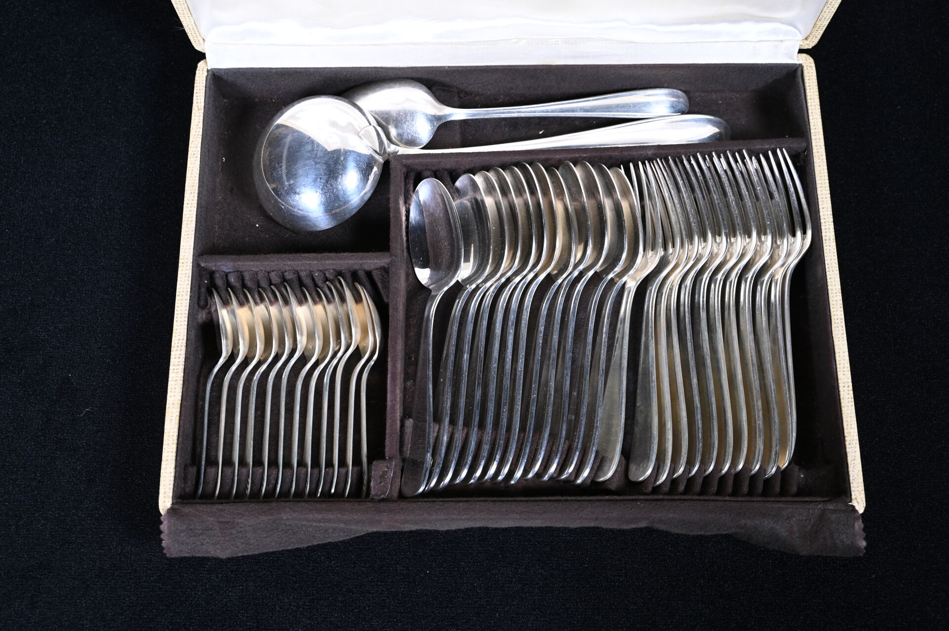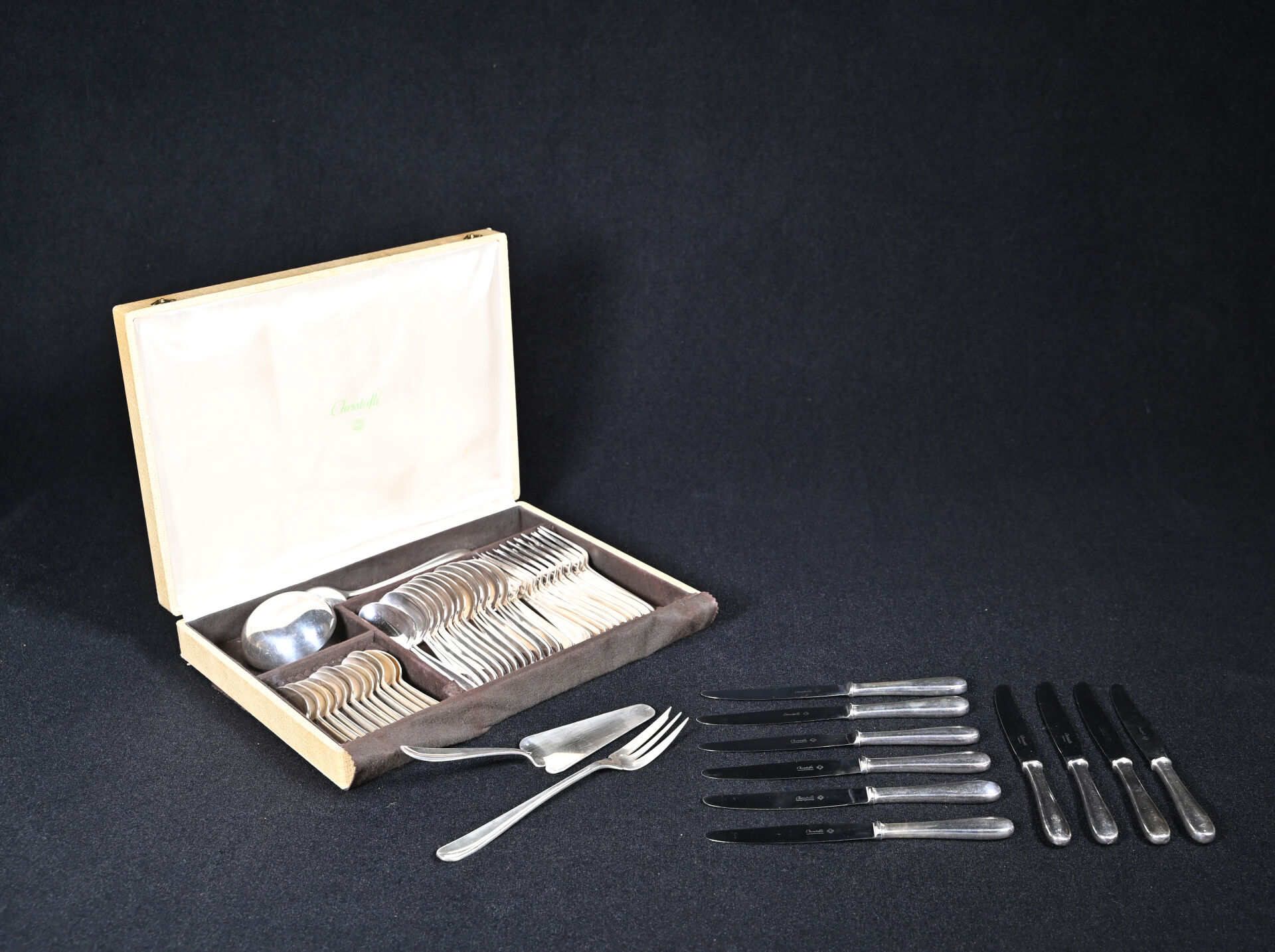 CHRISTOFLE. Ménagère en métal argenté comprenant 12 grands couverts, 12 cuillères à café, 10 grands couteaux, 1 louche, 1 cuillère à ragout, 1 pelle à tarte et 1 fourchette de service à poisson. Un coffret.