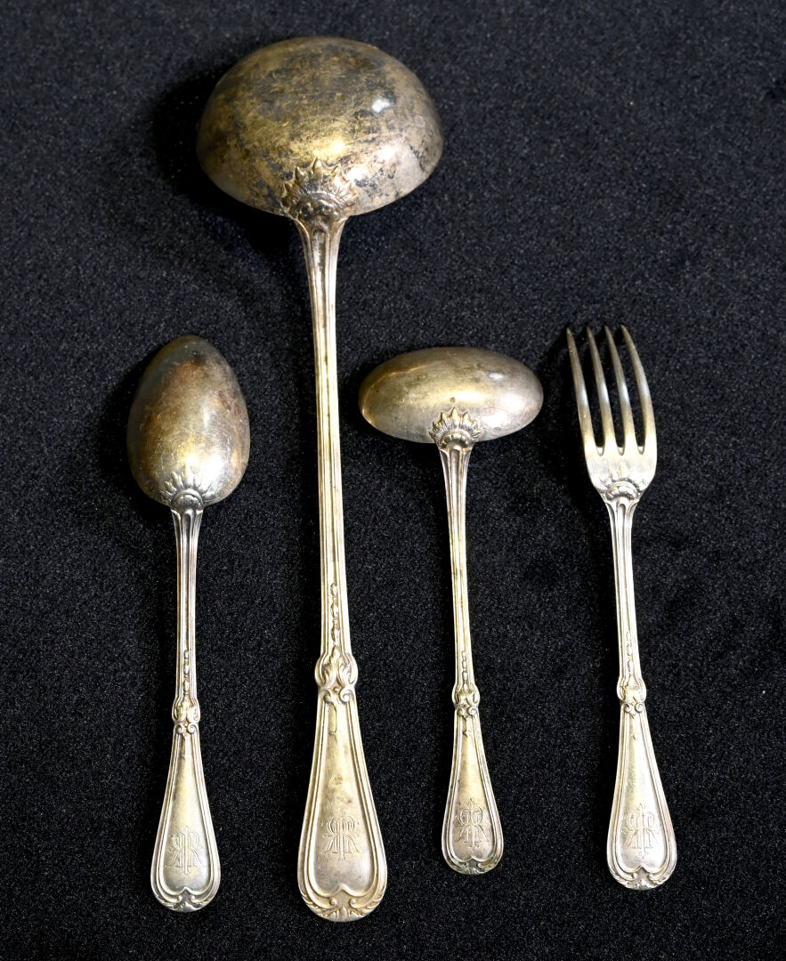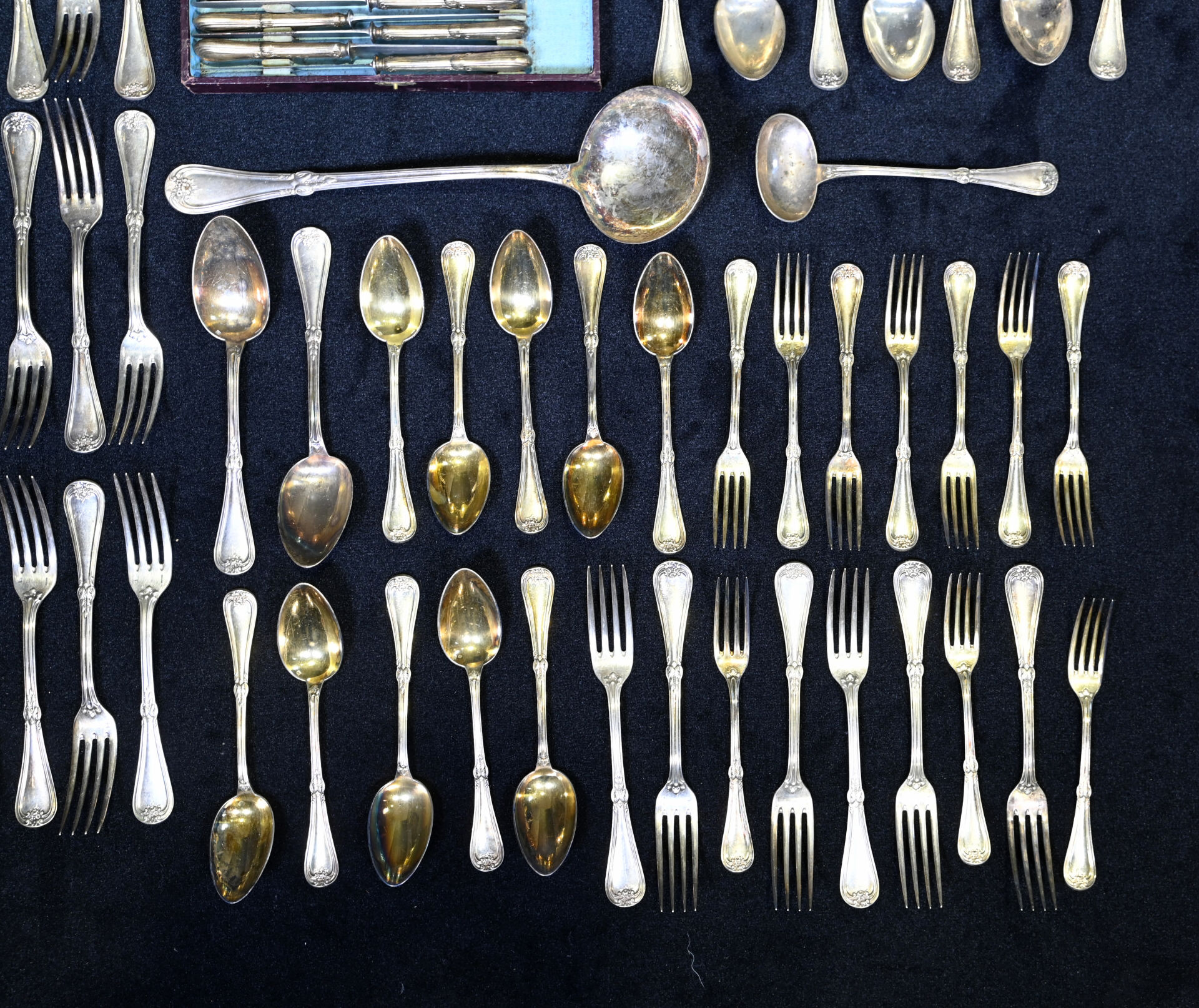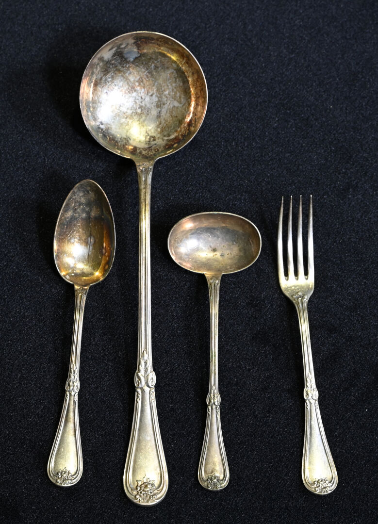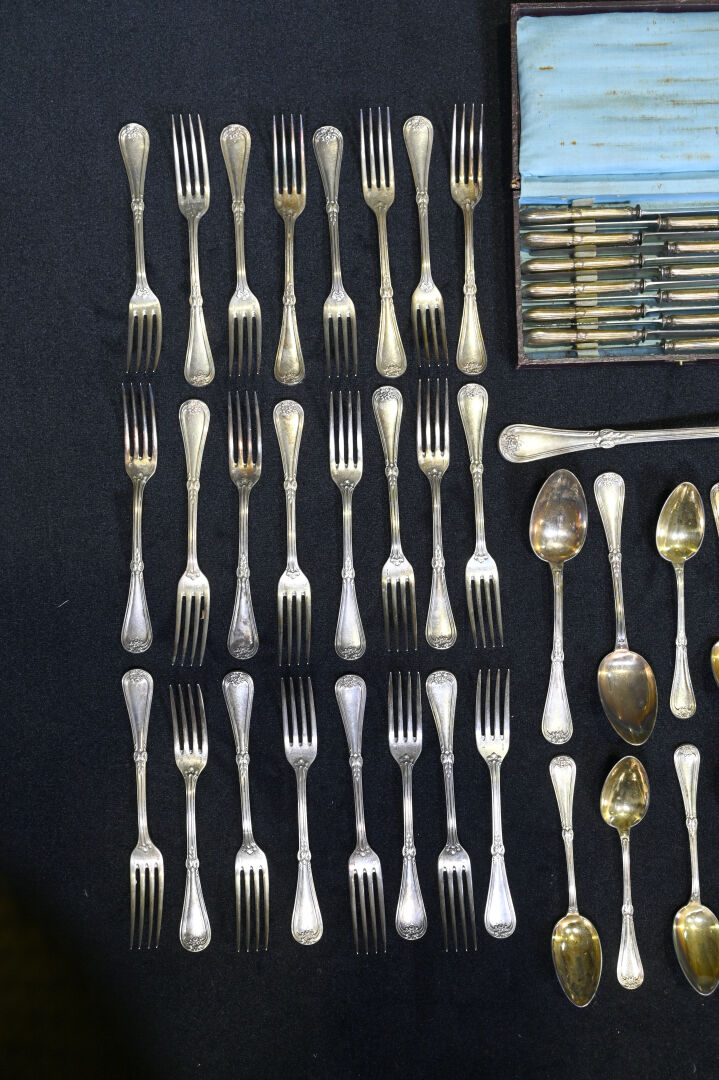 CHRISTOFLE. Partie de ménagère en métal argenté à décor de fleurs comprenant 9 grands couverts, 21 grandes fourchettes, 10 couverts à entremets, 1 louche et une cuillère à sauce. On joint des couteaux d’un service approchant (boite).