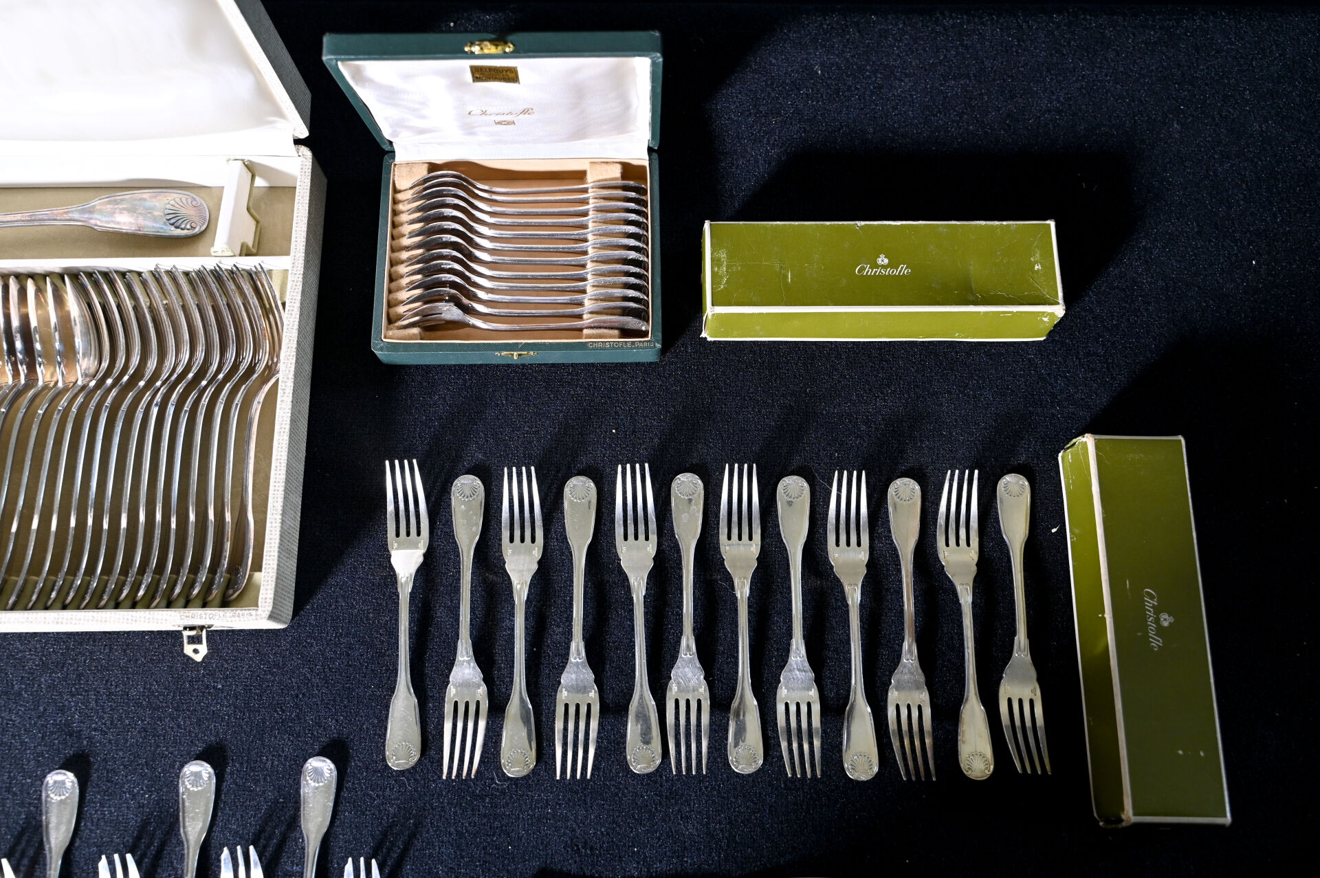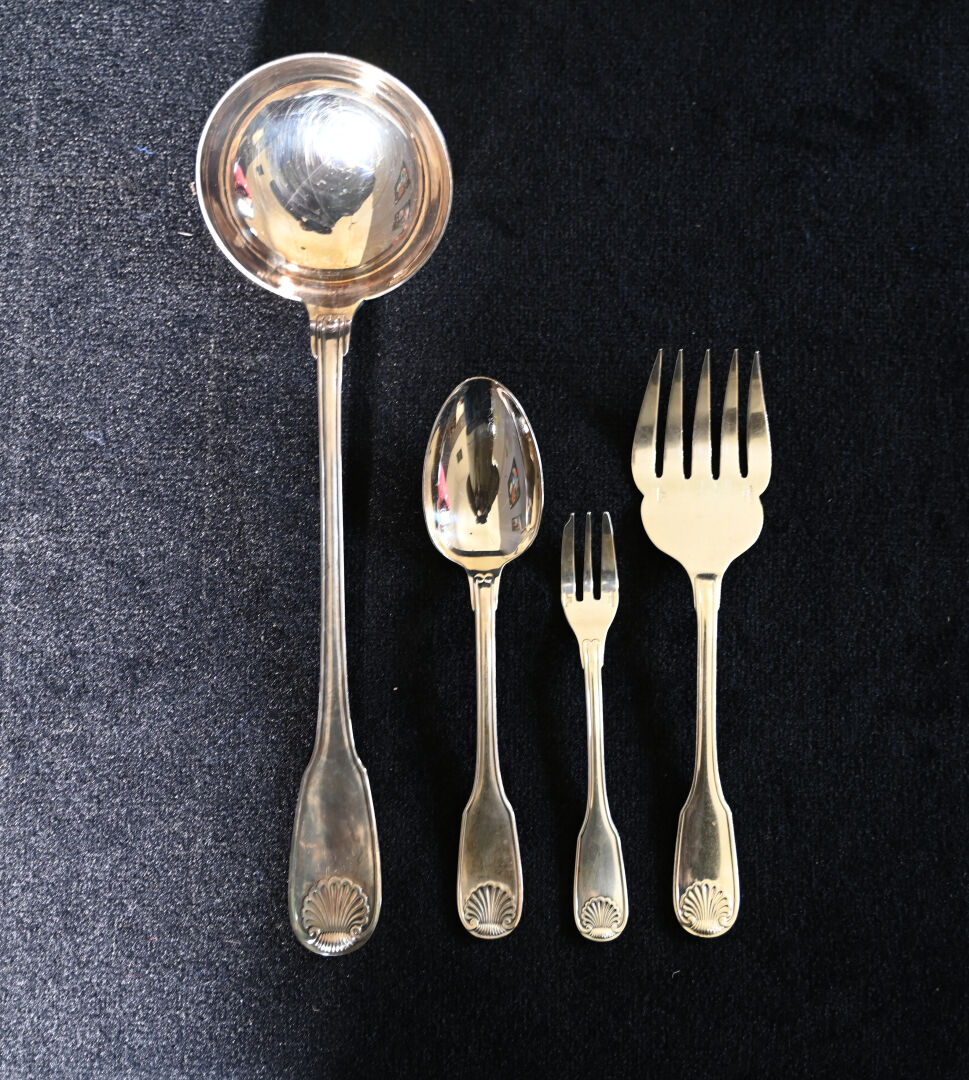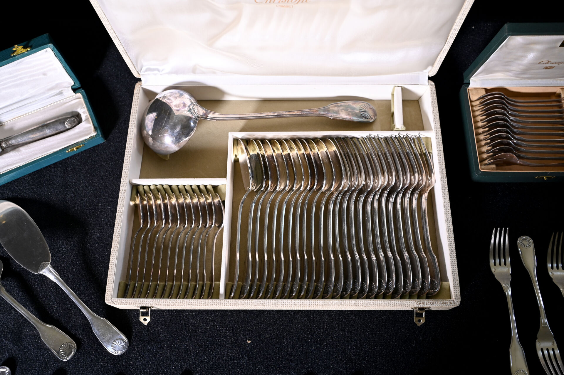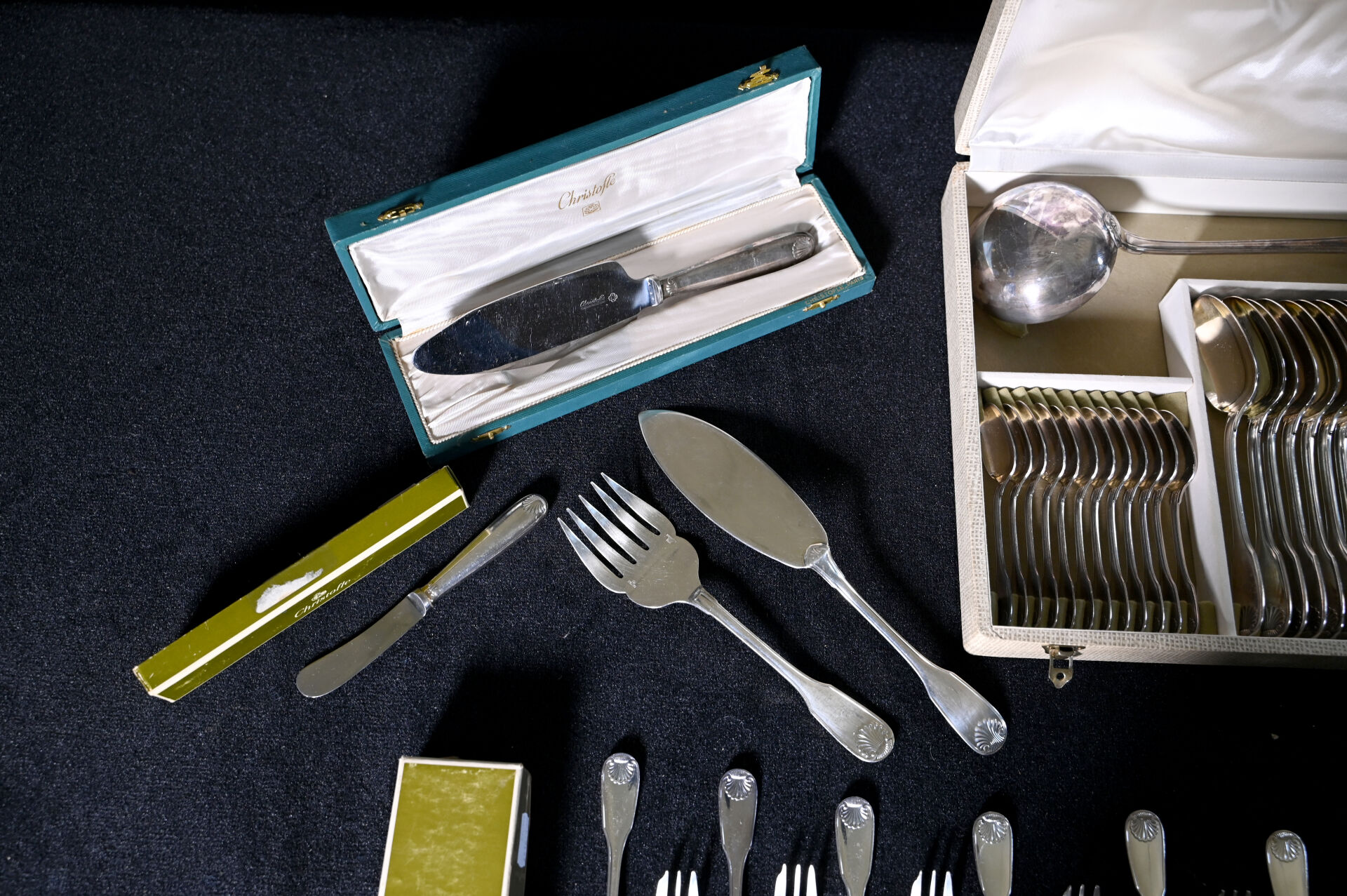 CHRISTOFLE. Partie de ménagère en métal argenté modèle Vendôme comprenant 12 grands couverts, 1 louche, 12 cuillères à dessert, 1 couteau à beurre, 1 pelle, 1 couvert de service à poisson, 12 fourchettes à huîtres, 12 couverts à poisson, 12 fourchettes à gâteaux. Quelques boites et écrins.