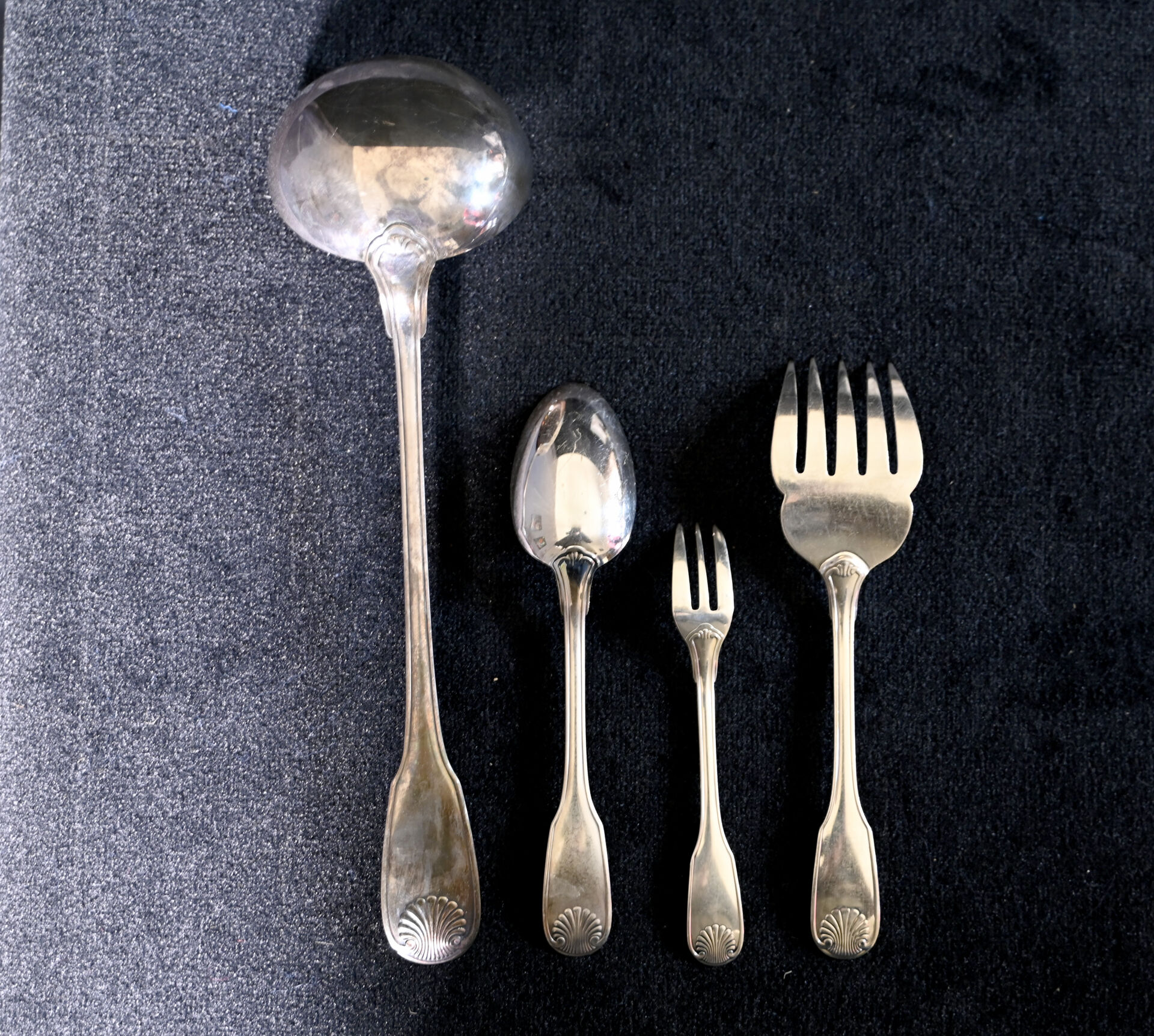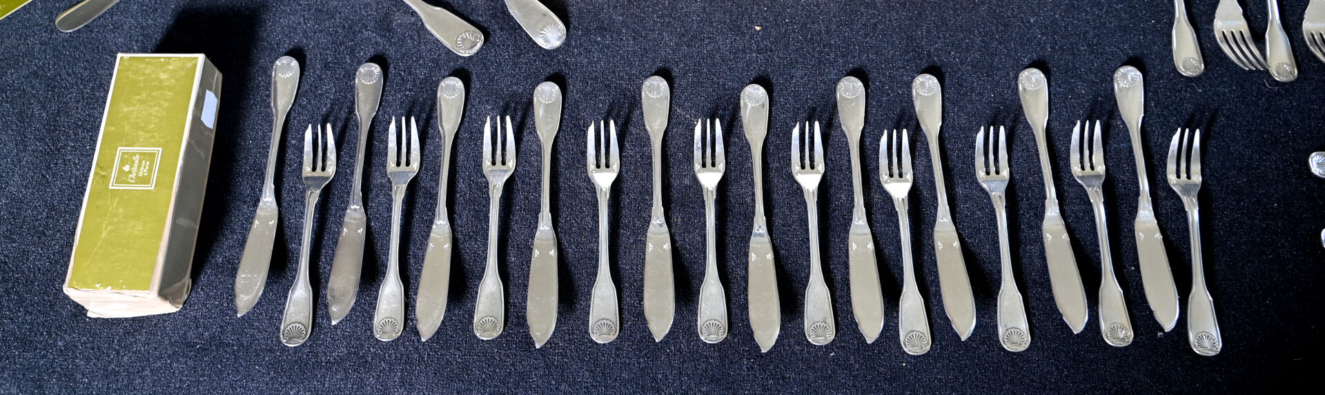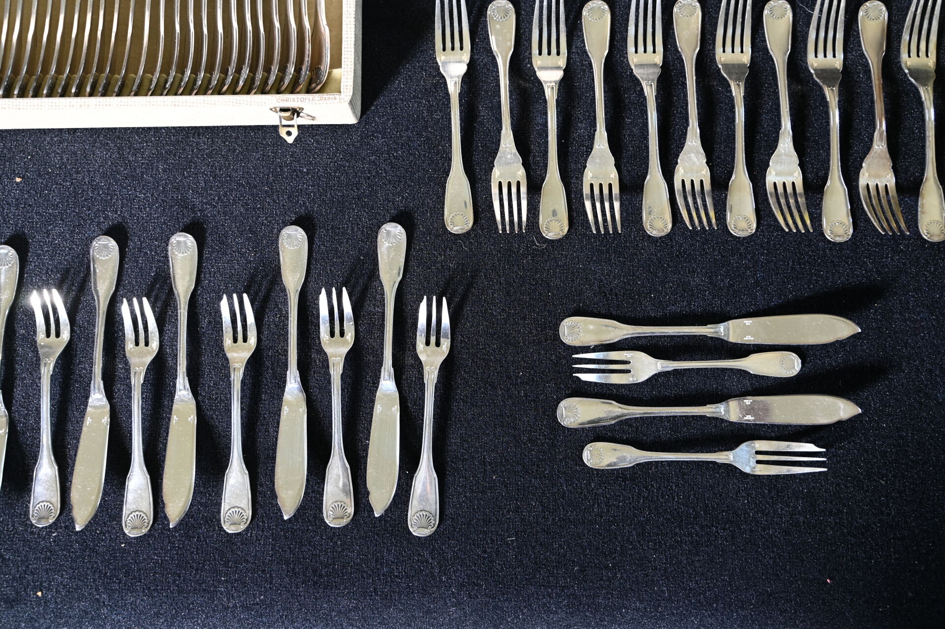 CHRISTOFLE. Partie de ménagère en métal argenté modèle Vendôme comprenant 12 grands couverts, 1 louche, 12 cuillères à dessert, 1 couteau à beurre, 1 pelle, 1 couvert de service à poisson, 12 fourchettes à huîtres, 12 couverts à poisson, 12 fourchettes à gâteaux. Quelques boites et écrins.