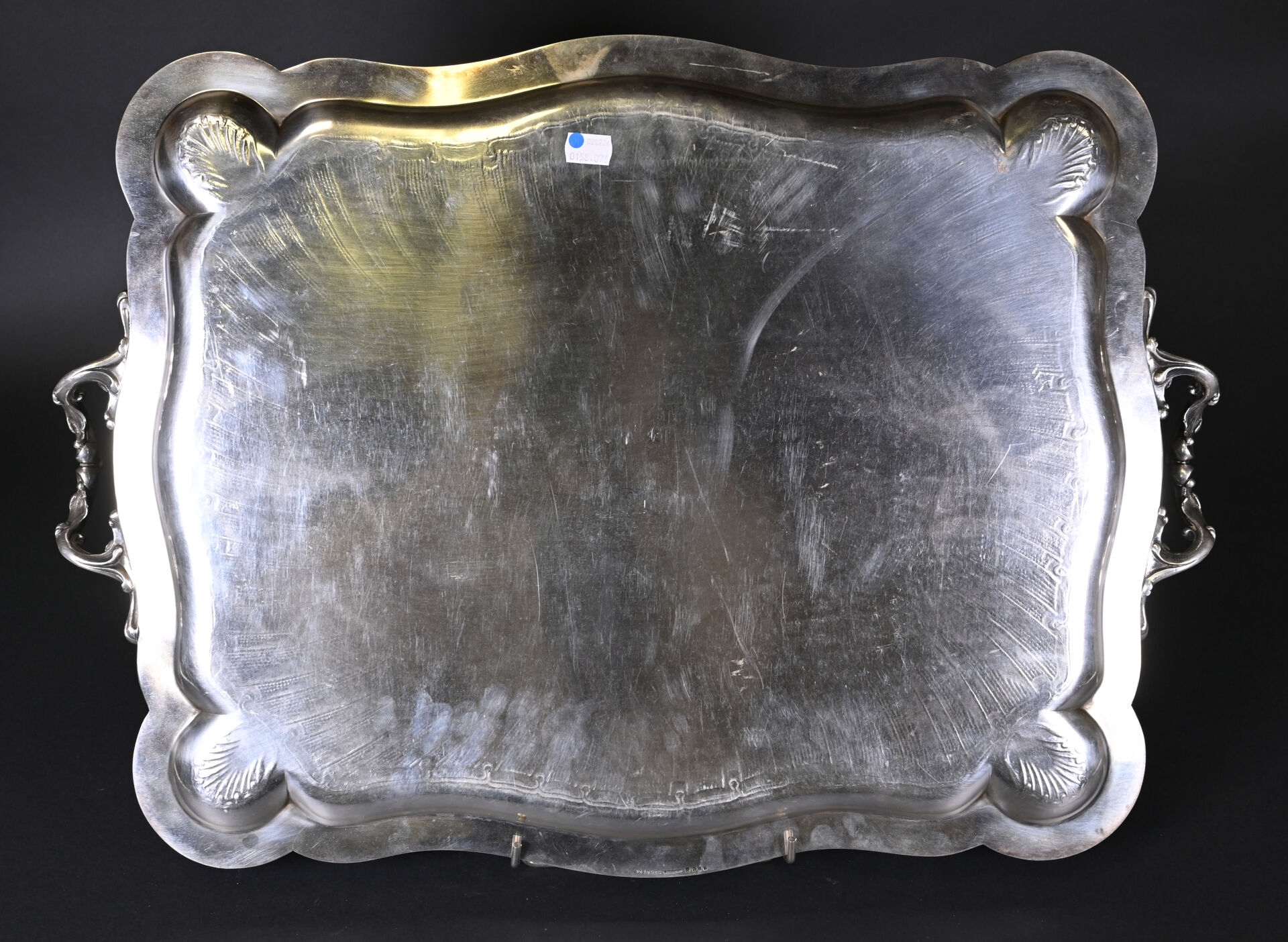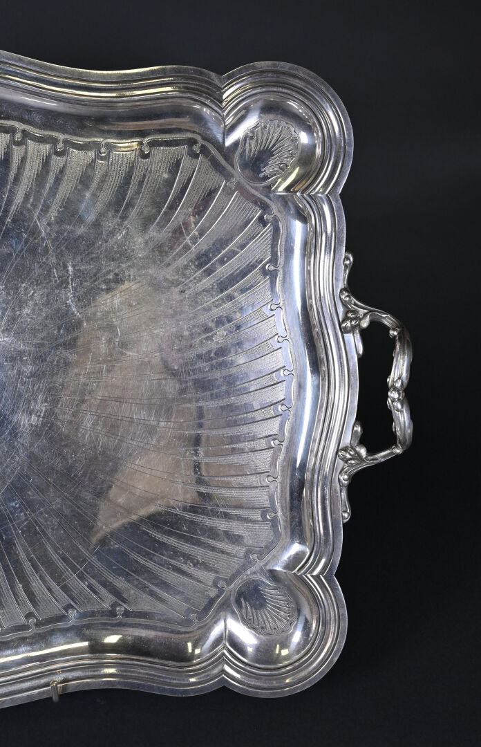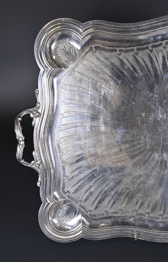 CHRISTOFLE. Plateau en métal argenté ciselé, la bordure violonée à filets, les angles à décor de coquilles (rayures d’usage). 67 x 48 cm.