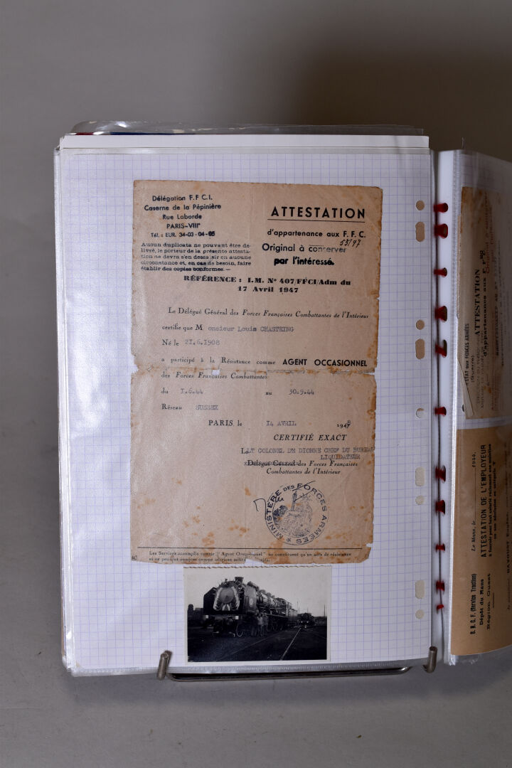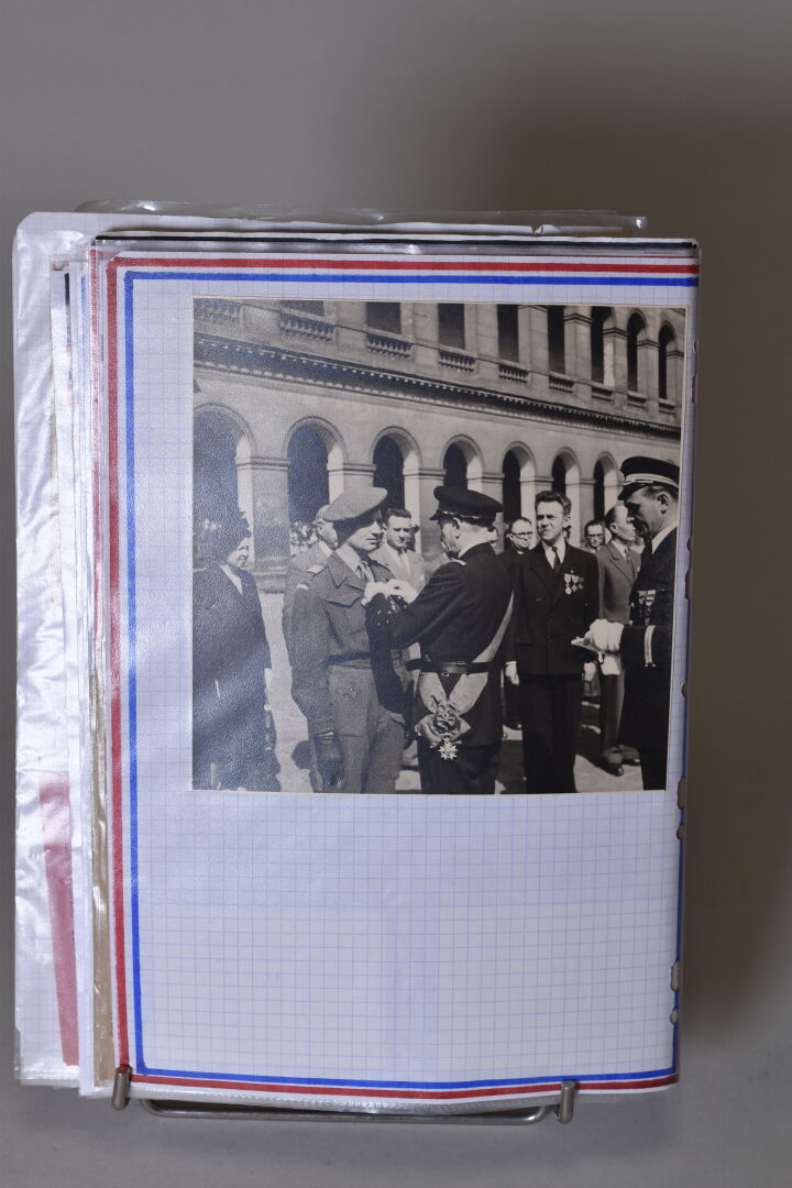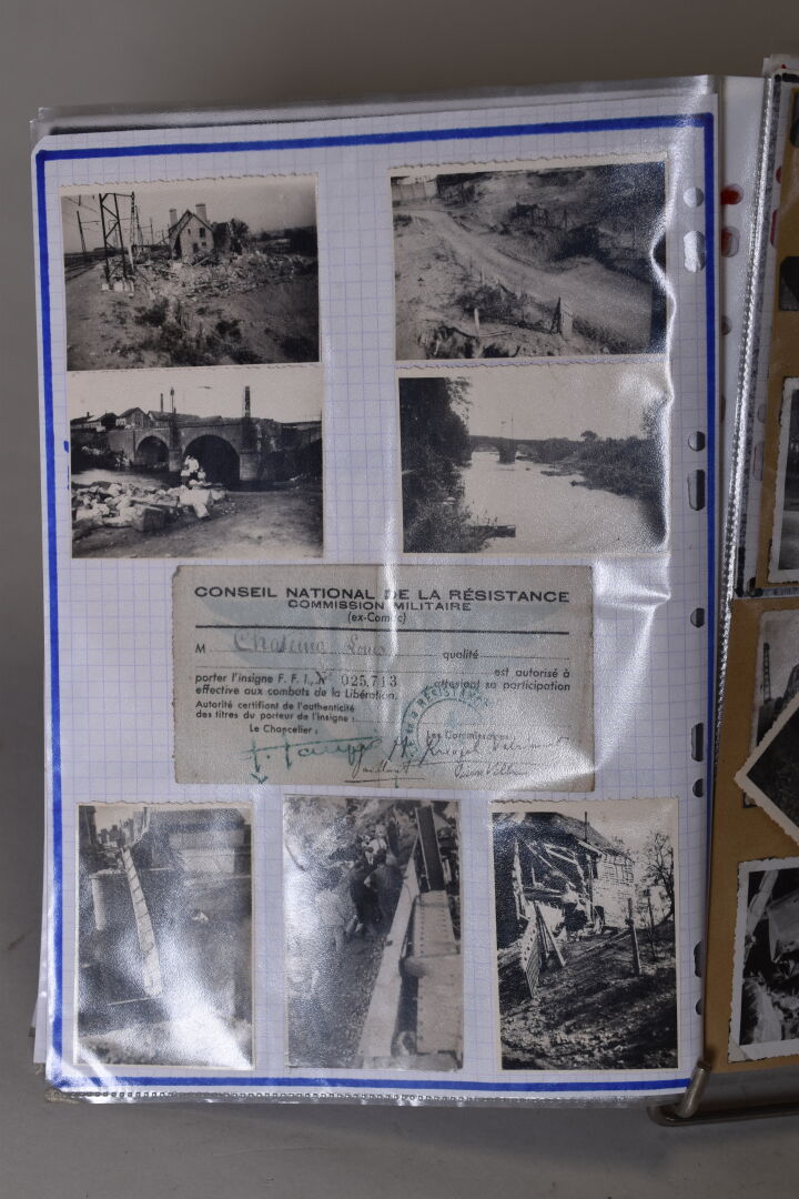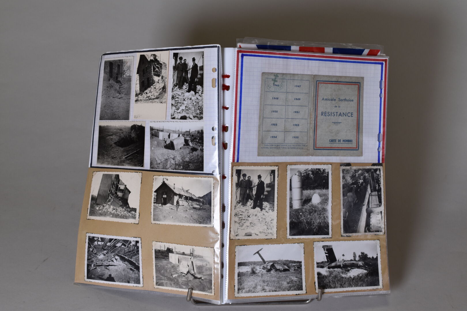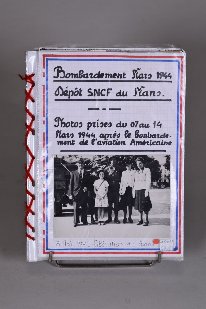 Classeur contenant de nombreuses photographies d’époque, décrivant la libération du Mans et le bombardement du dépôt SNCF de mars 1944. Quelques documents d’époque illustrent aussi ce document (cartes de l’Amical Sarthoise de la Résistance et divers). On y joint un brassard tricolore d’un membre du Conseil national de la Résistance (CNR).